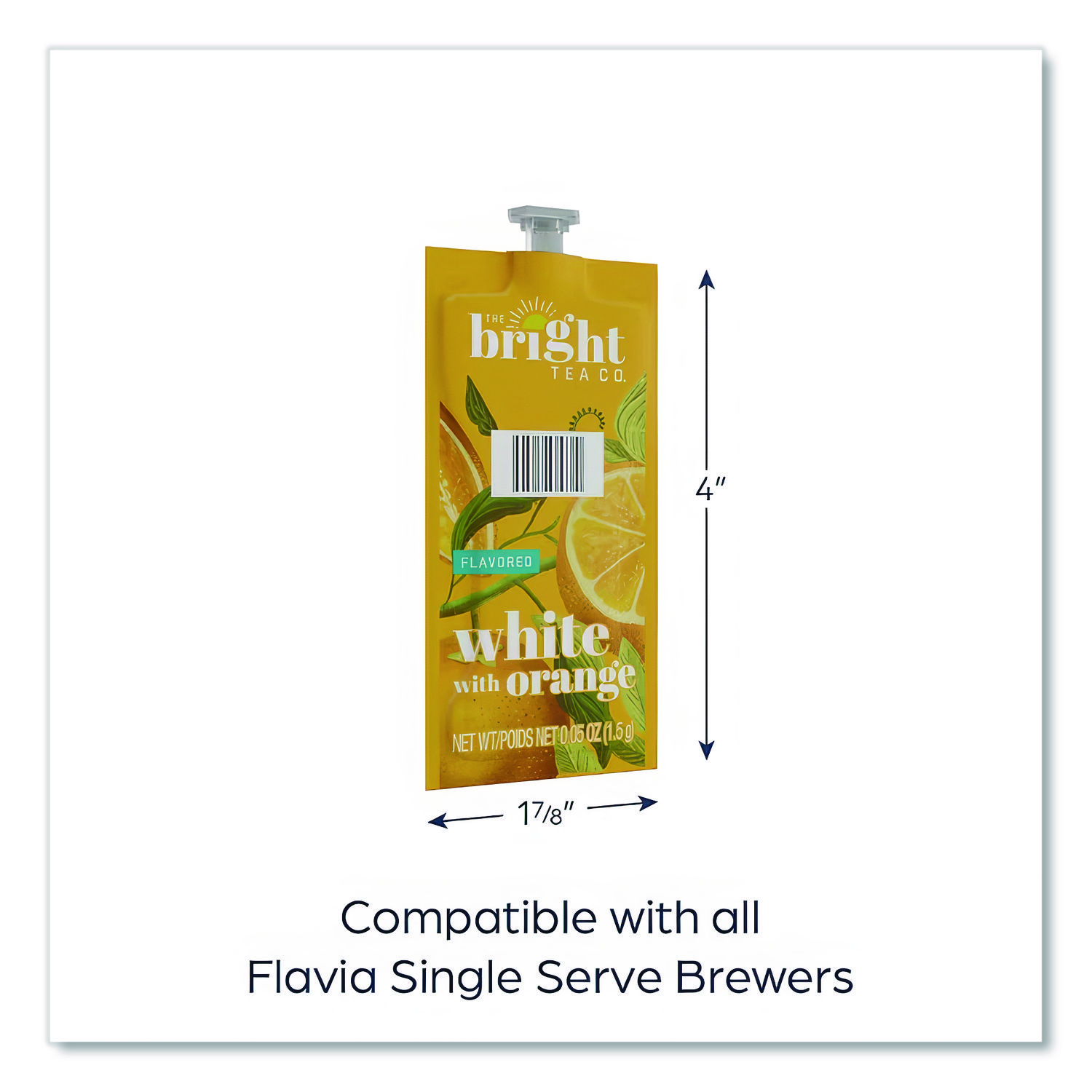 Each pod is filled with loose tea to ensure a perfect cup. Makes 8 to 12 oz, depending on personal preferences. Innovative design ensures that no flavors linger from one cup to the next. White with Orange—Light, fruity flavor crafted with the finest, all-natural ingredients including mandarin and navel orange peels. Beverage Type: Tea; Flavor: White with Orange; Product Packaging: Flavia® Freshpack Pod; Capacity (Weight): 0.05 oz.