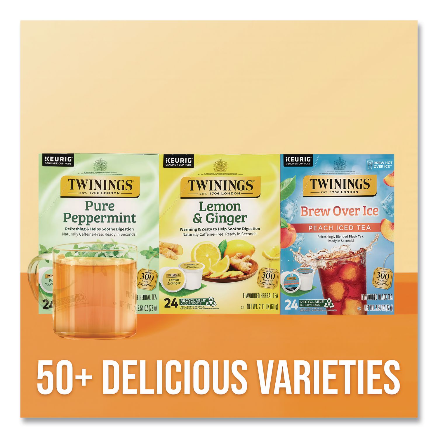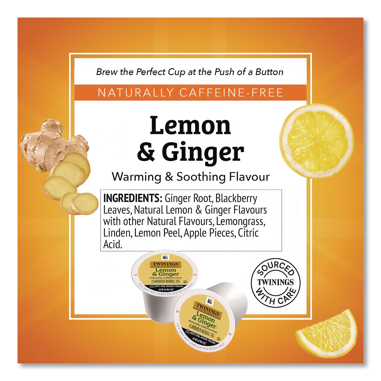 Tasty tea in convenient K-Cups® delivers consistent quality with the perfect water to tea ratio for optimal balance of flavor and aroma. Brews in less than a minute. Easy to use K-Cups® are designed for use with the Keurig® K-Cup® brewing system. Beverage Type: Herbal Tea; Flavor: Lemon and Ginger; Product Packaging: K-Cup®; Volume Capacity: 0.11 oz.