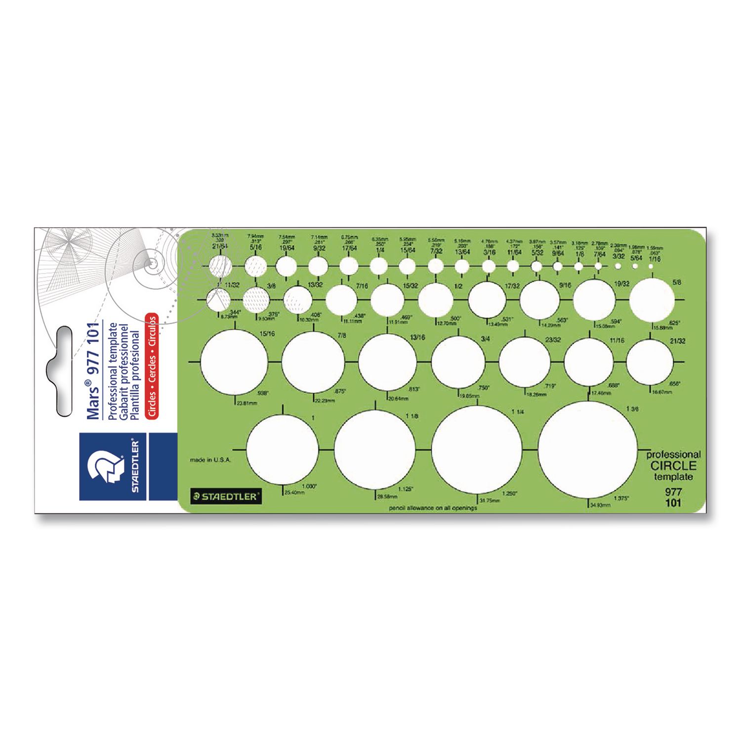 Transparent green plastic is easy to see through and use. Matte finish on one side reduces glare. Cut-out identification and ruler scales are printed in easy-to-read black ink. Designed for use with a 0.5mm pencil lead. Color(s): Green; Material(s): Plastic; Length: 7.25″; Width: 4″.