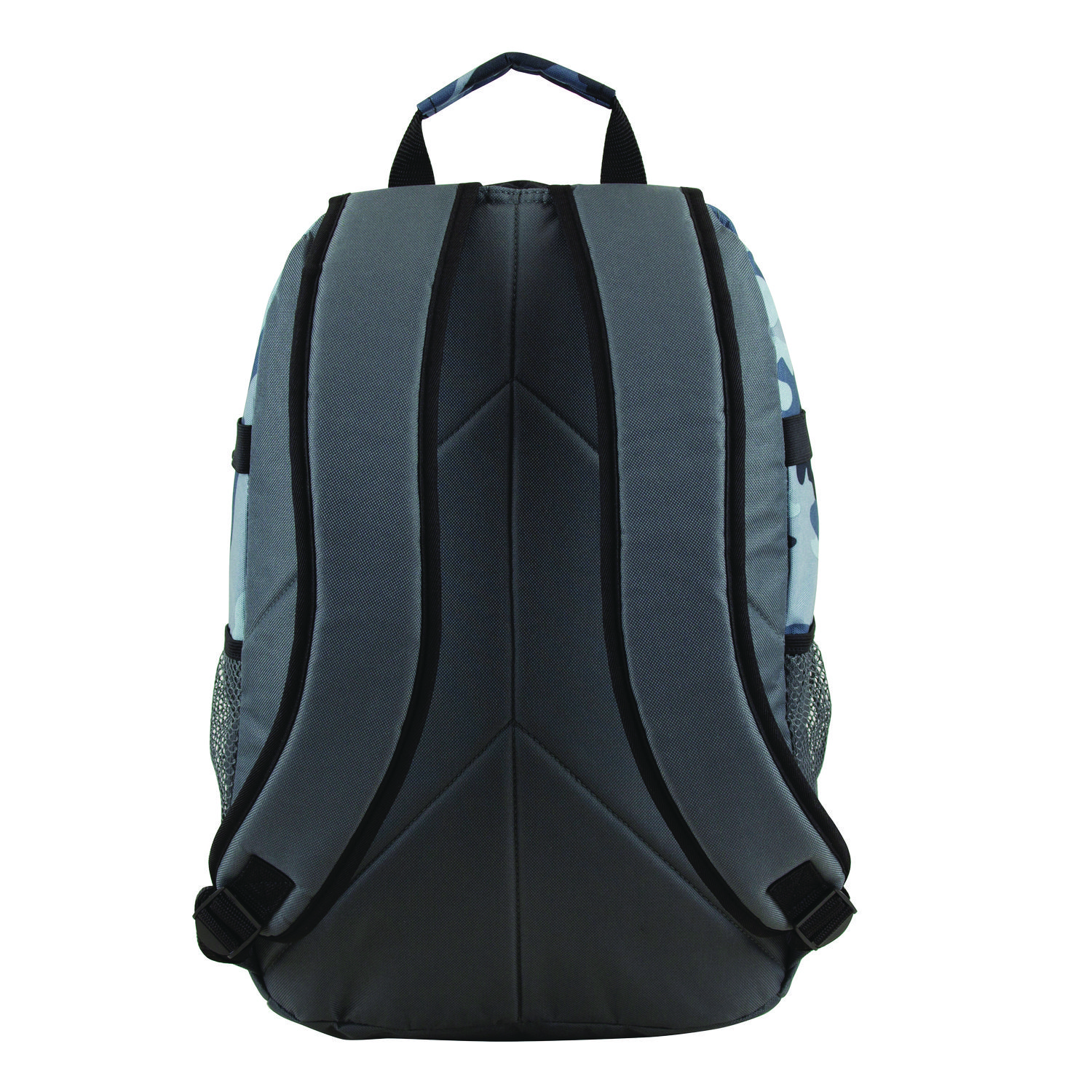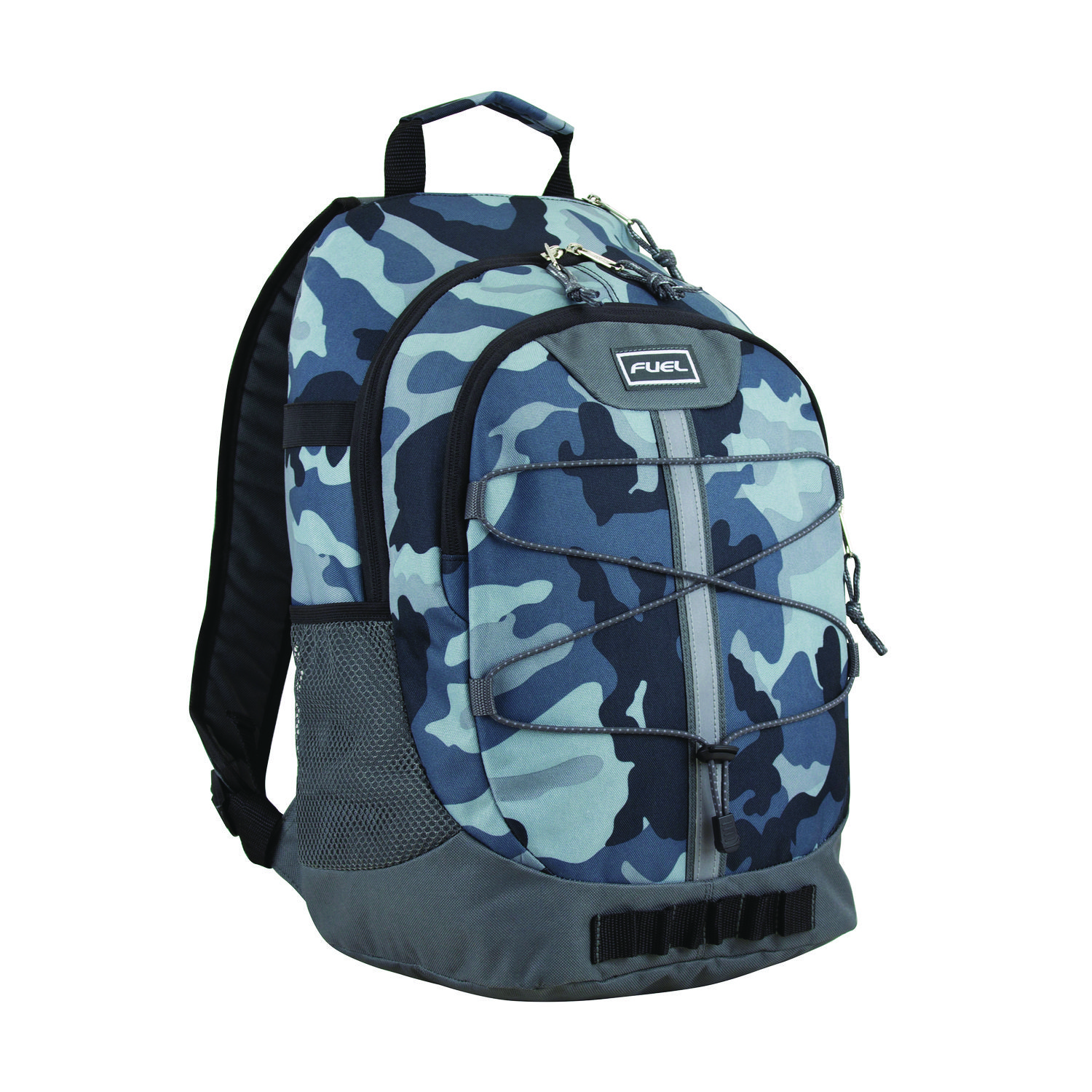 This backpack features a large double-zip compartment with padded laptop sleeve, smaller zip compartment, quick-access felt-lined electronic/sunglasses pocket, twin side water bottle pockets, front bungee with reflective safety strip, daisy chain accents, ergo foam padded back, and shoulder straps. The water-resistant heavy-duty 420D nylon construction holds up to the elements, making this durable backpack perfect for school, sports and any outdoor activities. For Use With: Books; School Supplies; Color(s): Midnight Camo; Color Family: Gray; Material(s): Nylon.