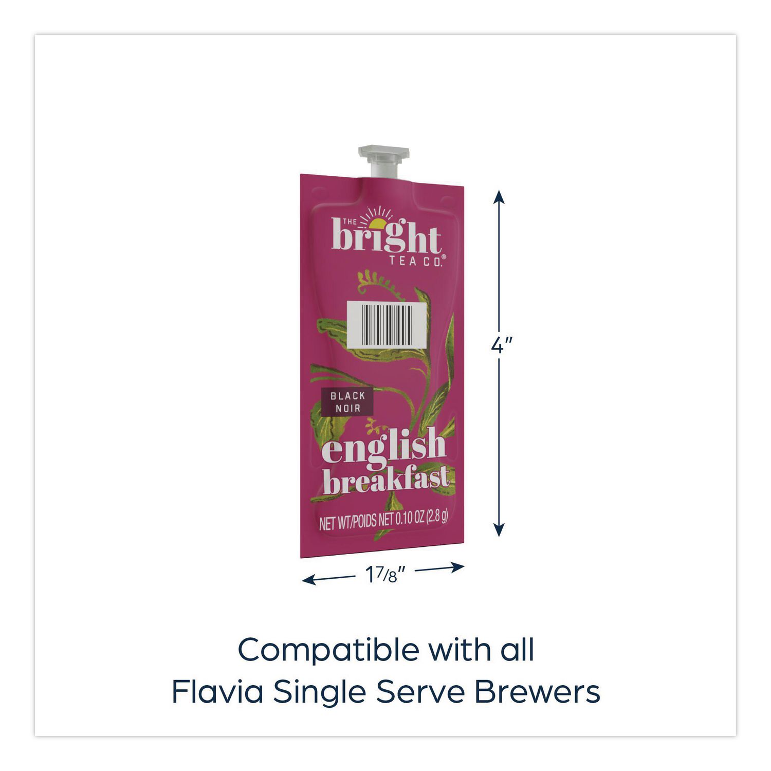 The Bright Tea Co.® English Breakfast Tea Freshpack offers a robust taste with notes of caramelized sugar, malty flavor and balanced astringency. These teas from the Assam river valley in North Eastern India provide a flavor profile strong enough to stand up to milk and sugar, but flavorful enough to be enjoyed without. Our brewing process, where nothing touches the ingredients other than hot water, ensures your drink does not taste like previous brews. Compatible with FLAVIA® single-serve brewers. For single-serve sustainability, innovative pouches are 100 percent recyclable through Terracycle. Beverage Type: Tea; Flavor: English Breakfast; Product Packaging: Pouch; Capacity (Weight): 0.1 oz.