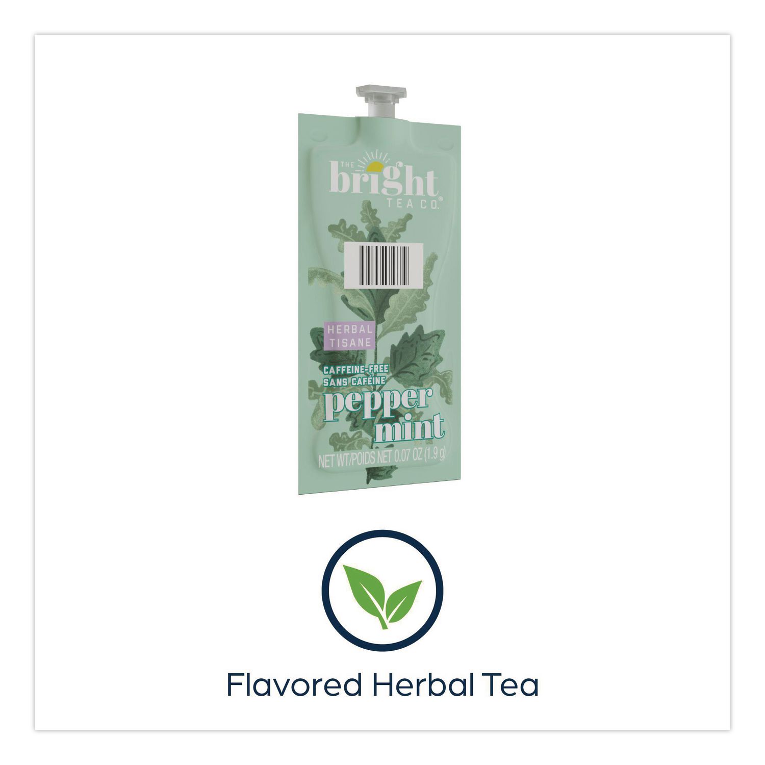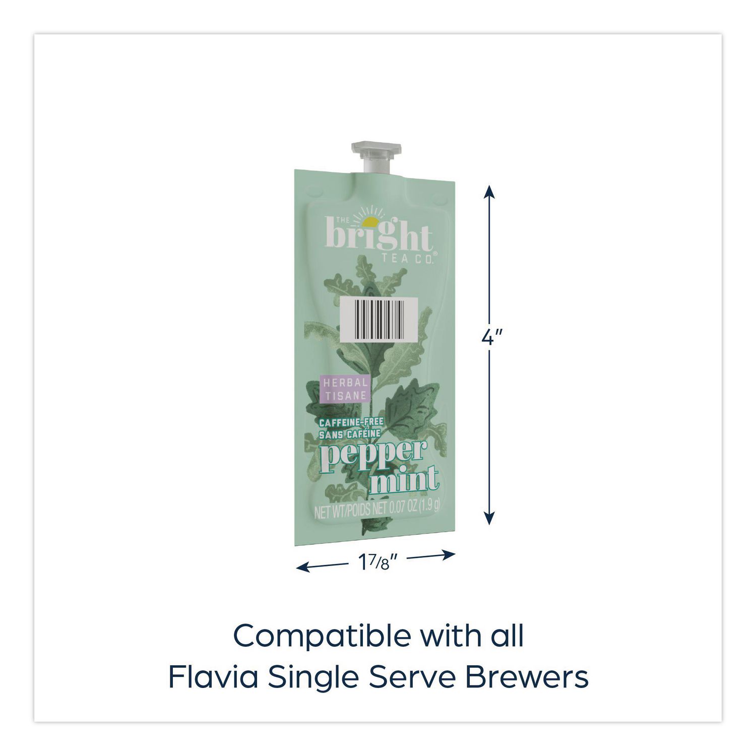 The Bright Tea Co.® Peppermint Herbal Tea Freshpack offers full, rich peppermint flavor and chocolatey notes. Our brewing process, where nothing touches the ingredients other than hot water, ensures your drink does not taste like previous brews. Compatible with FLAVIA® single-serve brewers. For single-serve sustainability, innovative pouches are 100 percent recyclable through Terracycle. Beverage Type: Tea; Flavor: Peppermint; Product Packaging: Pouch; Capacity (Weight): 0.07 oz.