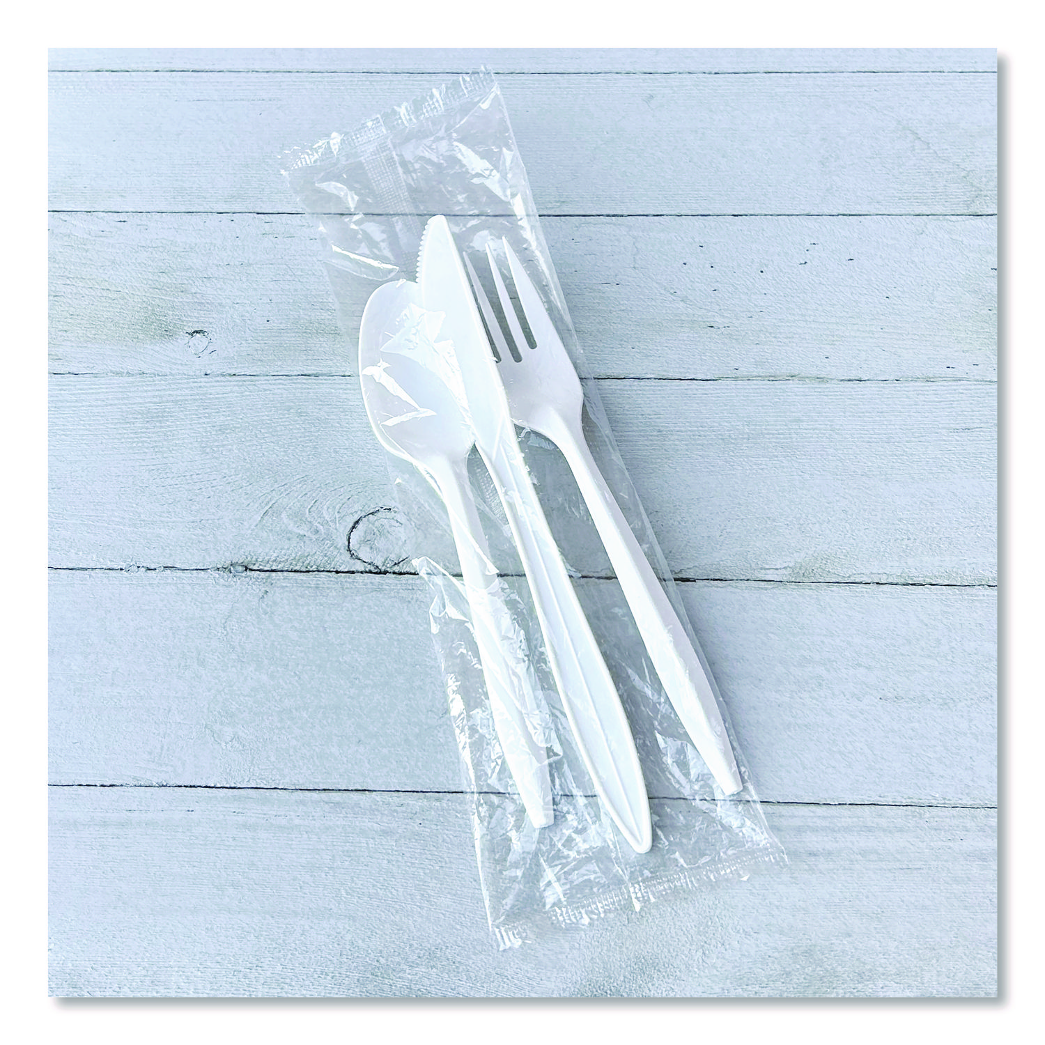 Serve virtually any meal with this cutlery kit. Each pre-packaged, cutlery wrapped kit contains a medium weight plastic fork, spoon, and knife. The convenient kits make set-up for an event or packing a to-go meal quick and easy. Individually packaged for convenience and to ensure utensils remain sanitary, even after handling. Perfect for outdoor gatherings, large parties, and take-out meals. Utensils Type: Fork; Knife; Spoon; Material Type: Plastic; Material(s): Polystyrene; Color(s): White.