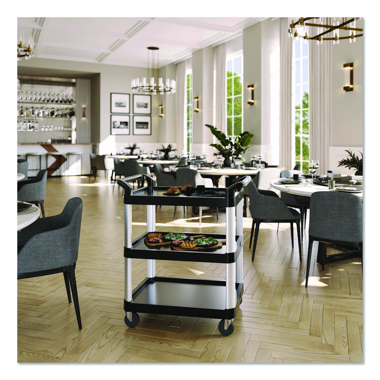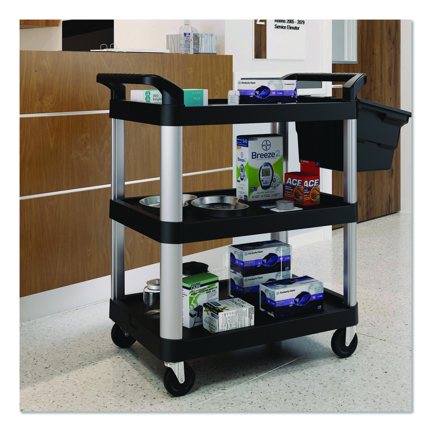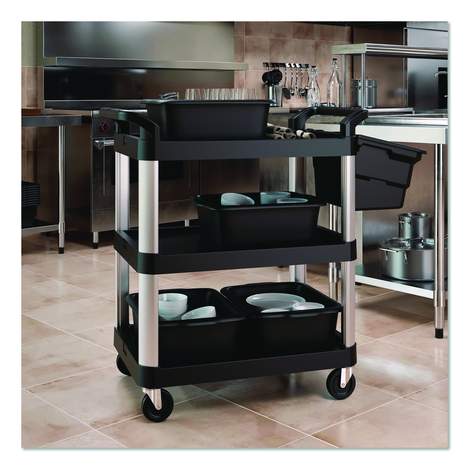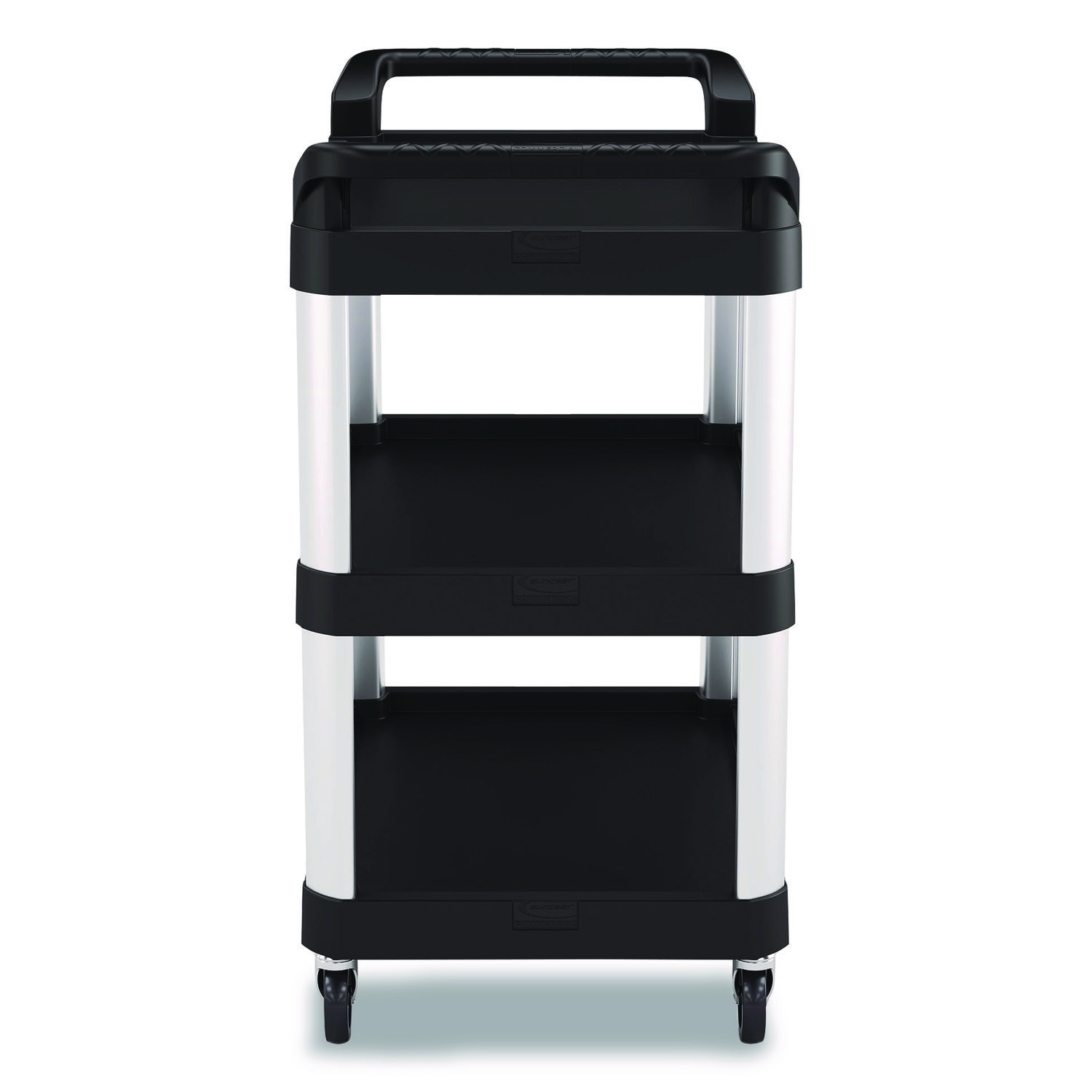 The three-shelf utility cart by Suncast Commercial® is perfect for schools, hotels and many other businesses. With polypropylene shelves and aluminum supports, this sturdy service cart was manufactured to hold up to a total of 300 lbs. The four non-marring casters provide a smooth ride when transporting from room to room. Material(s): Aluminum; Polypropylene; Overall Material Type: Metal; Plastic; Color(s): Black; Color Family: Black.