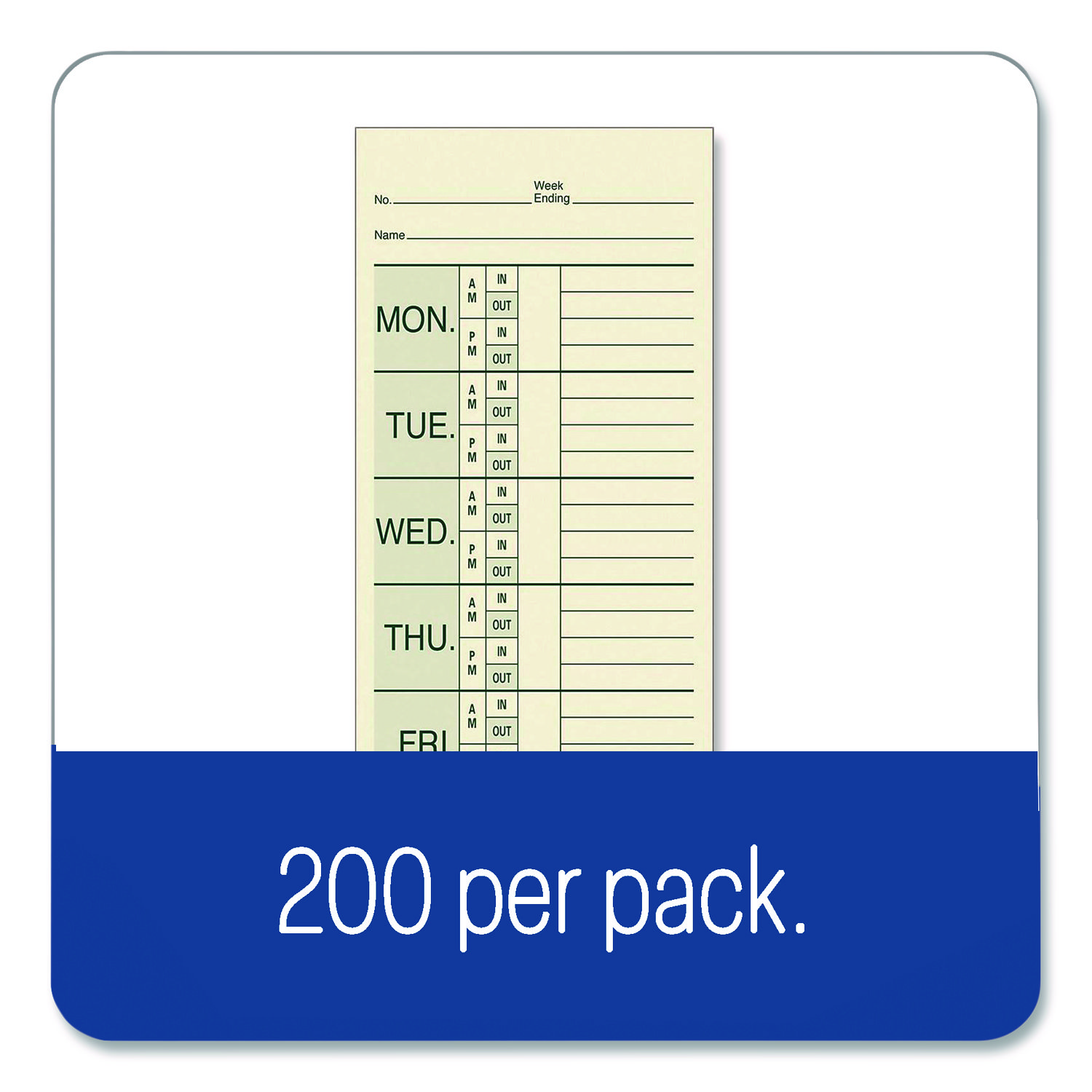 Enhance your time clock system with these double-sided time cards. Made with durable manila stock, these cards stand up well to the rigors of daily wear and tear. These double-sided timecards are a convenient way for your workers to take responsibility for recording their own ins and outs. Each card has a place to record regular hours, overtimes and any tax deductions. This ensures you’ll have clear and accurate records. Size: 3.38 x 9; Time Period: Weekly; Printing Sides: Two Sides; Card Quantity: 200.