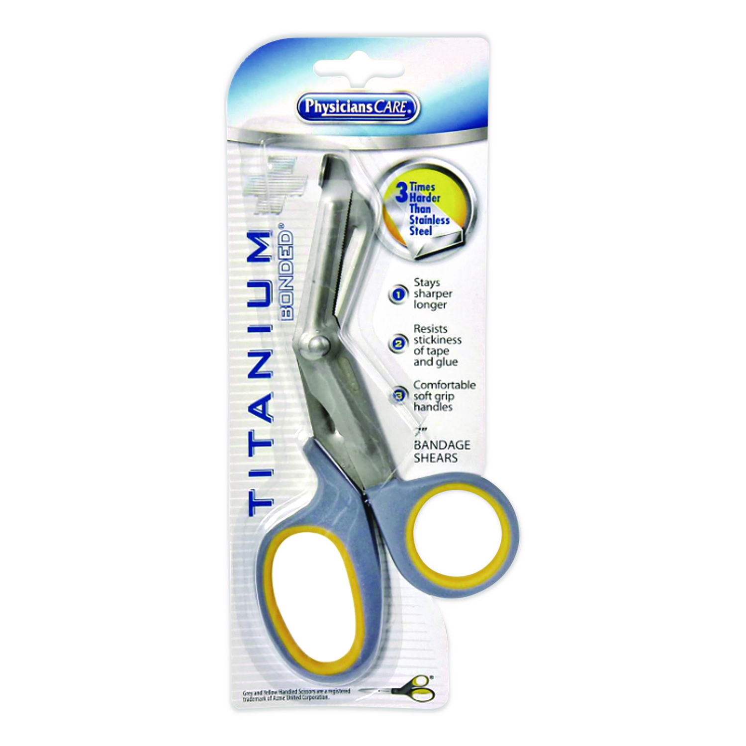 Titanium-Bonded Angled Medical Shears, 7″ Long, 3″ Cut Length, Crane-Style Gray/Yellow Handle