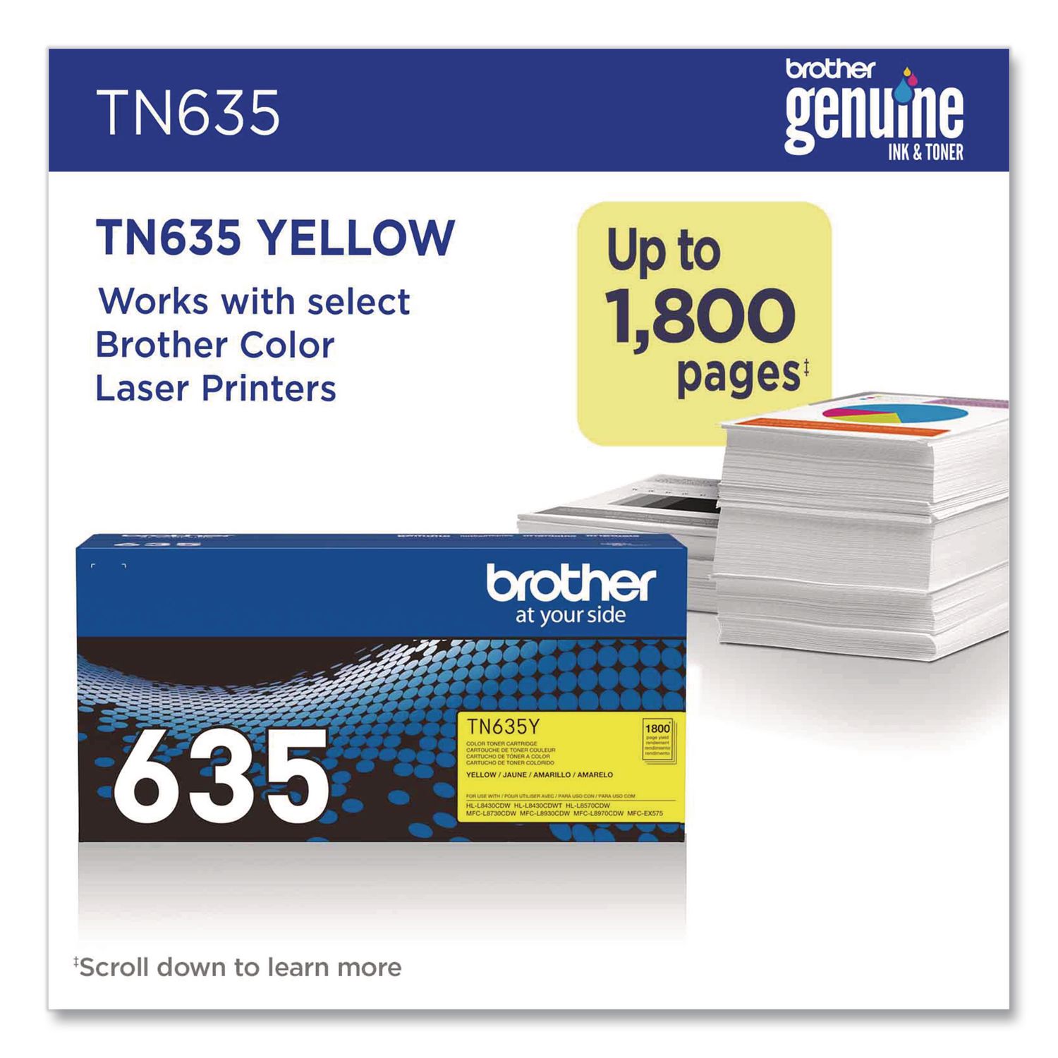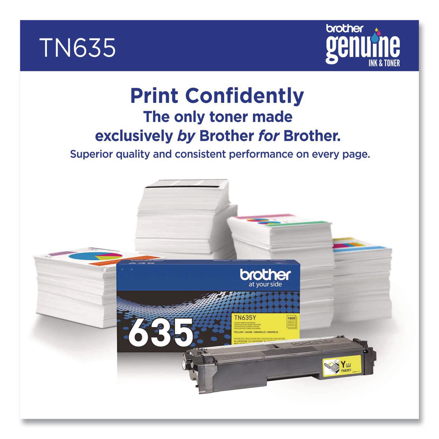 Print confidently with Brother TN635 Genuine Standard Yield Toner Cartridges. Expertly engineered, Brother Genuine is the only toner brand recommended for Brother Business Color Laser Printers. With the reassurance of dependable compatibility, this cartridge produces sharp, precise results. A must-have for consistently impressive quality, Brother Genuine Toner is the reliable choice for producing professional documents with ease. When it’s time to replace your printer’s toner cartridge, the Brother Genuine brand provides a worry-free experience. Device Types: Laser Printer; Color(s): Yellow; Page-Yield: 1,800; Supply Type: Toner.