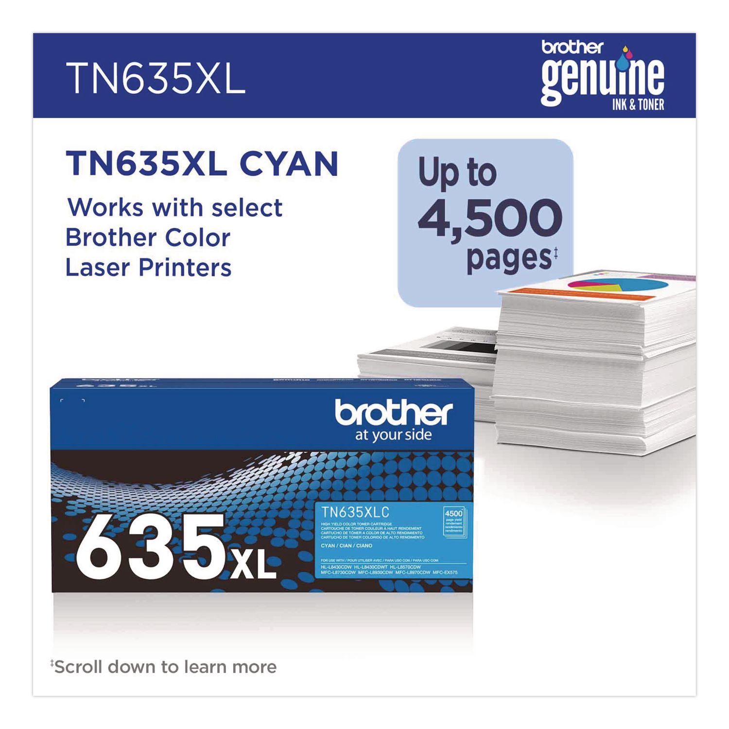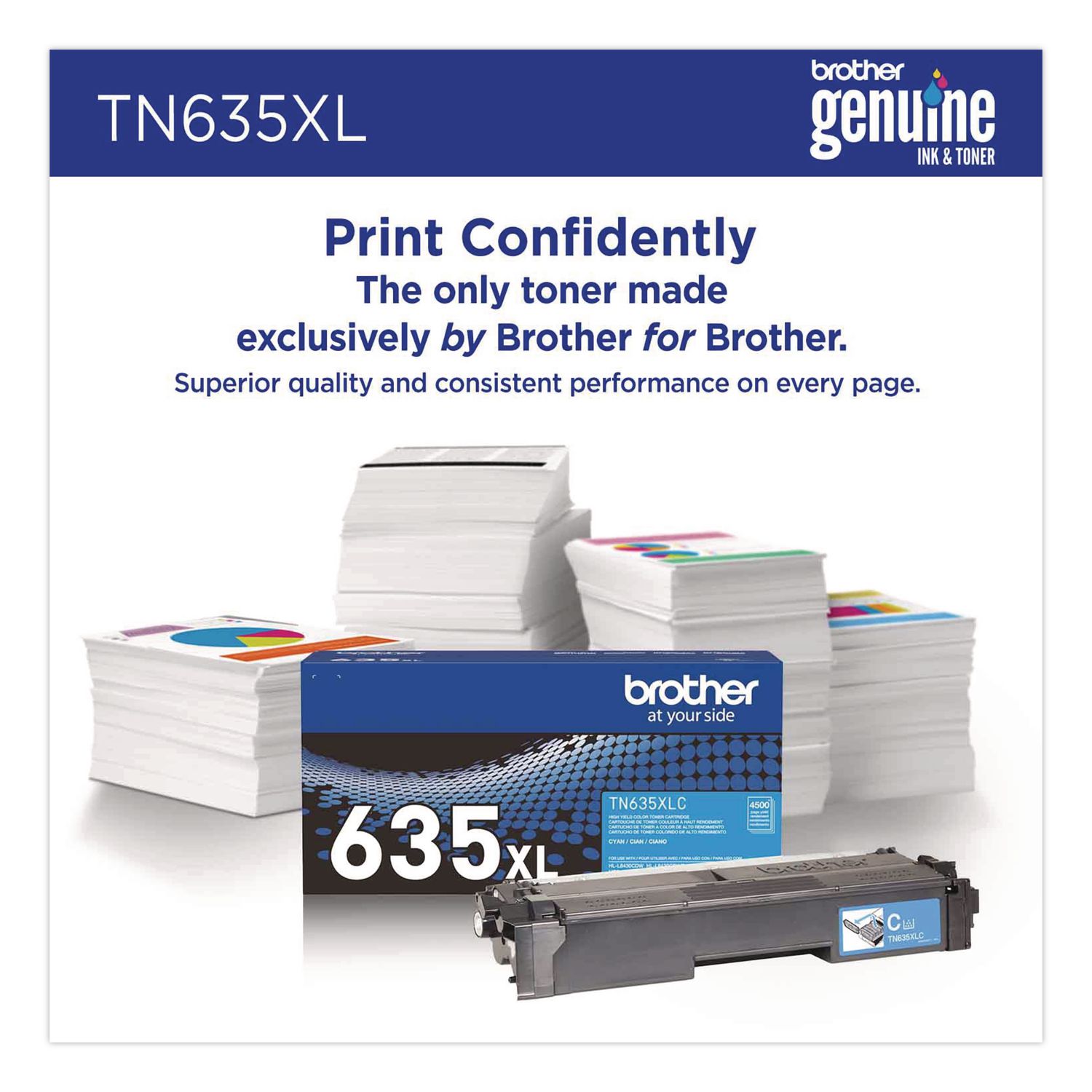 Print confidently with Brother Genuine TN635XL High Yield Toner Cartridges. Expertly engineered, Brother Genuine is the only toner brand recommended for Brother Business Color Laser Printers. With the reassurance of dependable compatibility, this cartridge produces vivid, high-quality results. A must-have for consistently impressive quality, Brother Genuine Toner is the reliable choice for producing professional documents and personal paperwork with ease. When it’s time to replace your printer’s toner cartridge, the Brother Genuine brand provides a worry-free experience. Device Types: Laser Printer; Color(s): Cyan; Page-Yield: 4,500; Supply Type: Toner.