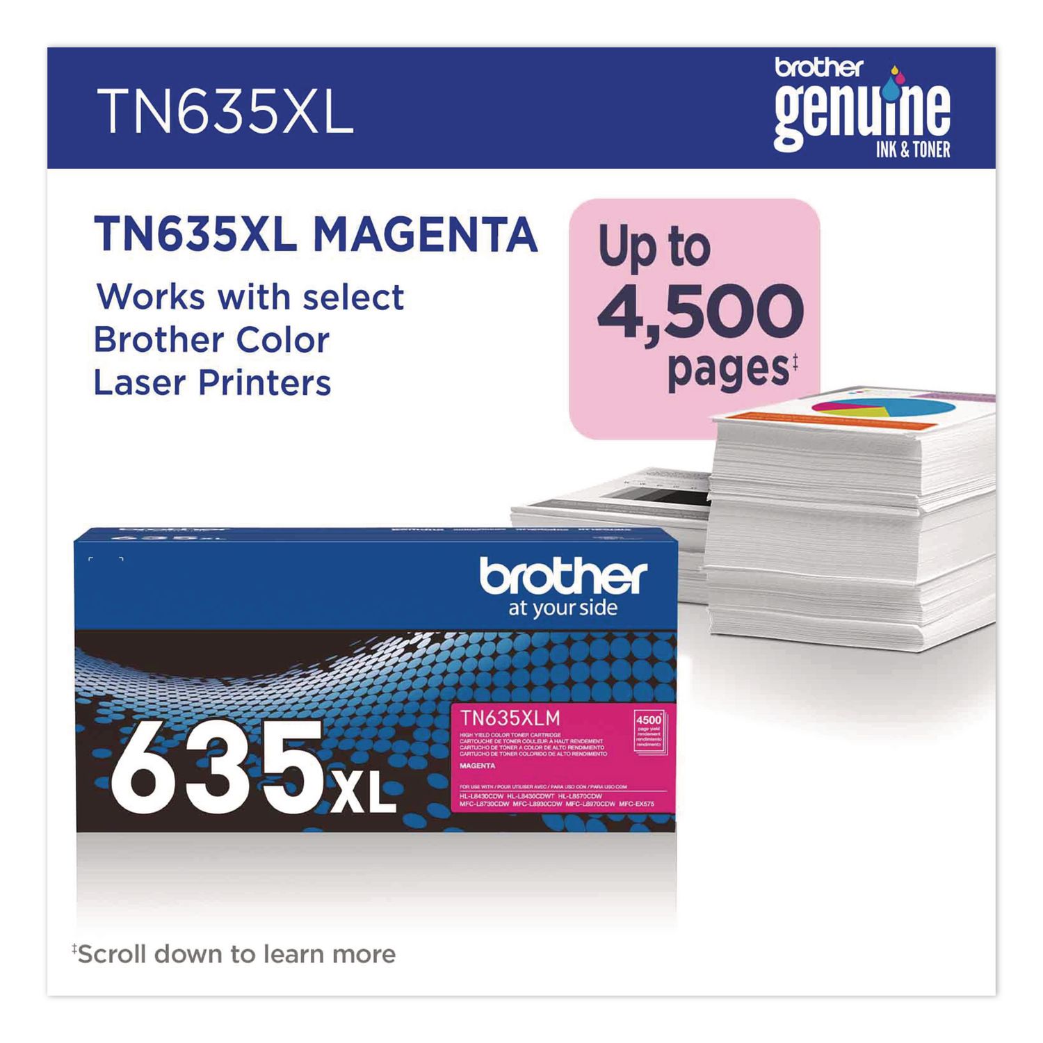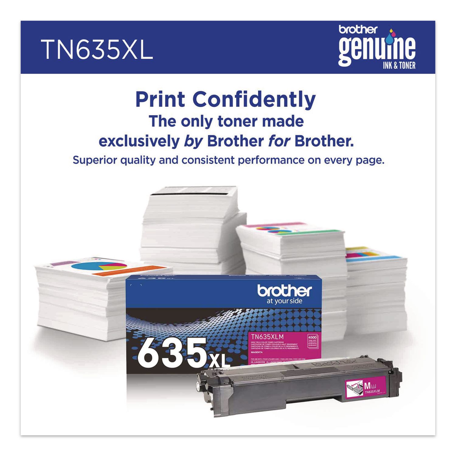 Print confidently with Brother Genuine TN635XL High Yield Toner Cartridges. Expertly engineered, Brother Genuine is the only toner brand recommended for Brother Business Color Laser Printers. With the reassurance of dependable compatibility, this cartridge produces vivid, high-quality results. A must-have for consistently impressive quality, Brother Genuine Toner is the reliable choice for producing professional documents and personal paperwork with ease. When it’s time to replace your printer’s toner cartridge, the Brother Genuine brand provides a worry-free experience. Device Types: Laser Printer; Color(s): Magenta; Page-Yield: 4,500; Supply Type: Toner.