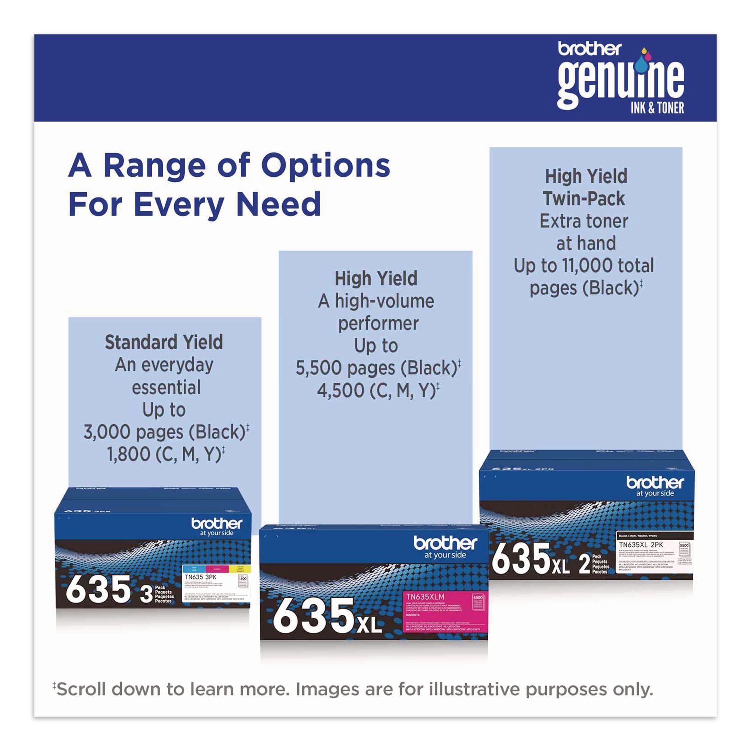 Print confidently with Brother Genuine TN635XXL Super High Yield Toner Cartridges. Expertly engineered, Brother Genuine is the only toner brand recommended for Brother Business Color Laser Printers. With the reassurance of dependable compatibility, this cartridge produces sharp, precise results. A must-have for consistently impressive quality, Brother Genuine Toner is the reliable choice for producing professional documents and personal paperwork with ease. When it’s time to replace your printer’s toner cartridge, the Brother Genuine brand provides a worry-free experience. Device Types: Laser Printer; Color(s): Magenta; Page-Yield: 6,500; Supply Type: Toner.
