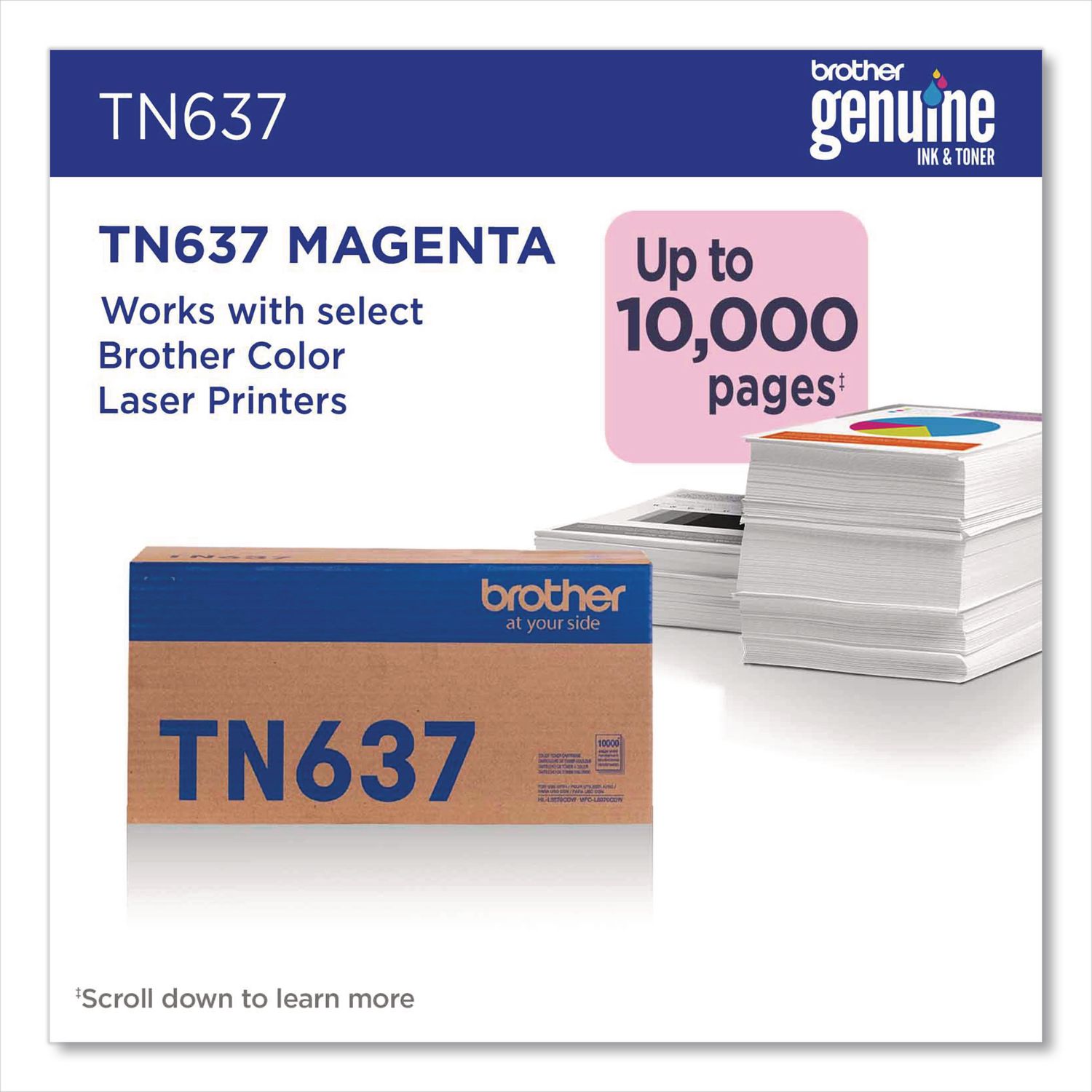 Print confidently with Brother Genuine TN637 Ultra High Yield Toner Cartridge. Expertly engineered, Brother Genuine is the only toner brand recommended for Brother Business Color Laser Printers. With the reassurance of dependable compatibility, this cartridge produces sharp, precise results. A must-have for businesses with high print volumes, Brother Genuine Ultra High Yield Toner is the reliable choice for producing professional documents with ease. When it’s time to replace your printer’s toner cartridge, the Brother Genuine brand provides a worry-free experience. For best results, use with Brother single-function and all-in-one business color laser printers. Device Types: Laser Printer; Color(s): Magenta; Page-Yield: 10,000; Supply Type: Toner.