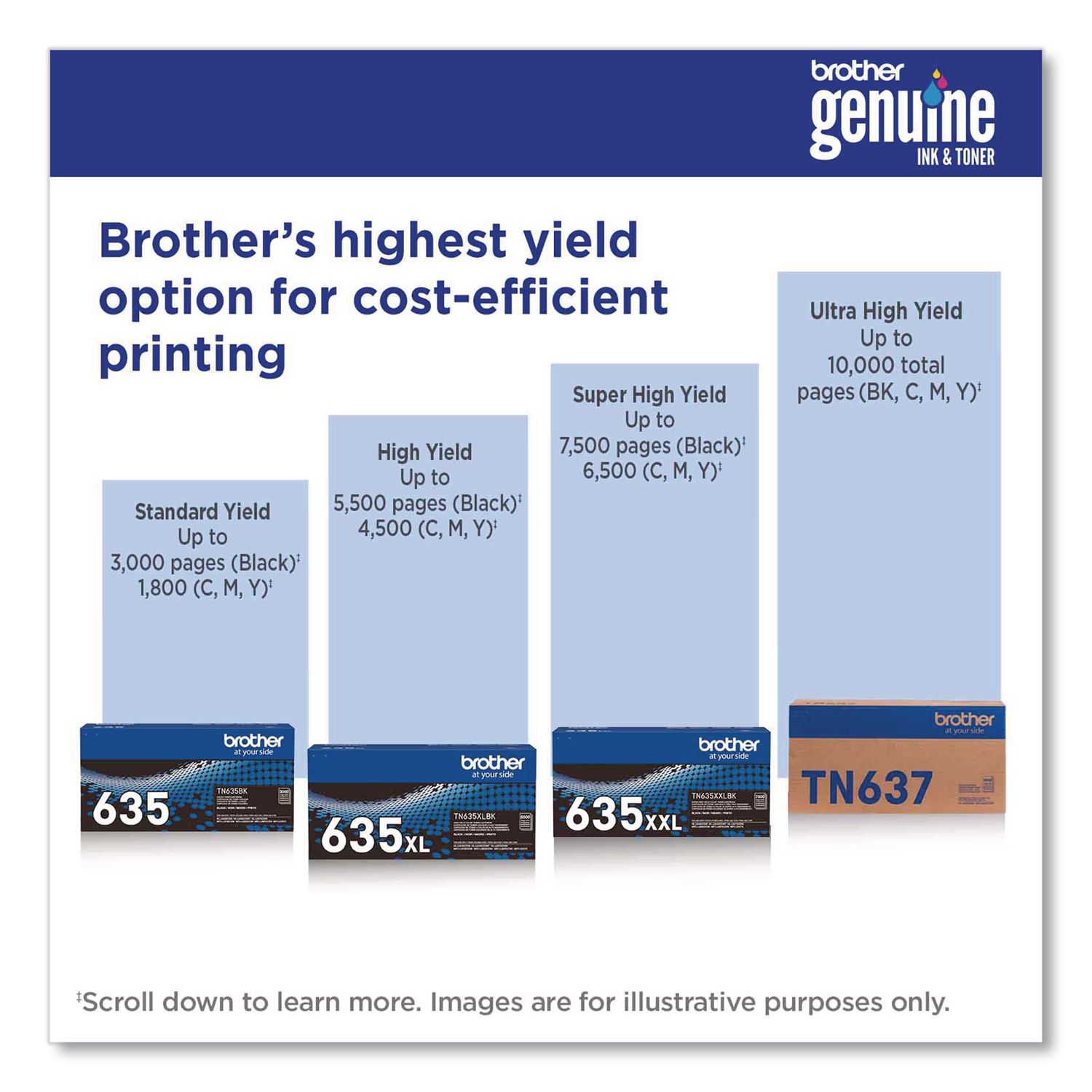 Print confidently with Brother Genuine TN637 Ultra High Yield Toner Cartridge. Expertly engineered, Brother Genuine is the only toner brand recommended for Brother Business Color Laser Printers. With the reassurance of dependable compatibility, this cartridge produces sharp, precise results. A must-have for businesses with high print volumes, Brother Genuine Ultra High Yield Toner is the reliable choice for producing professional documents with ease. When it’s time to replace your printer’s toner cartridge, the Brother Genuine brand provides a worry-free experience. For best results, use with Brother single-function and all-in-one business color laser printers. Device Types: Laser Printer; Color(s): Yellow; Page-Yield: 10,000; Supply Type: Toner.