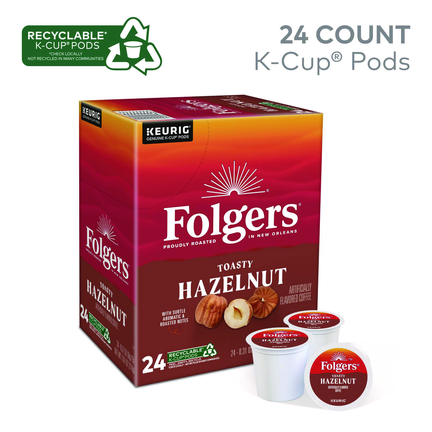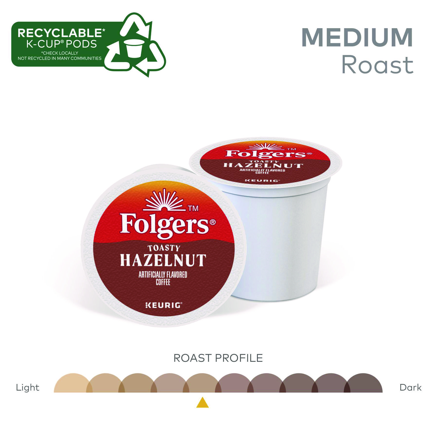 Give yourself a cozy start with Folgers Toasty Hazelnut Flavored K-Cup® pods. Its buttery hazelnut flavor and sweet, nutty aroma will warm up any morning. K-Cup® pods for use with the Keurig® brewing system. May receive packaging with Hazelnut Cream or Toasty Hazelnut label, both are hazelnut flavored. Beverage Type: Coffee; Flavor: Toasty Hazelnut; Roast Type: Medium; Product Packaging: K-Cup®.