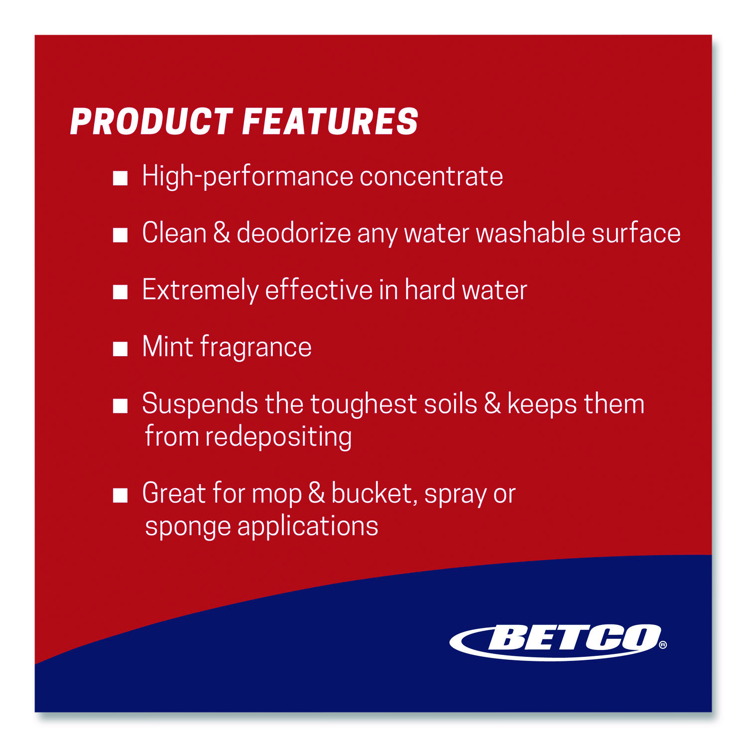 Clean and deodorize most water-washable surfaces with this advanced formula. Betco Top Flite is formulated without butyl or inorganic phosphates, and therefore it will not harm most surfaces. Great for mop and bucket, spray or sponge applications. Application: All-Purpose; Chemical Compound: Disodium EDTA; Sodium Dodecylbenzenesulfonate; C9-11 Alcohols Ethoxylated; Tetrasodium EDTA; C12-15 Alcohols Ethoxylated; Scent: Mint; Physical Form: Liquid.