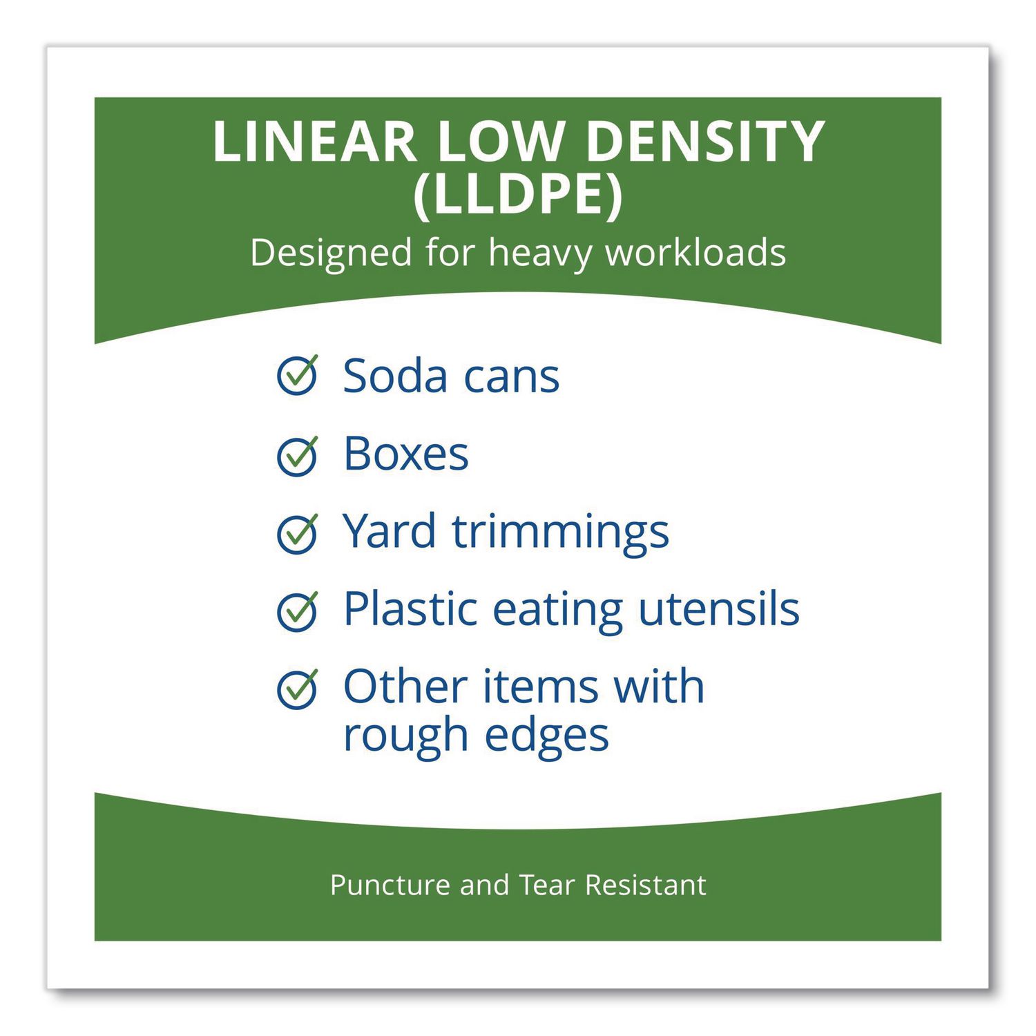 Multiuse, strong, low-density recycled plastic bags provide maximum puncture and tear resistance. Lab tested for strength and reliability to recommended weight capacity. Designed for use in specified gallon-capacity containers. Perfect for home, office and industrial use. Commercial/Consumer Use: Commercial Use; Maximum Volume Range: 51 to 60 gal; Maximum Volume Capacity: 56 gal; Weight Capacity (Dry): 75 lb.
