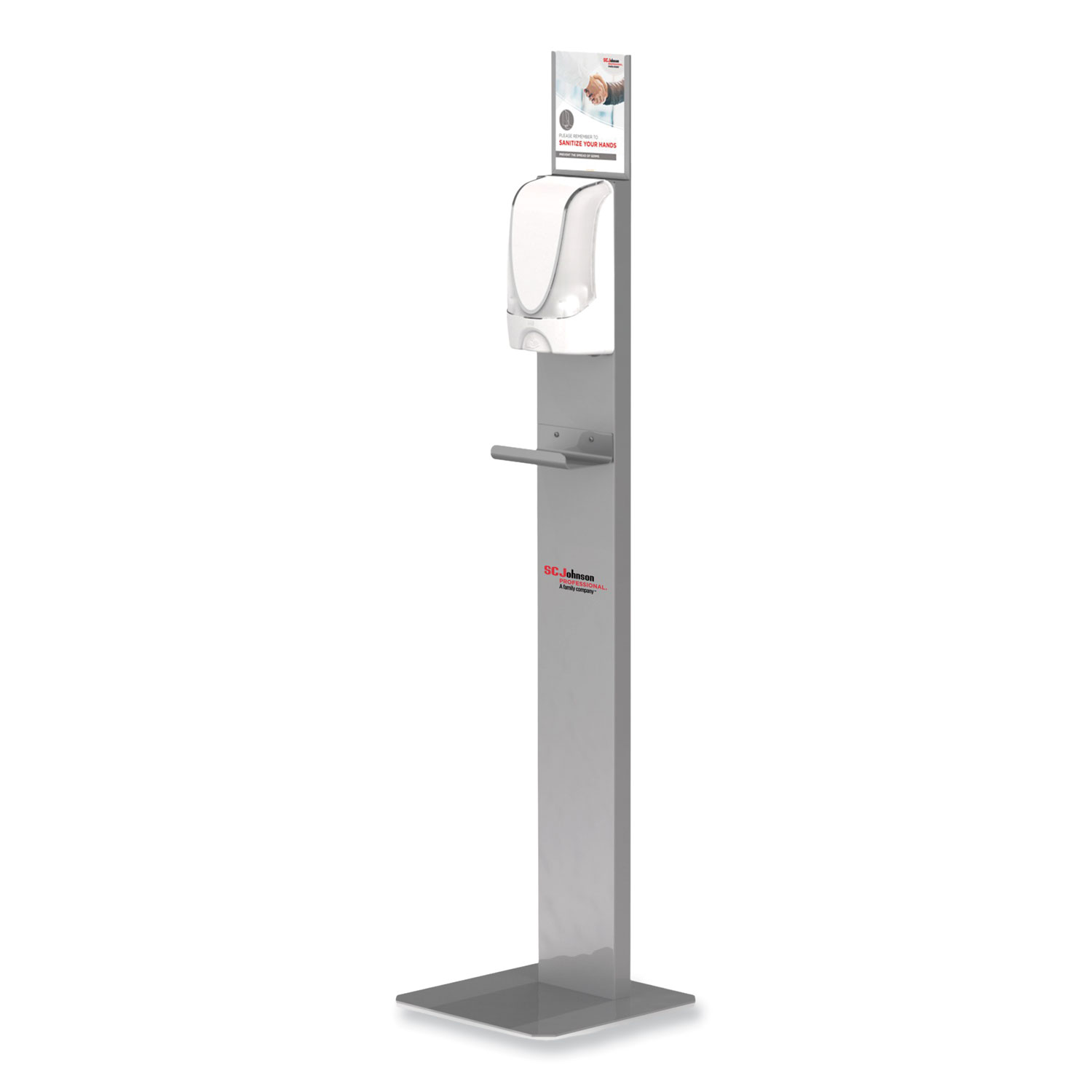 Stylish dispenser stand that will help promote hand sanitizing in multiple areas of any facility. It is ideal for use in any work environment or public area where a higher level of hand hygiene is required. the easy-to-assemble design has only three main parts (assembly tools included). Optional signage allows you to easily customize the header with your message or logos (template provided in Features & Benefits). Sturdy metal construction and durable coating protects against wear and tear. Low profile base to maximize stability. Use included silver metal catch tray or black/white catch trays (sold separately). For use with touch-free dispensers (sold separately). For Use With: SC Johnson Professional Touch-Free Dispensers; Color(s): Silver; Size: 19.29 x 19.2 x 27.9.