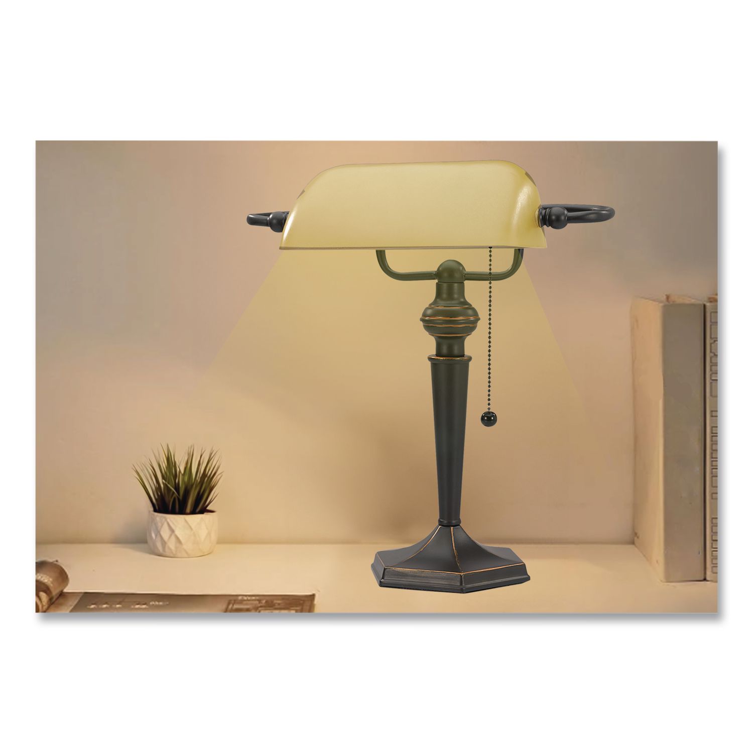 Classic design adds sophistication and elegance to any office, study, or home den. Refined glass shade rotates to pilot light direction. Classic pull chain for easy on/off power. 13W CFL bulb is included. Base Color: Antique Bronze; Plug Type: 2 Prong; Height: 16″; Width: 10″.
