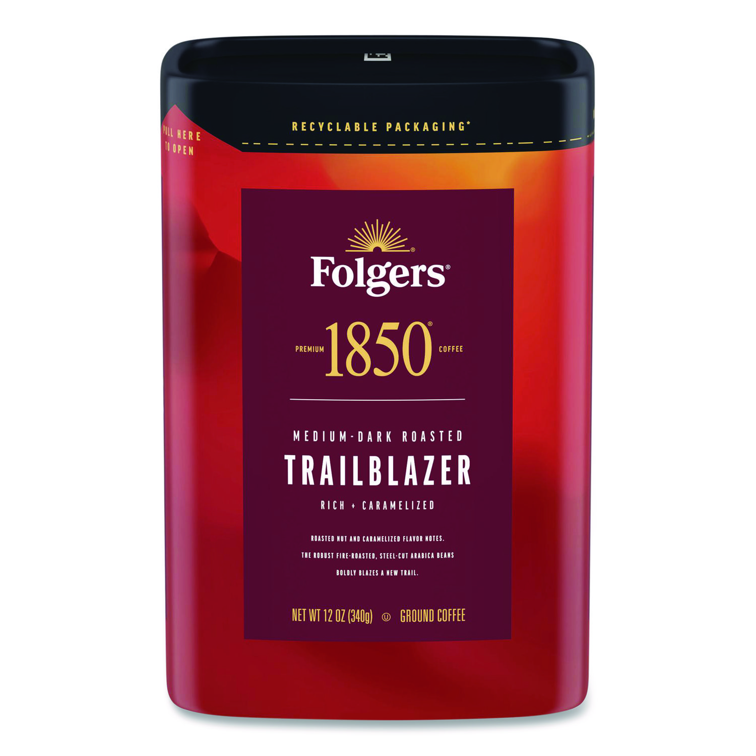 Ignite your passion with Folgers 1850 Trailblazer coffee. Every sip of this premium medium-dark roast coffee delivers roasted nut and caramelized flavor notes with the unique complexity of fire-roasted, steel-cut Arabica beans. No matter how you brew it, you’re in for an exceptional coffee experience backed by time-honored roasting and grinding techniques. But the coffee itself isn’t the only thing inspired by James A. Folger’s innovative spirit. Beverage Type: Coffee; Flavor: Trailblazer; Roast Type: Dark; Product Packaging: Canister.