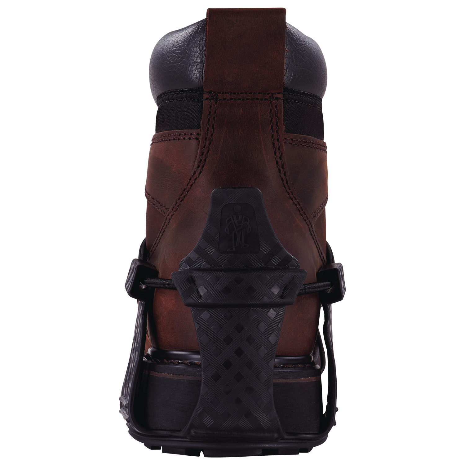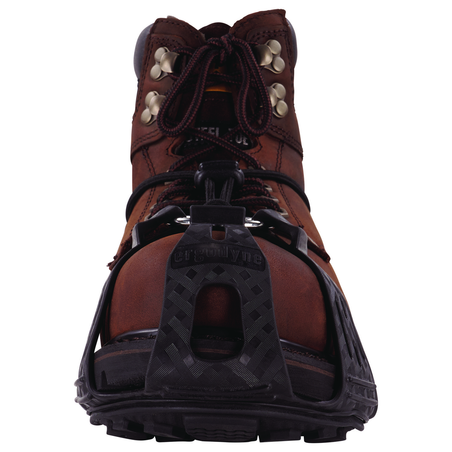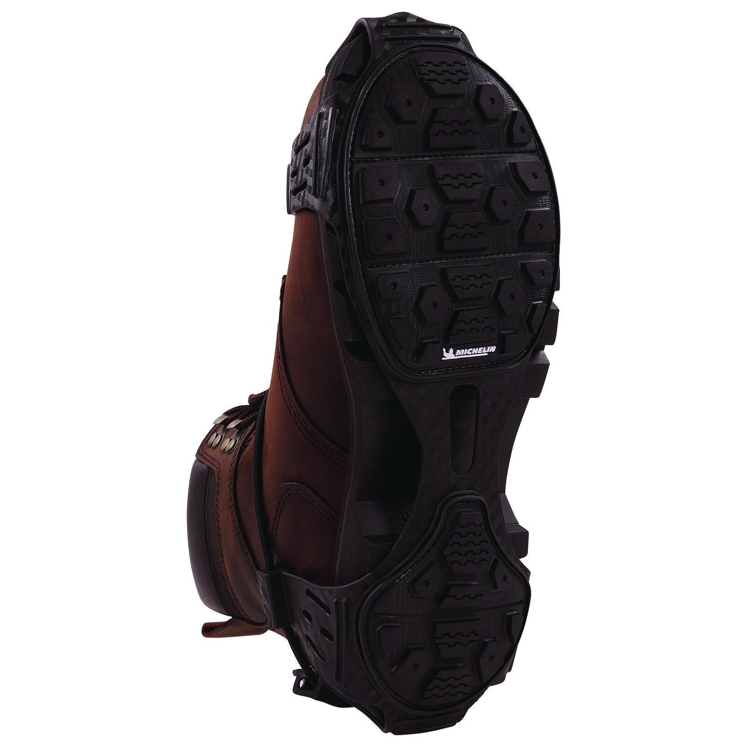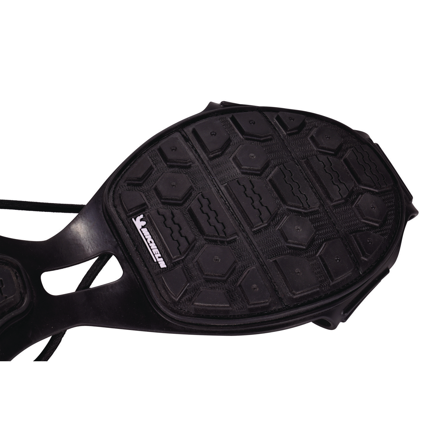 TREX Spikeless Traction Devices for shoes reduce the risk of slips and injuries by providing spike-free traction on slick surfaces. Powered by Soles by Michelin, these are the industry’s most advanced spikeless traction device. Designed for work environments where spiked ice cleats are not preferred, these shoe and boot grips make for easy and safe transition between indoor and outdoor. To achieve traction without spikes, the treads are constructed with a Michelin ice control compound, the same innovative technology found in their winter driving tires. Strategically placed grooves allow for efficient water evacuation when pressure is applied. Preventing water build-up is particularly beneficial on smooth indoor surfaces. Micro-pumps increase adhesion by properly distributing pressure to maintain high surface contact on icy surfaces. The tread is designed with block sipings that create additional surface area for increased grip on snowy surfaces. Footwear Type: Traction Device; Size Group: 2X-Large; Material(s): Nylon/TPE/Tungsten Carbide; Color(s): Black.