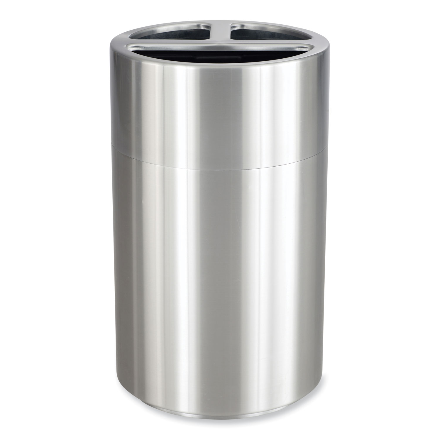 This classic Triple Recycling Receptacle features three separate waste sections and decals for waste, cans, paper, plastic and recycle to keep materials separated and to provide a multipurpose waste receptacle solution. The lid is removable for ease of use when removing recyclables or waste. This versatile receptacle features a 40-gal total capacity that includes one 20-gal rigid plastic liner and two 10-gal rigid plastic liners for easy separation of waste. Designed with aluminum for long-lasting durability and a sleek aesthetic that fits into a variety of spaces. Ideal for indoor use, this receptacle is great for use in breakrooms, cafeterias, conference rooms, open office spaces, lobbies, entrances or exits, and a variety of other spaces. Waste Receptacle Type: Indoor Recycling Bin; Material(s): Steel; Application: Office Waste Disposal; Interior Volume Capacity: 40 gal.