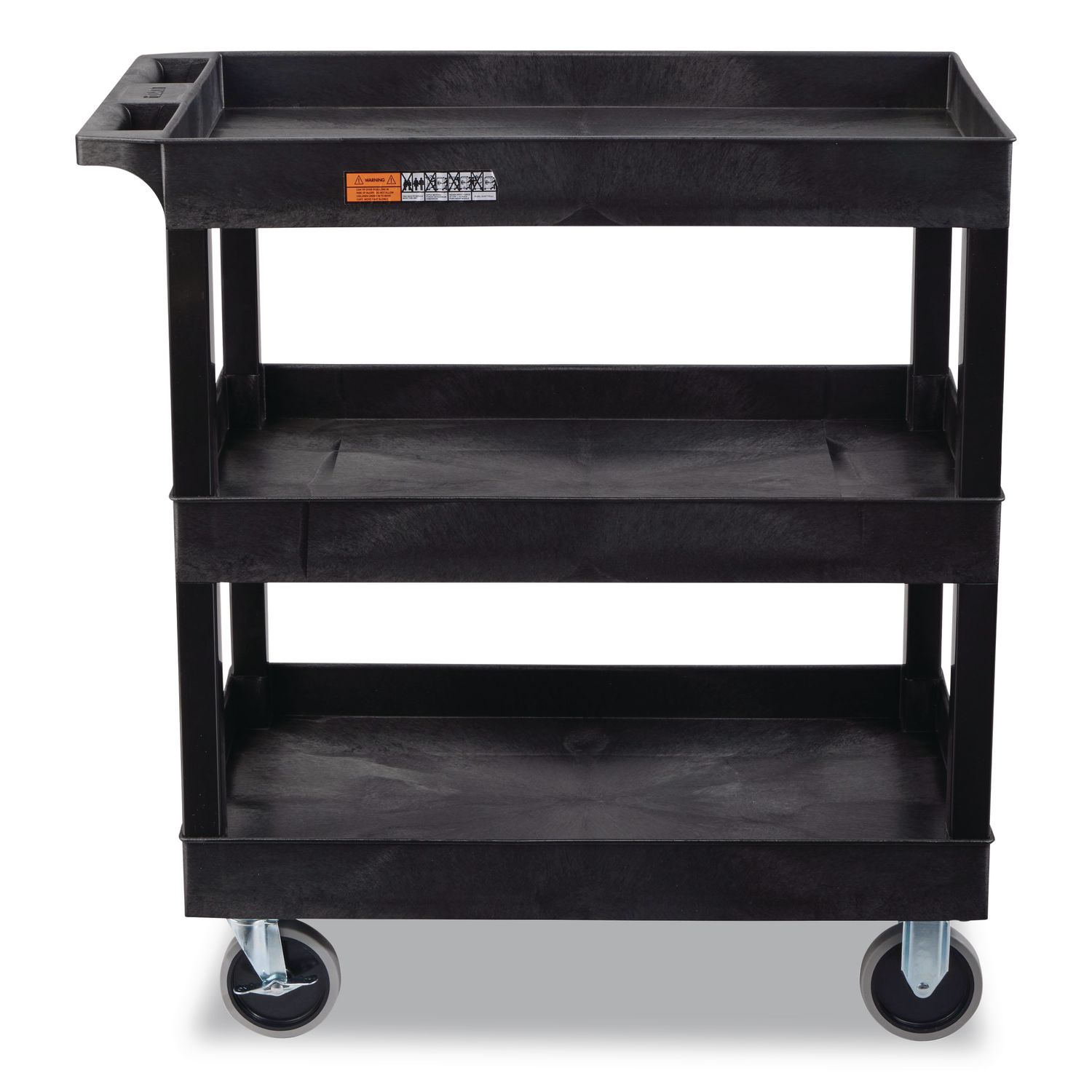 TUFFY™ Carts are the original injection molded plastic carts, invented by H. Wilson in 1971. Known for their textured HDPE/PVC construction, swivel casters, and angled handles, they’re lightweight yet incredibly strong. tough enough for daily use and built to last shift after shift. The TUFFY™ XL Heavy-Duty Three-Shelf Utility Cart provides deep-sided shelves to keep items secure during transport. The smooth casters and angled handles make them easy to navigate in busy spaces. From classrooms to facilities, TUFFY™ Carts adapt to a wide range of uses. With multiple shelf styles and durable construction, they are ready for any daily demand. Material(s): High-Density Polyethylyne (HDPE); Polyvinyl Chloride (PVC); Overall Material Type: Plastic; Color(s): Black; Color Family: Black.
