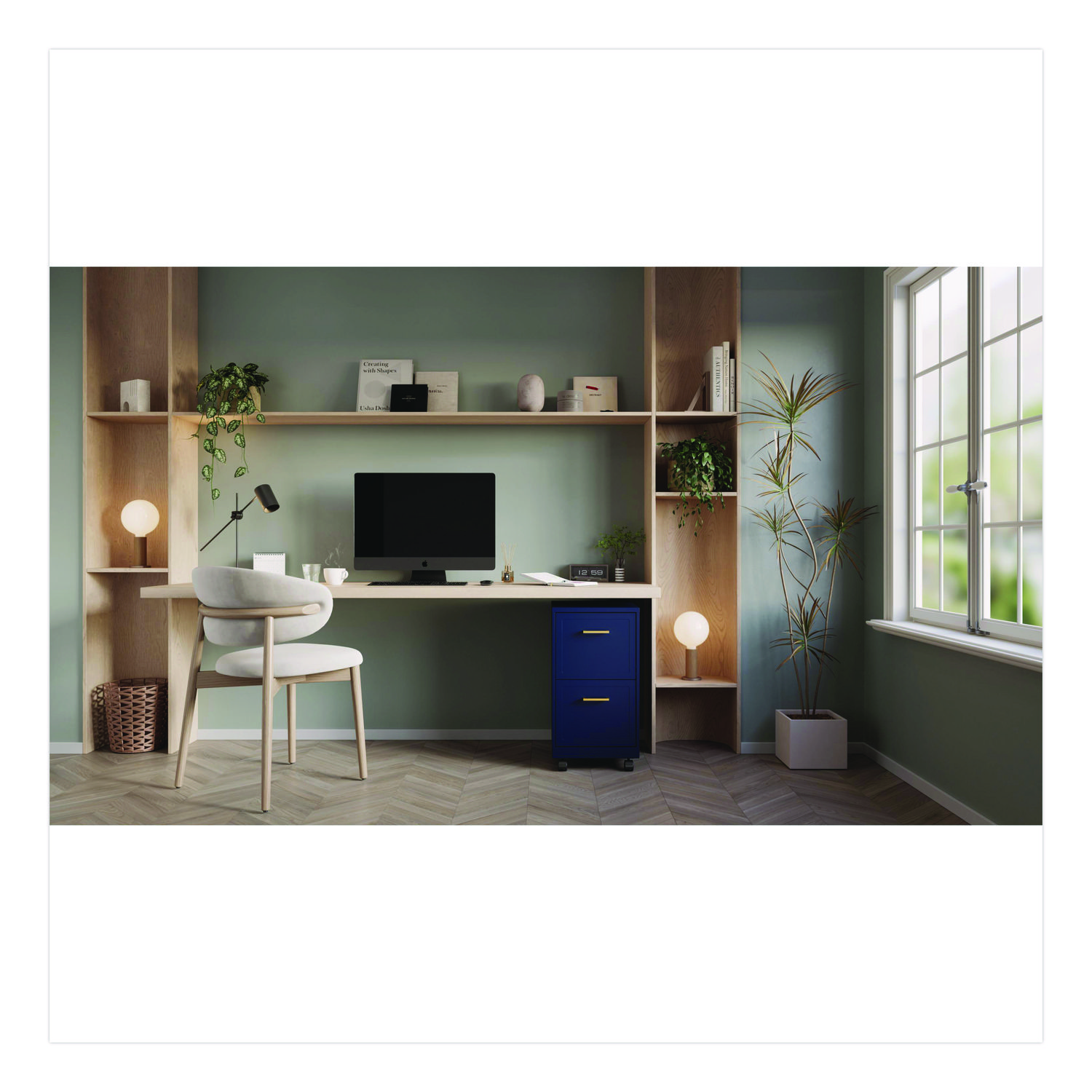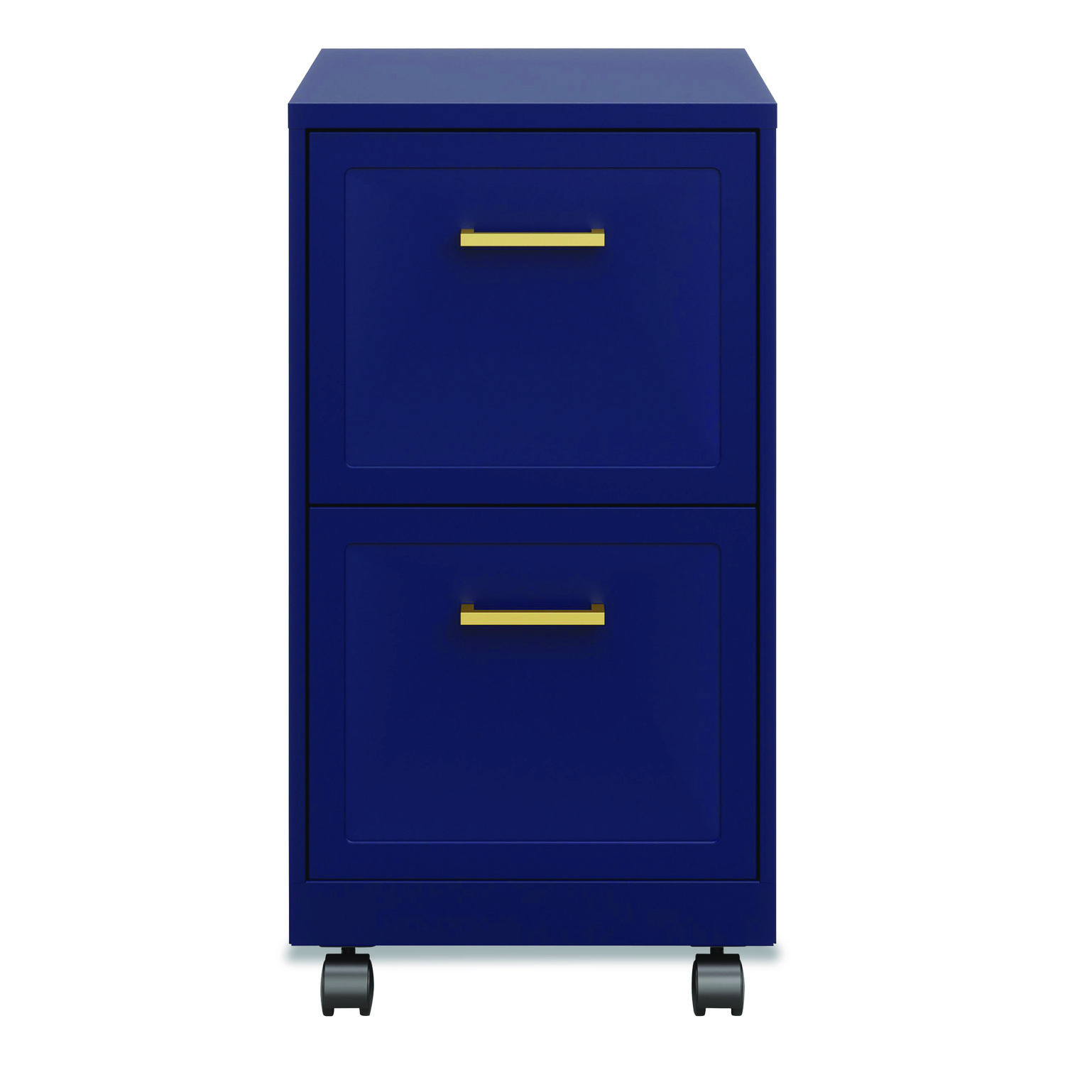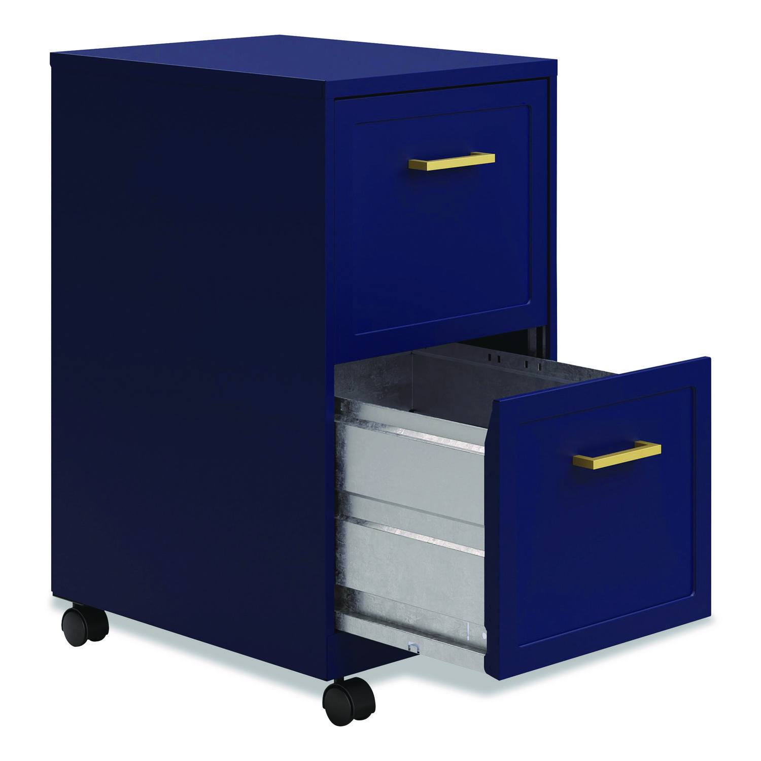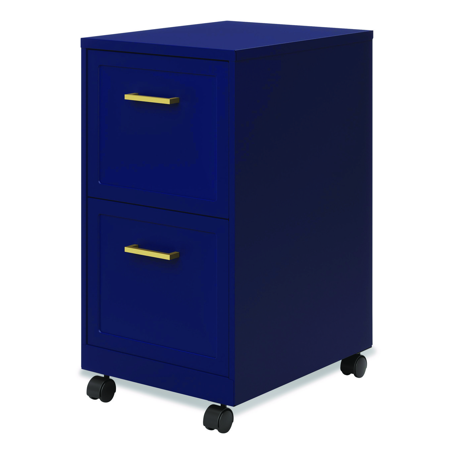 Vertical file drawers accommodate letter-size hanging file folders. Full high-side drawers provide storage solutions for other office essentials. Smooth patented glide suspension drawer slides. Matte nickel pulls and square embossed fronts elevate the cabinet for a more enhanced look. Three-quarter drawer extension. Fully assembled welded cabinet. Assembly of the handles and optional casters required. Tucks under most work surfaces and office desks with easy-roll casters. Number of Drawers: 2; Drawer Configuration: File/File; Anti-Tip Mechanism Indicator: No; Color(s): Navy.