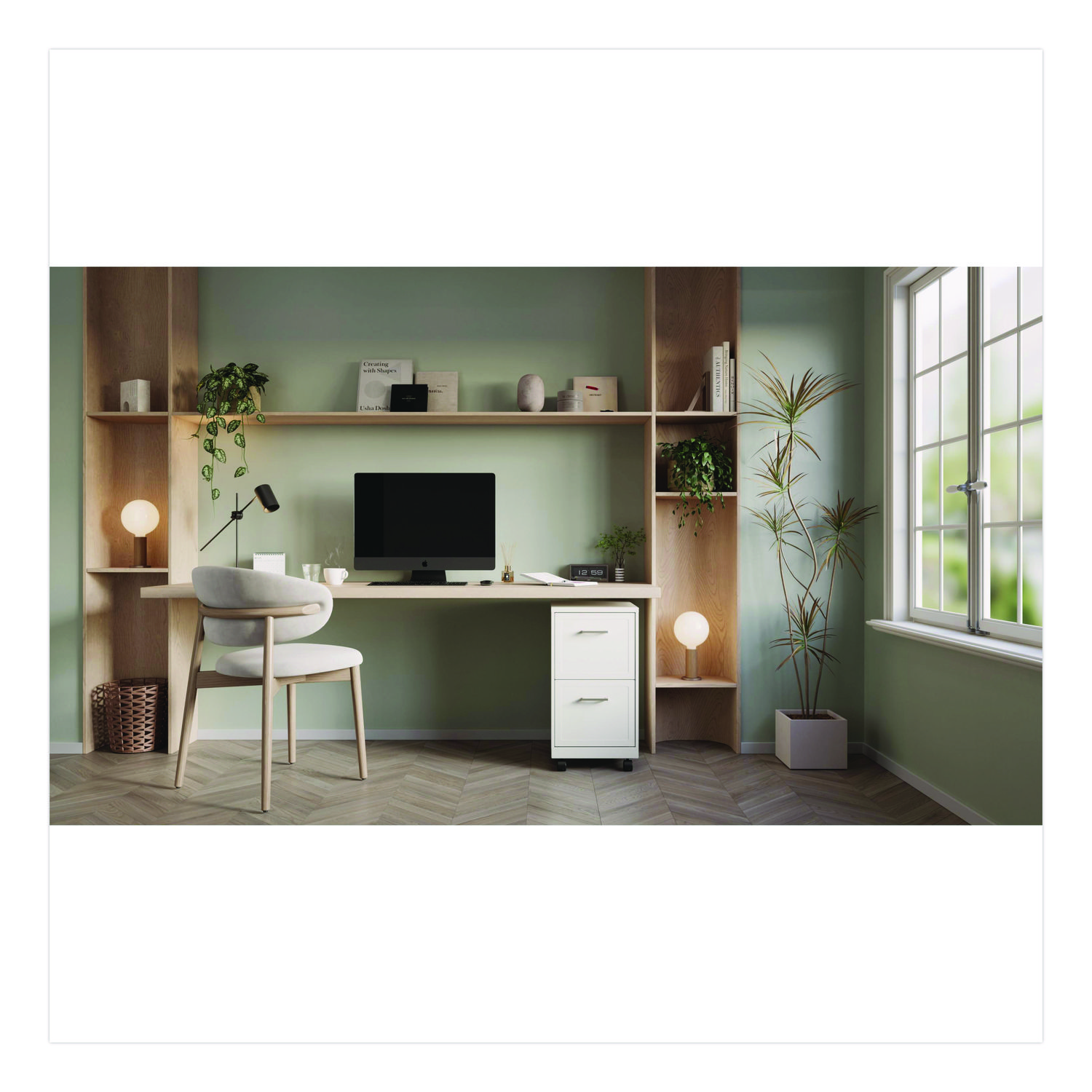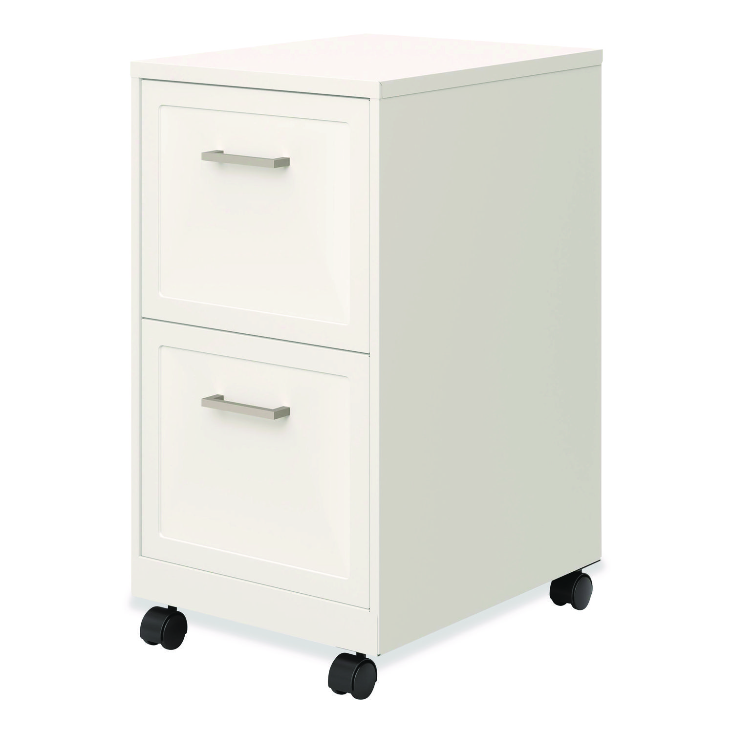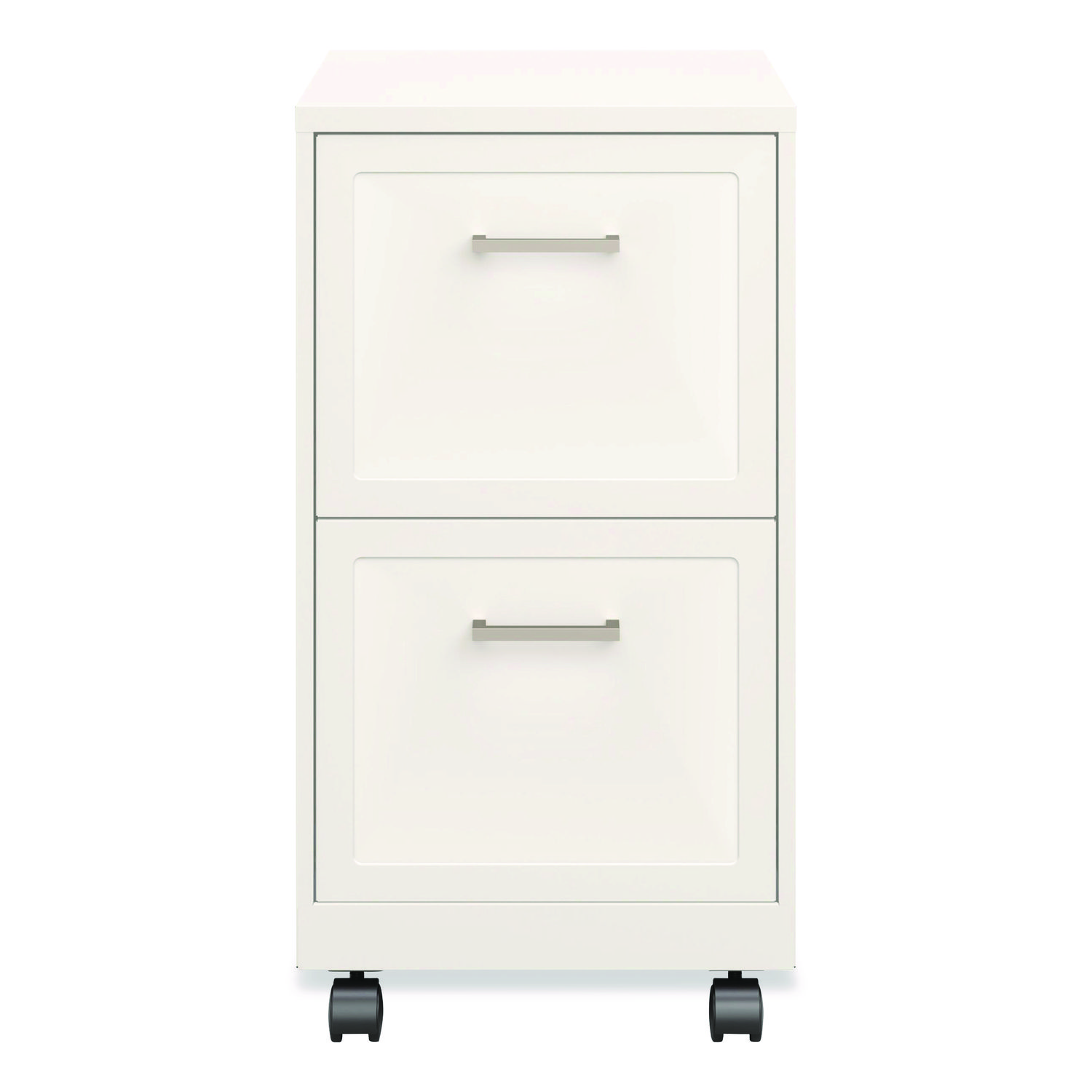 Vertical file drawers accommodate letter-size hanging file folders. Full high-side drawers provide storage solutions for other office essentials. Smooth patented glide suspension drawer slides. Matte nickel pulls and square embossed fronts elevate the cabinet for a more enhanced look. Three-quarter drawer extension. Fully assembled welded cabinet. Assembly of the handles and optional casters required. Tucks under most work surfaces and office desks with easy-roll casters. Number of Drawers: 2; Drawer Configuration: File/File; Anti-Tip Mechanism Indicator: No; Color(s): Pearl White.