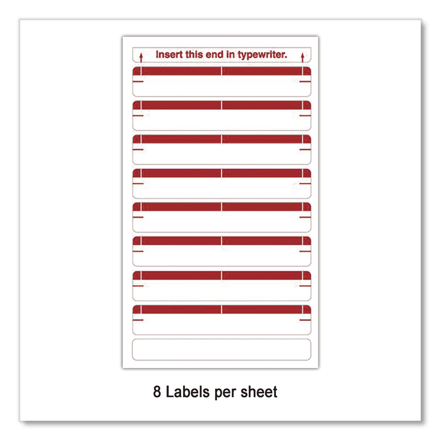 Handy 8-label sheets slide easily into your typewriter or can be handwritten. Pressure-sensitive for easy application. Shape: Rectangular; Label Size – text: 3.5″ x 0.63″; Design: Blank; Label Color(s): Red/White.