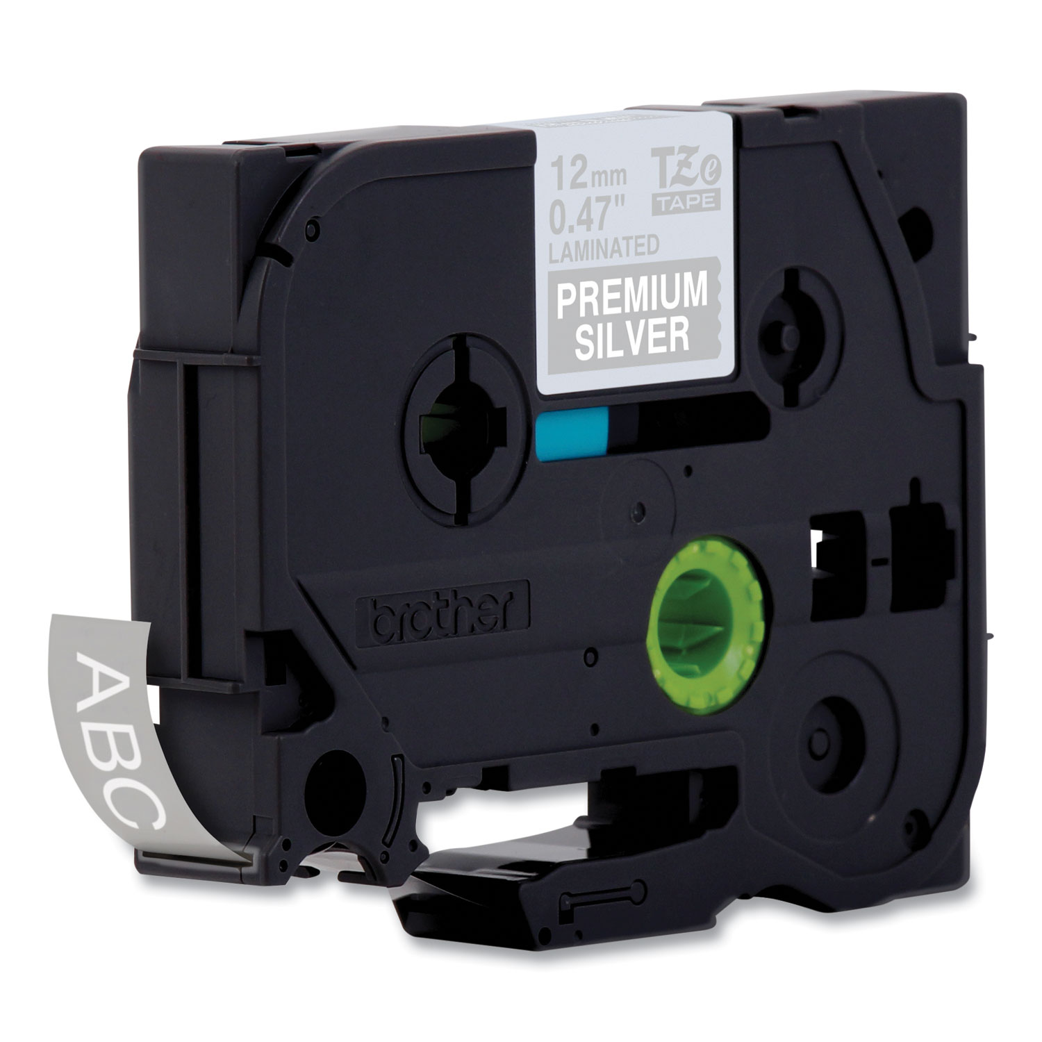 TZe Premium Laminated Tape, 0.47″ x 26.2 ft, White on Silver