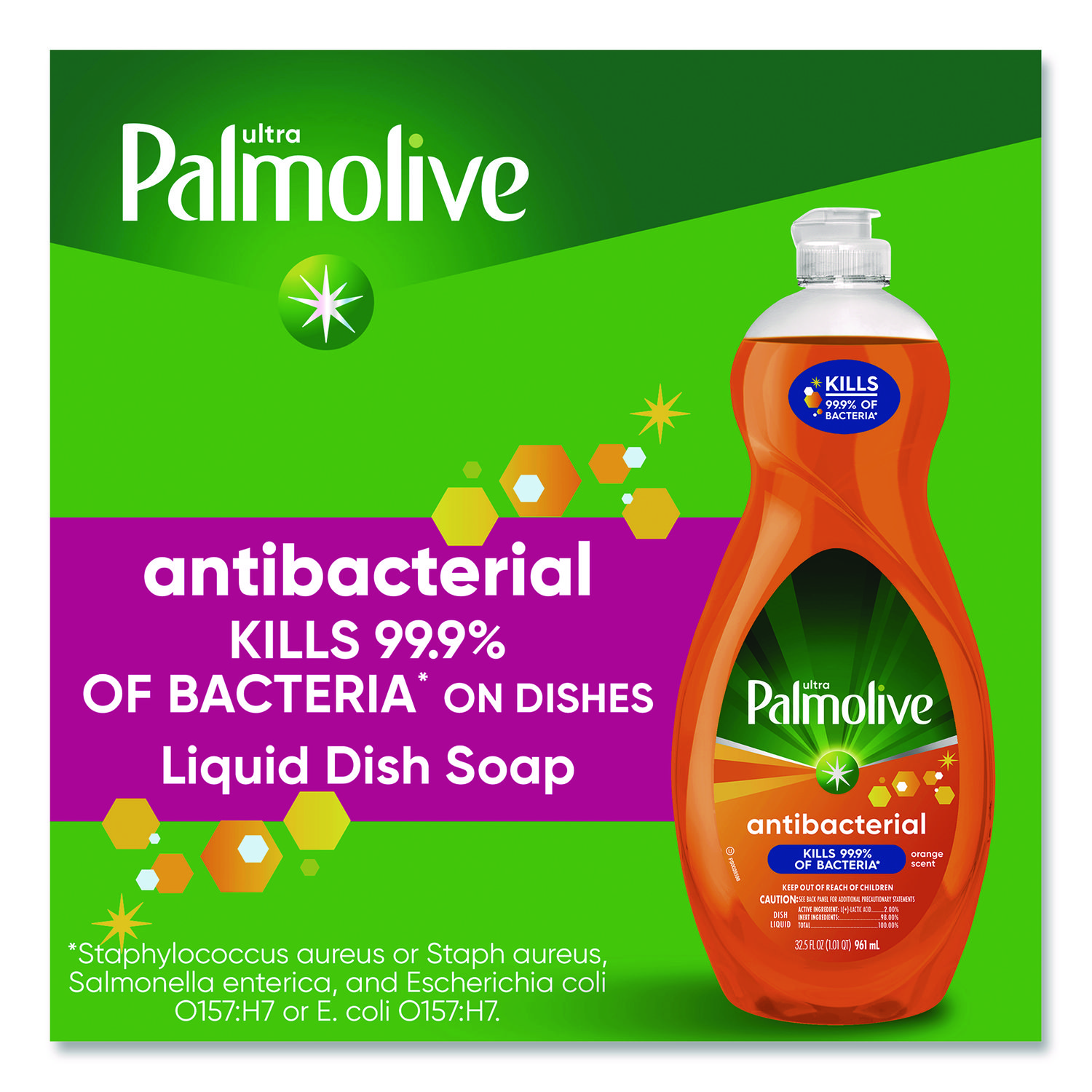 Palmolive Ultra Antibacterial dish liquid is approved to kill 99% of bacteria like Salmonella enteria, E. coli and Staph aureus on dishes in 30 seconds when used as directed, allowing you to wash away more than just baked on grease and giving you peace of mind that your dishes are as clean as can be. Application: Hand Dishwashing; Applicable Material: Ceramic; Glass; Metal; Plastic; Stainless Steel; Dirt Types: Dirt; Food; Grease; Grime; Scent: Orange.