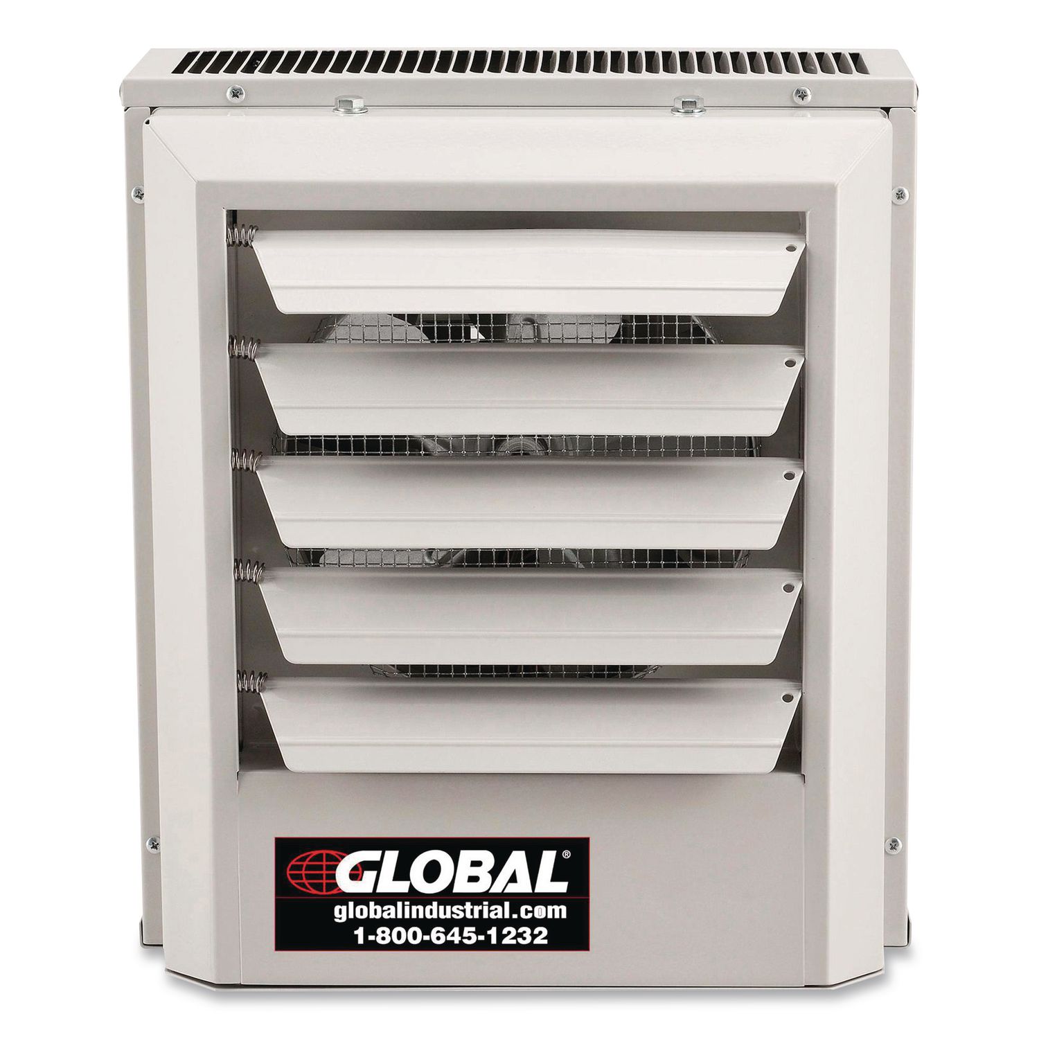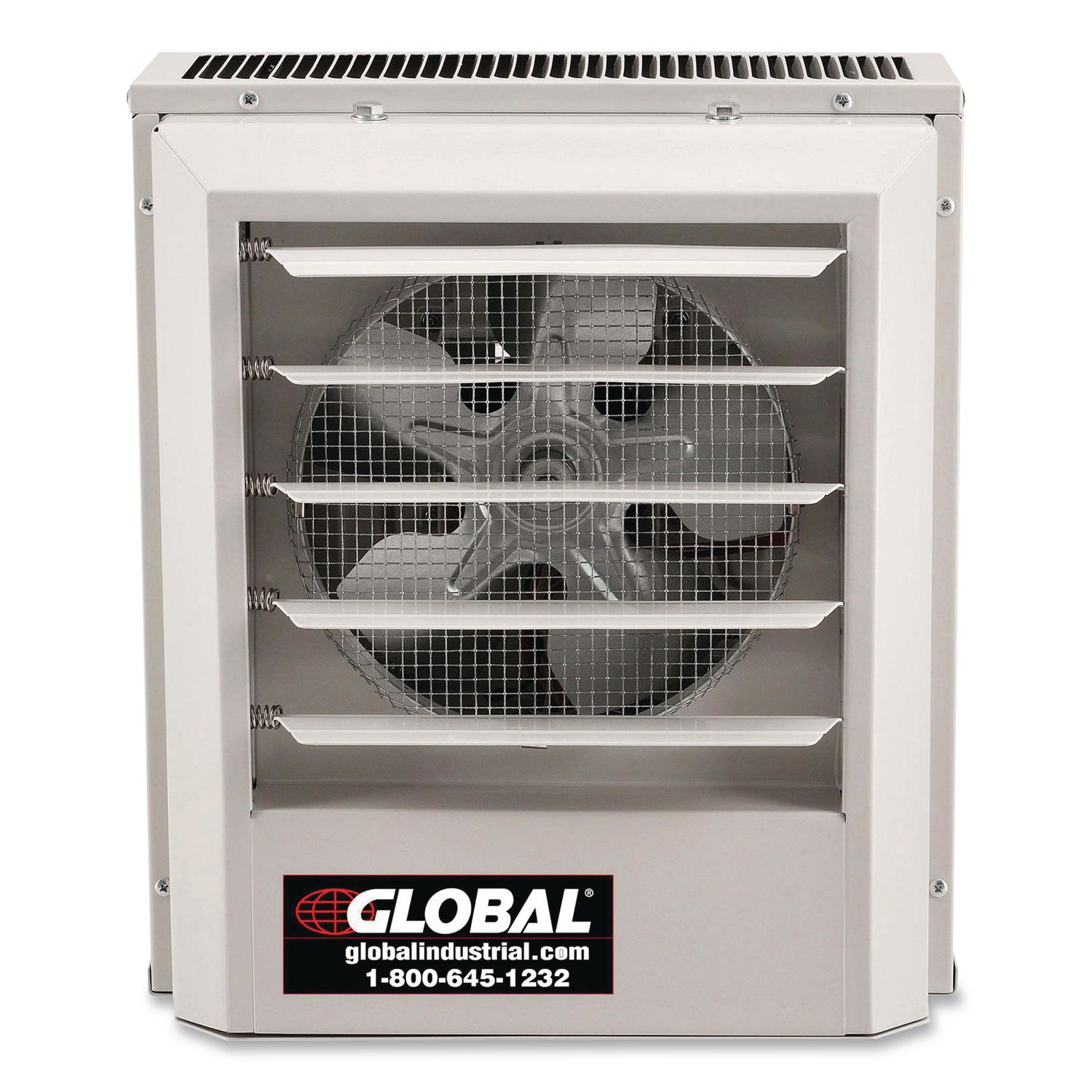 This is a great addition as a supplementary or primary heat source to quickly heat enclosed spaces without taking up any floor space. The list of ideal spaces includes garages, stores, maintenance rooms, basements, public buildings, factories, service stations, stairwells, power stations, mechanical rooms, stock rooms and workshops. This heater can be mounted vertically or horizontally on to a ceiling using threaded mounting rods and requires four 5/16″-18 thread size rods (sold separately) to fit into the threaded holes on the heater with at least 7.5″ length and secured in place using lock nuts. This forced air unit heater with advanced pull-through air flow design draws air across heating element to quickly create hot air that is evenly distributed into a room to reach desired temperature levels. In addition, louvers adjust up and down for even greater control of throw direction. Easy to use built-in turn dial thermostat goes from Min position all the way up to Max and can be set at desired comfort level to cycle on and off automatically. It is constructed from cold rolled steel for extra toughness and durability. The unit comes equipped with thermal cut-off protection, a safety feature that will automatically turn the heater off if overheating occurs. Easy to install and quick access to control box and wiring makes it easy to service. Heater Type: Horizontal or Vertical Fan Forced Heater; Safety Features: Overheat Protection; Setting Range [Min]: 1,650 W; Setting Range [Max]: 5,000 W.