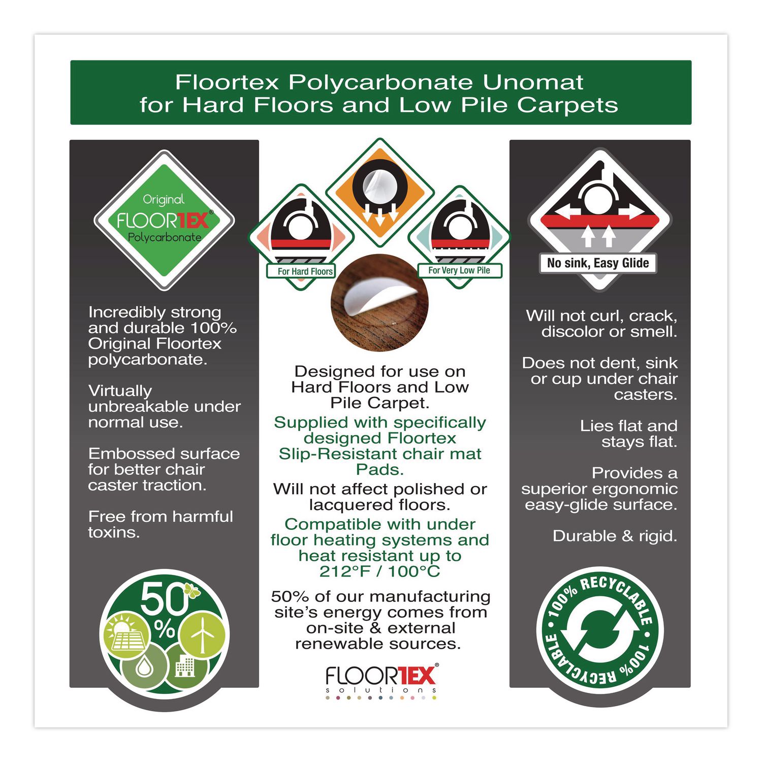 Cleartex® Unomat® anti-slip polycarbonate chair mats are the ultimate in quality and durability in floor protection and ergonomics. These high clarity chairmats are made from Floortex® Original polycarbonate, which has double the impact strength of PVC and will not crack, curl, discolor or smell. Supplied with a pack of anti-slip acrylic pads to ensure excellent stability on high gloss and polished hard floors. Also ideal for very low pile carpets and carpet tiles. The perfectly flat and hard surface provides easy glide movement of caster-based chairs which can reduce leg fatigue and lower back strain. Unomat® polycarbonate is free from phthalates and PVC. An ideal choice for people with allergies. Manufactured with 50% of our manufacturing site’s energy coming from on-site and external renewable sources. Our polycarbonate mats lie perfectly flat from delivery and can be used immediately. Indoor/Outdoor: Indoor; Compatible Surface: Carpeted & Hard Floors; Compatible Carpet: Flat Pile; Mat Shape: Rectangular.