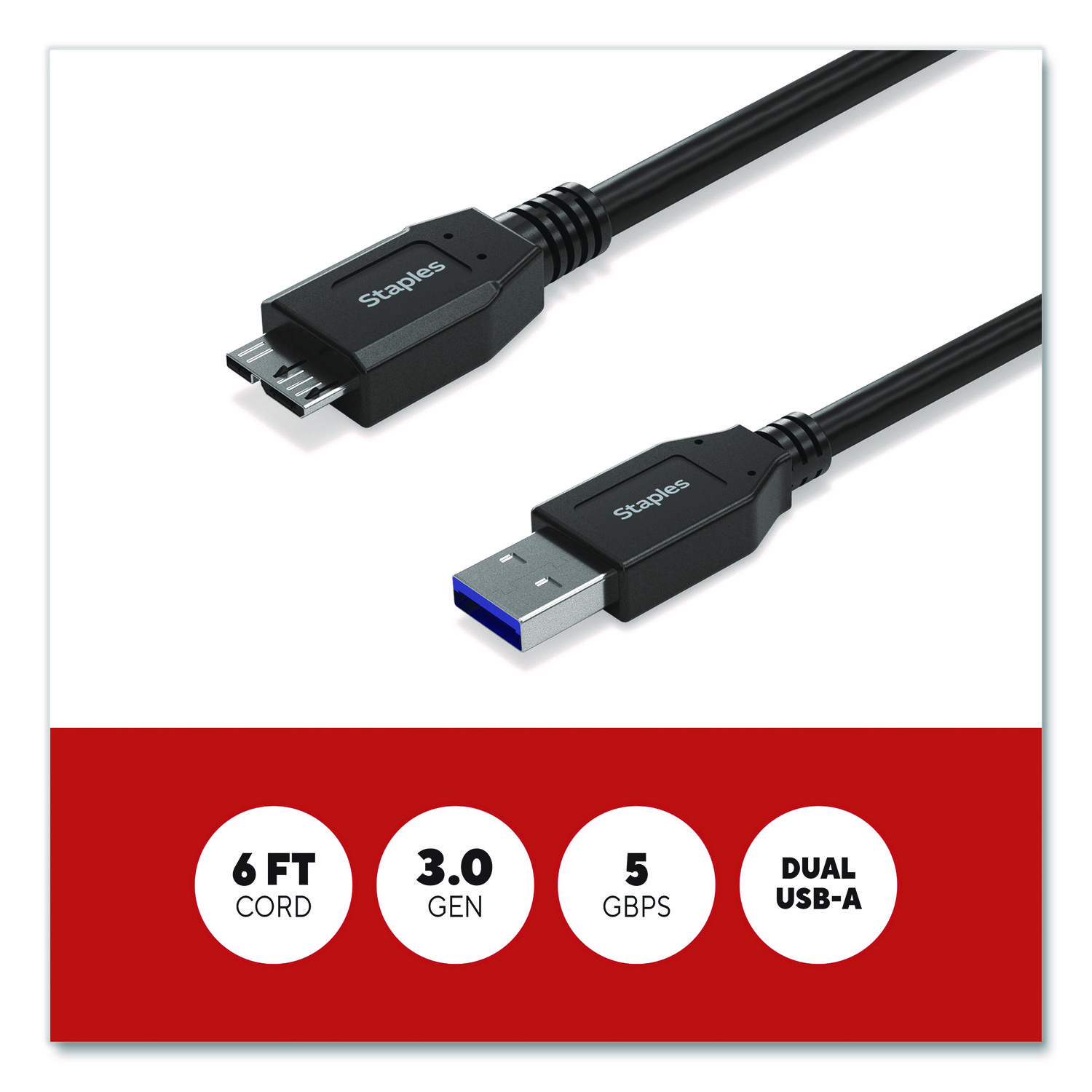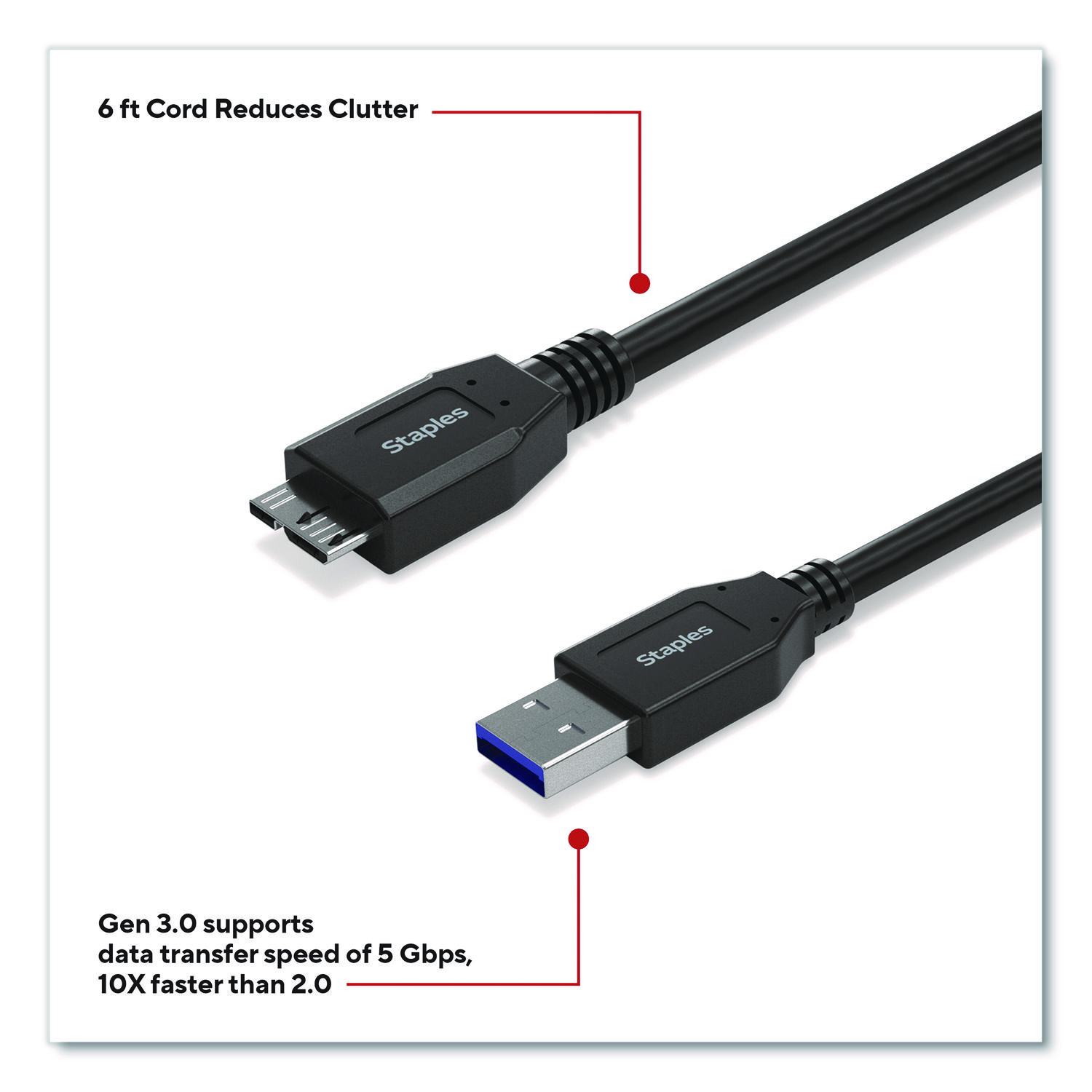 Reliably charge or sync personal electronic devices – like smartphones, tablets, cameras, gaming headsets and more – with the Staples TECH USB-A to Micro USB Type B cable. It is compact to reduce cord clutter, and the USB 2.0 boasts high-speed data transfer speeds up to 480 Mbps. Keep your workday running smoothly with the Staples TECH USB-A to Micro USB Type B cable. Cable Type: USB Cable; Connector/Port/Interface: USB-A Male; Micro USB Type B; Cable Length: 6 ft; Jacket Color: Black.
