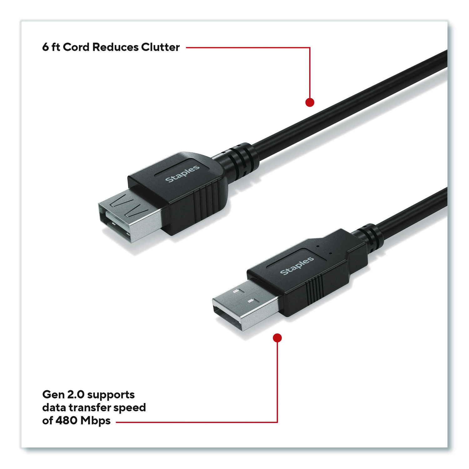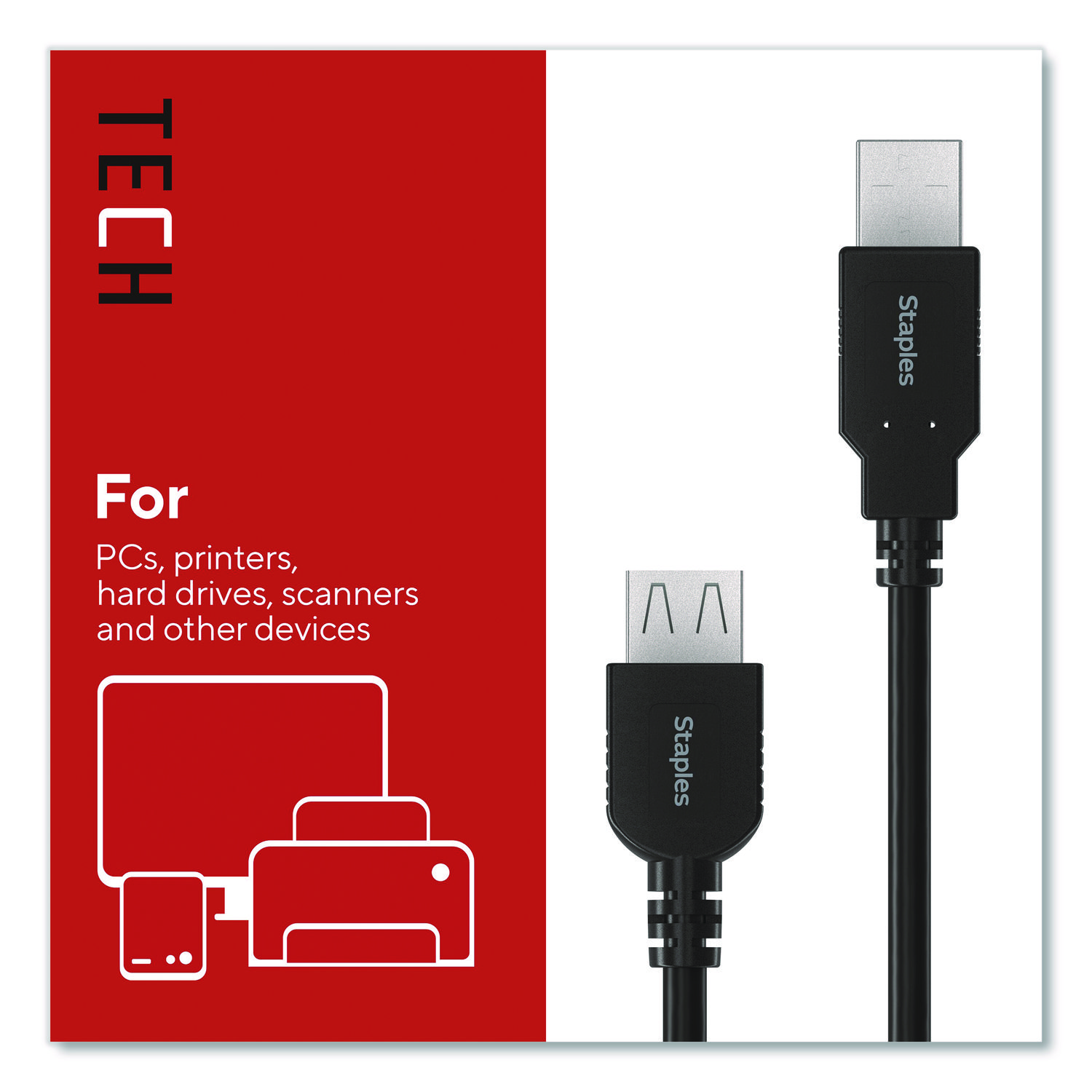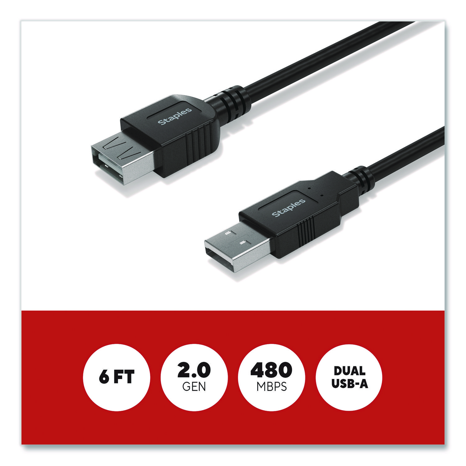 Reliably charge or sync personal electronic devices – like mice, keyboards, gaming headsets and more – with the Staples TECH USB-A cable. It is compact to reduce cord clutter, and the USB 2.0 boasts high-speed data transfer speeds up to 480 Mbps. Keep your workday running smoothly with the Staples TECH USB-A cable. Cable Type: USB 2.0 Cable; Connector/Port/Interface: USB-A Male; USB-A Male; Cable Length: 6 ft; Jacket Color: Black.