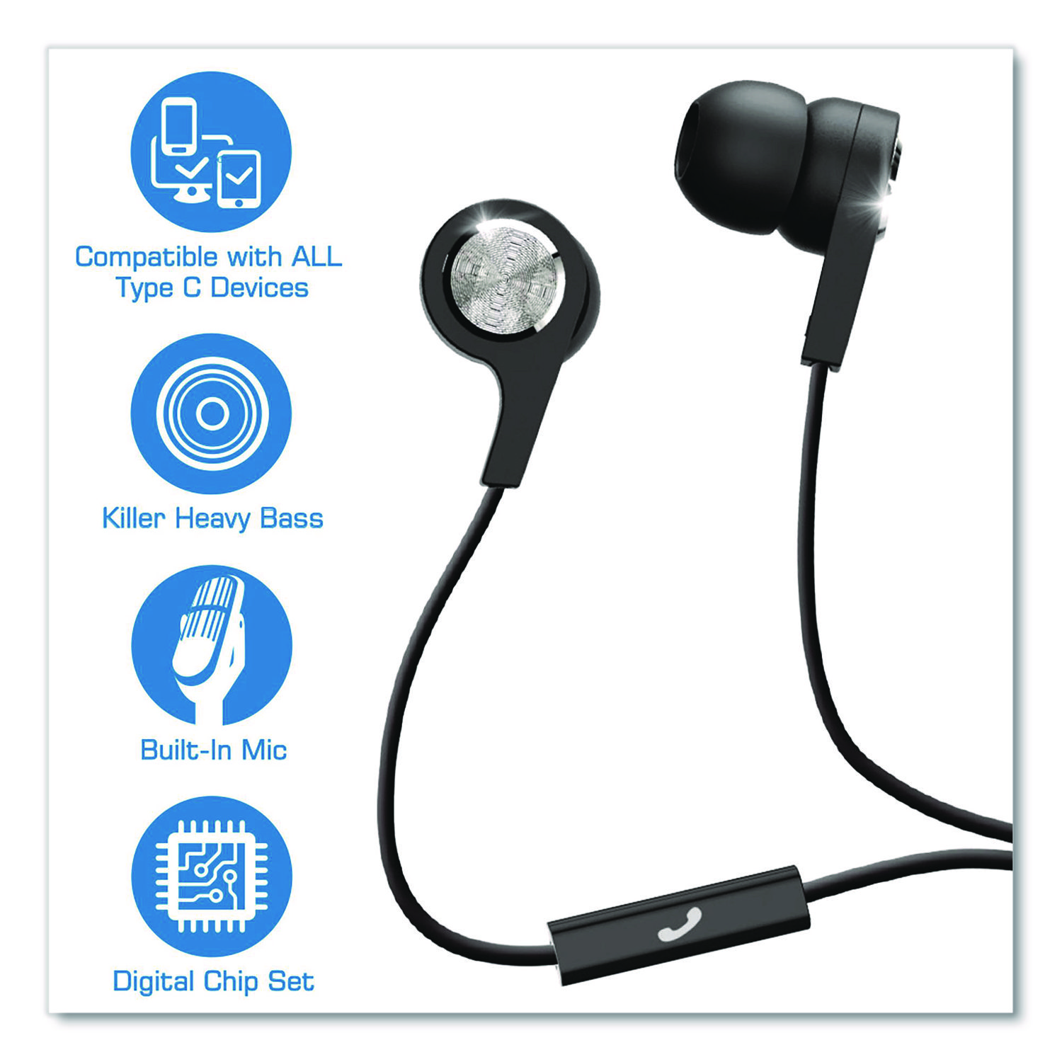 Maxell B13-C wired, in-ear bud with microphone and USB-C connection provides digital chipset and reverse plug compatible with all USB-C audio connected devices. Earpiece Type: Earbuds; Earpiece Material: Rubber; Microphone (Yes/No): Yes; Headset Features: In-Line Controls.