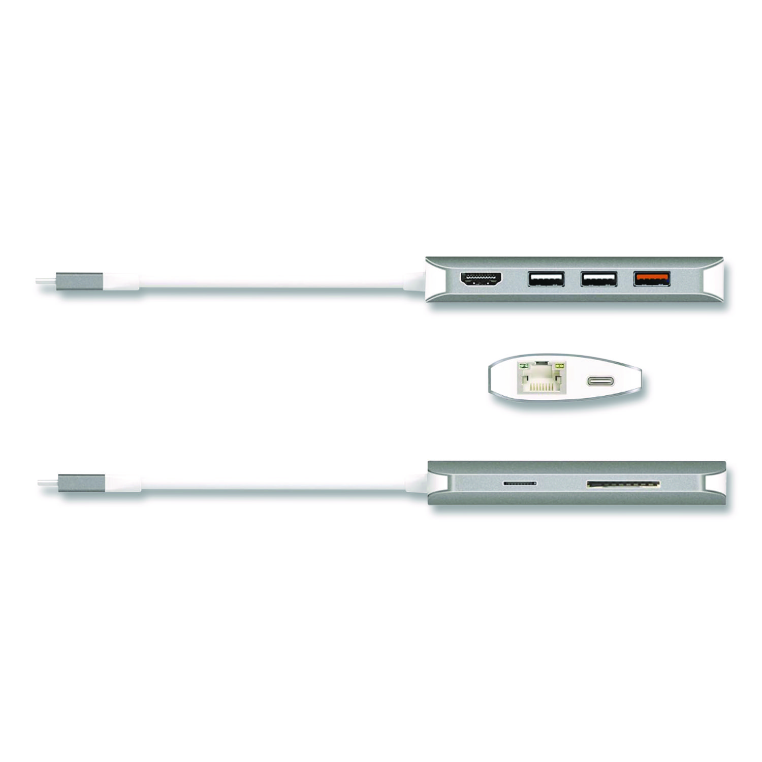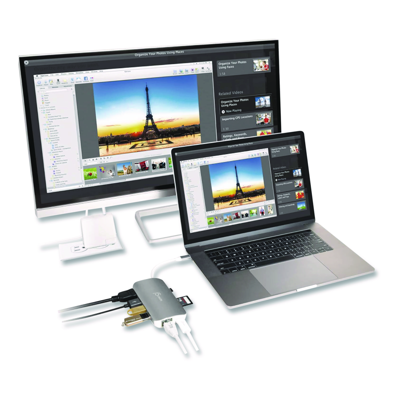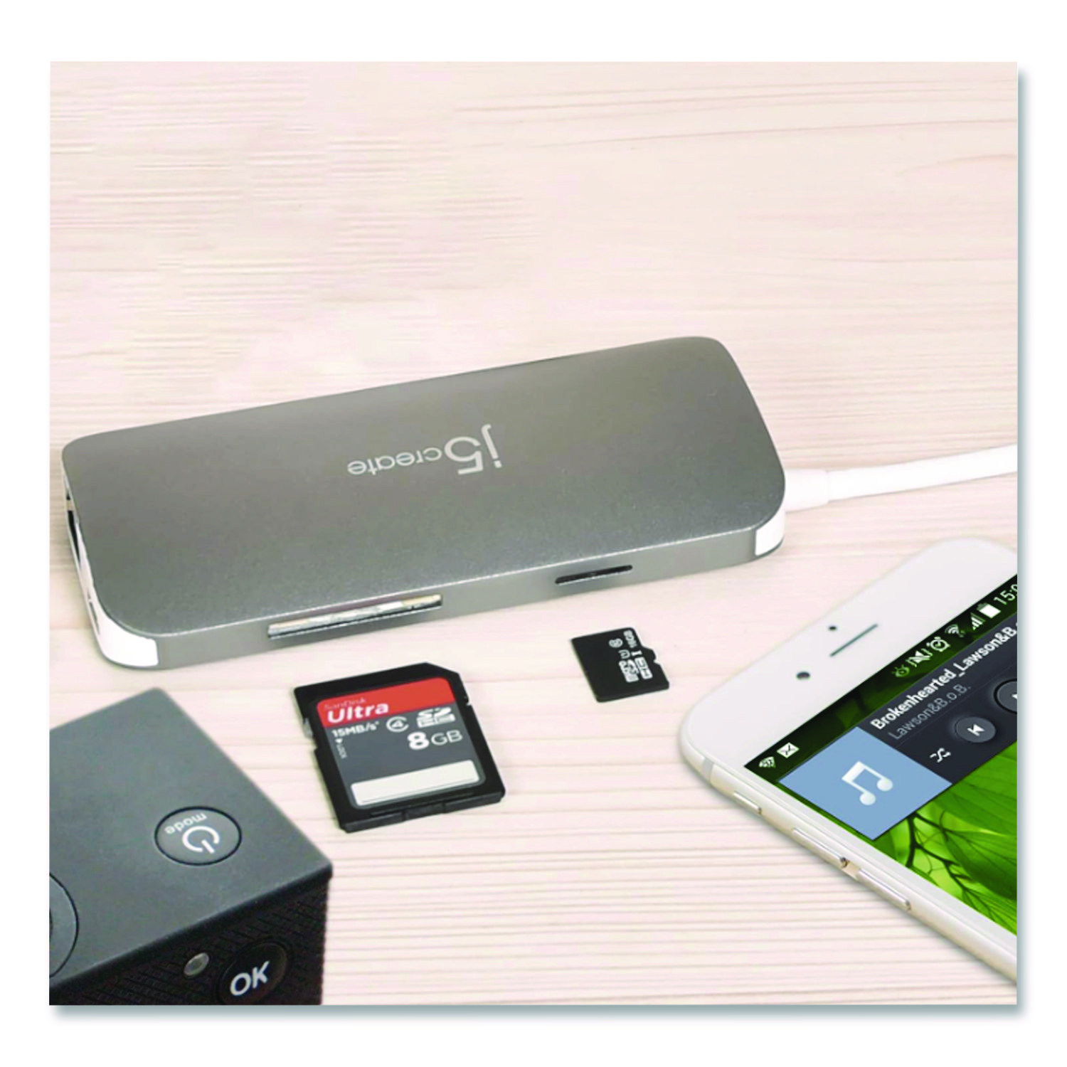 Transfer data at up to 5 Gbps with this multiport adapter. The HDMI output supports 4K resolution, and the microSD slot offers external storage. This j5create® USB type-C multiport adapter features a Gigabit Ethernet port for prompt network connectivity. Cable Type: USB-C to Multiport Adapter; Connector/Port/Interface: USB-C (Male); HDMI/RJ-45/USB (Female)/2 USB 3.0 (Female)/USB 3.0 BC 1.2 (Female)/USB 3.0 SD Slot/USB 3.0 microSD Slot; For Device Type: Computers; Smartphones; Tablets; Jacket Color: Gray/White.