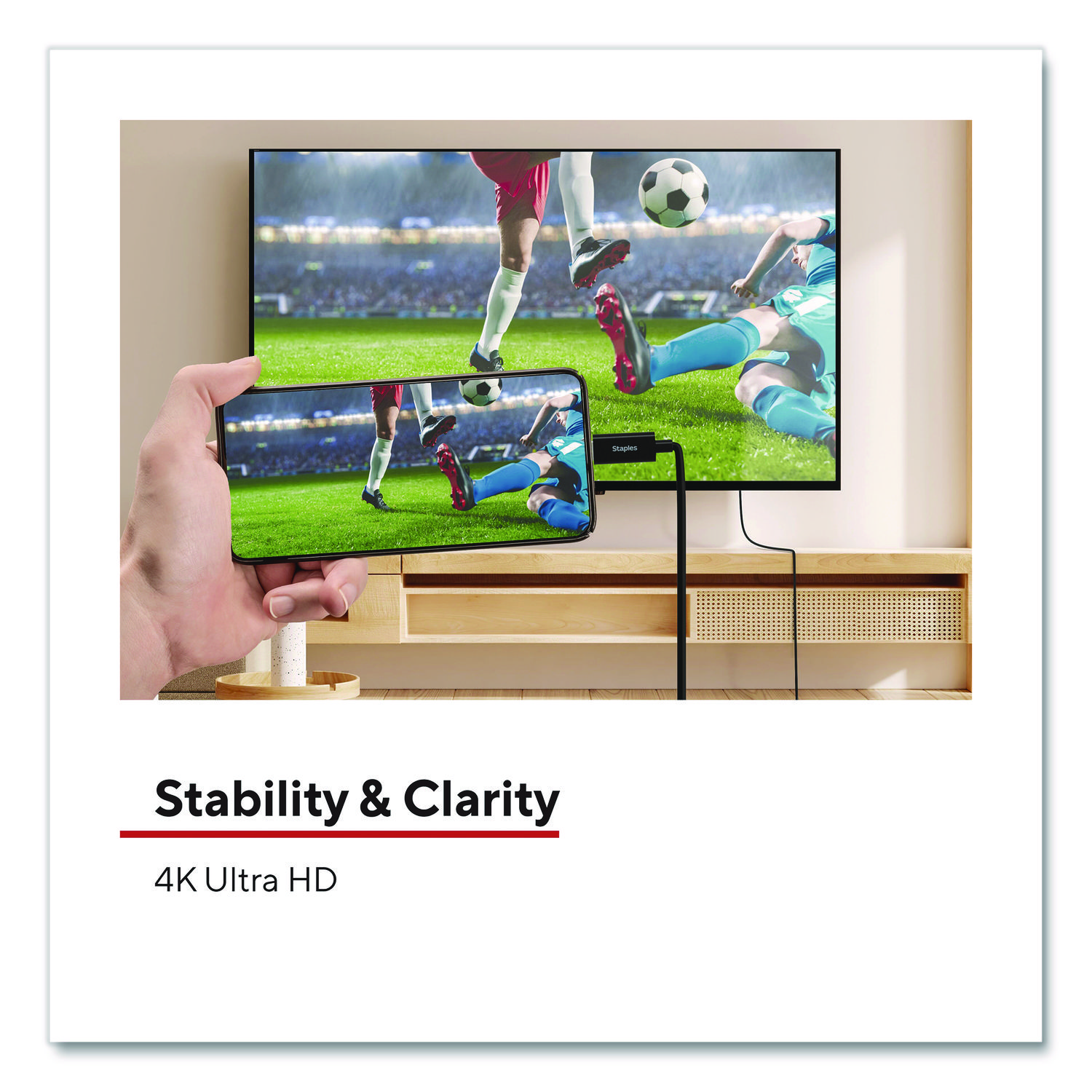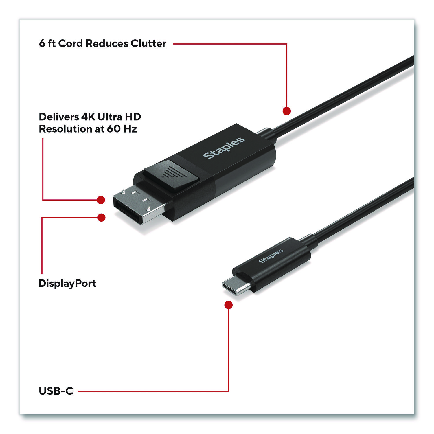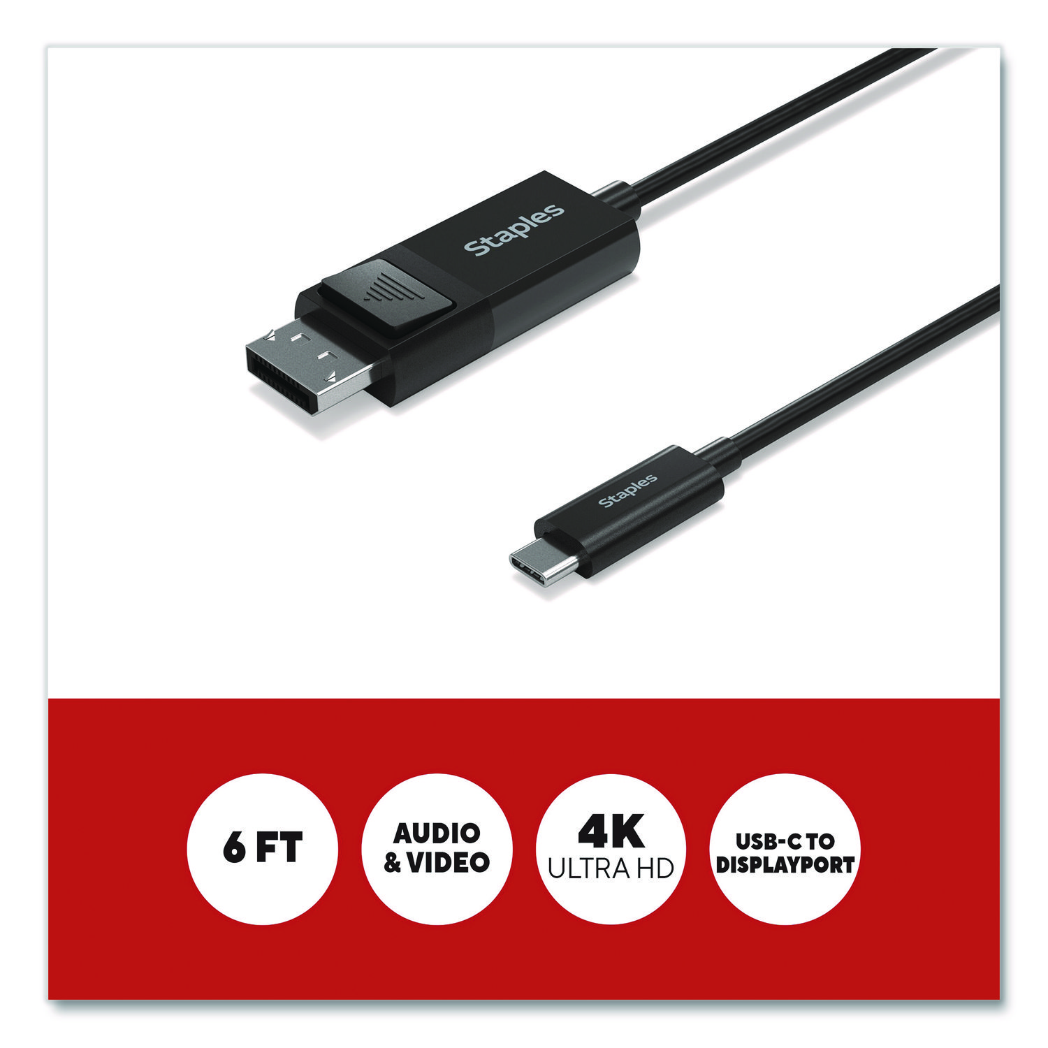 For work or entertainment an extra display often comes in handy. With the Staples TECH USB-C to DisplayPort cable, you can connect additional monitors, displays, gaming consoles, projectors and more. Delivering crisp 4K Ultra HD resolution this cable promises clear audio and video for an exceptional experience. It provides ample length to connect devices across your workspace while also reducing cord clutter. This cable is the perfect choice for outfitting your work, gaming or entertainment space. Enjoy high resolution audio and video so you can upgrade your home or office workspace and do your best work. Cable Type: USB Cable; Connector/Port/Interface: USB-C Male; DisplayPort Male; Cable Length: 6 ft; Jacket Color: Black.