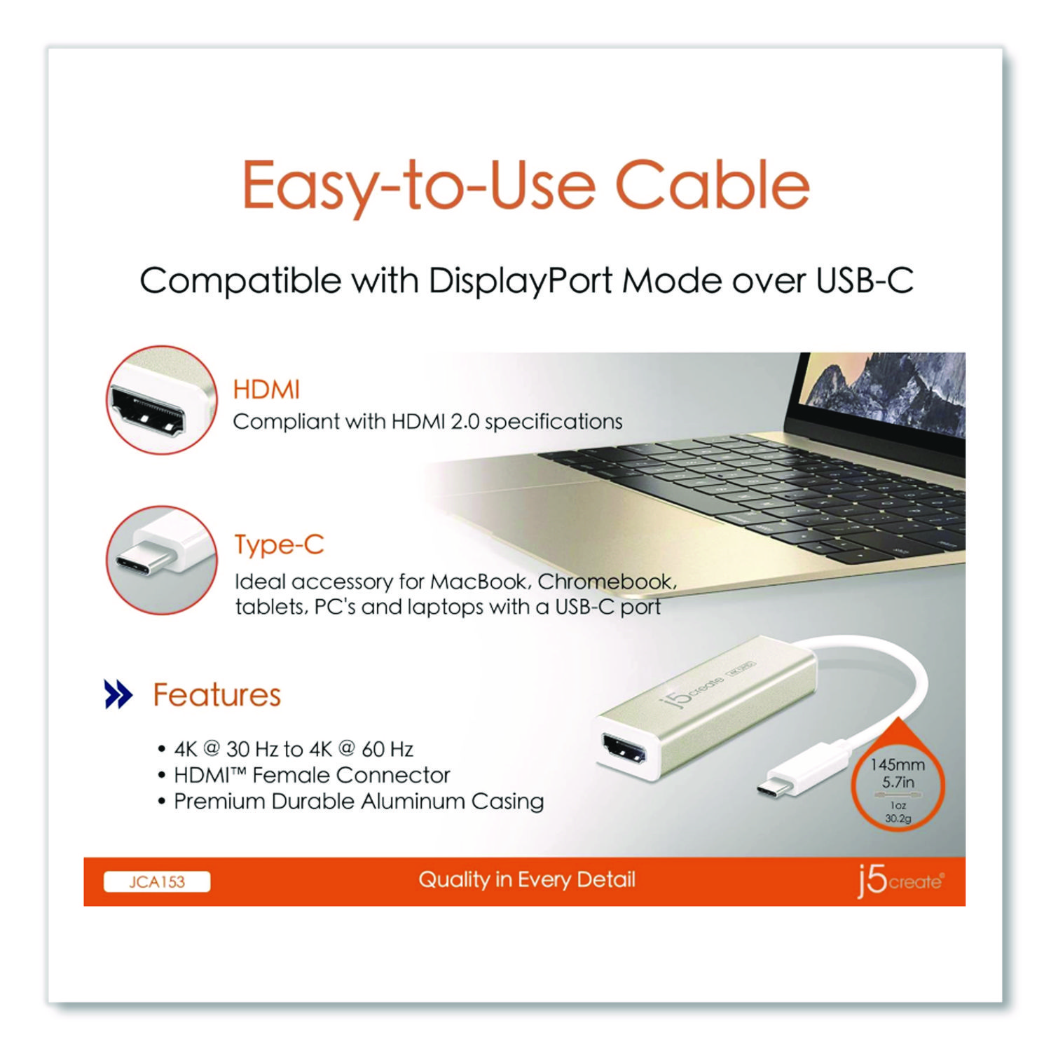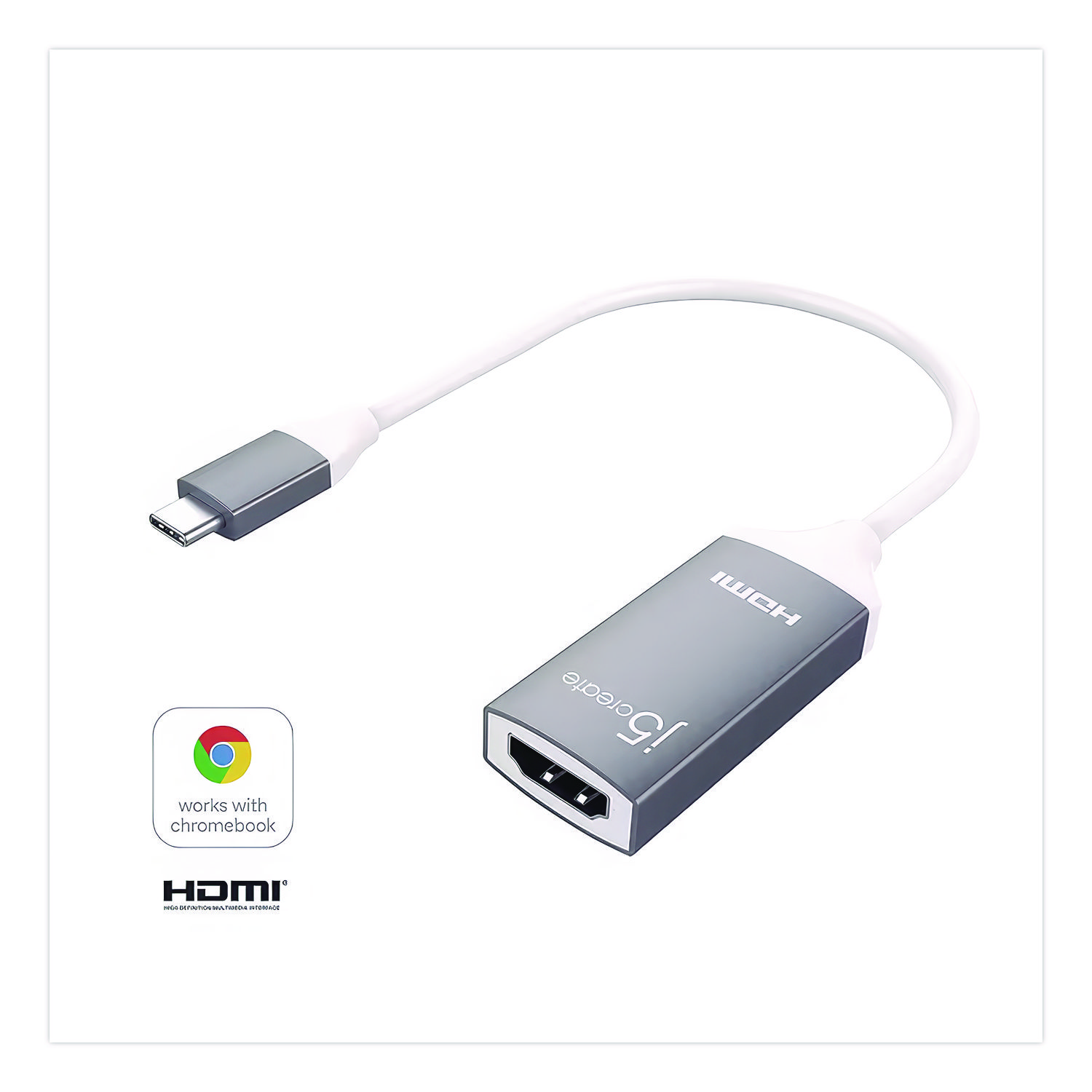 Double productivity by connecting your laptop to an external monitor with this USB Type-C to 4K HDMI adapter. Plug-and-play technology takes the guesswork out of installation, while the robust aluminum housing ensures durability. This j5create® USB Type-C to 4K HDMI adapter comes with an HDMI female connector for convenience. Cable Type: USB-C to HDMI Adapter; Connector/Port/Interface: USB-C (Male); HDMI (Female); For Device Type: Computers; Smartphones; Tablets; Cable Length: 5.71″.