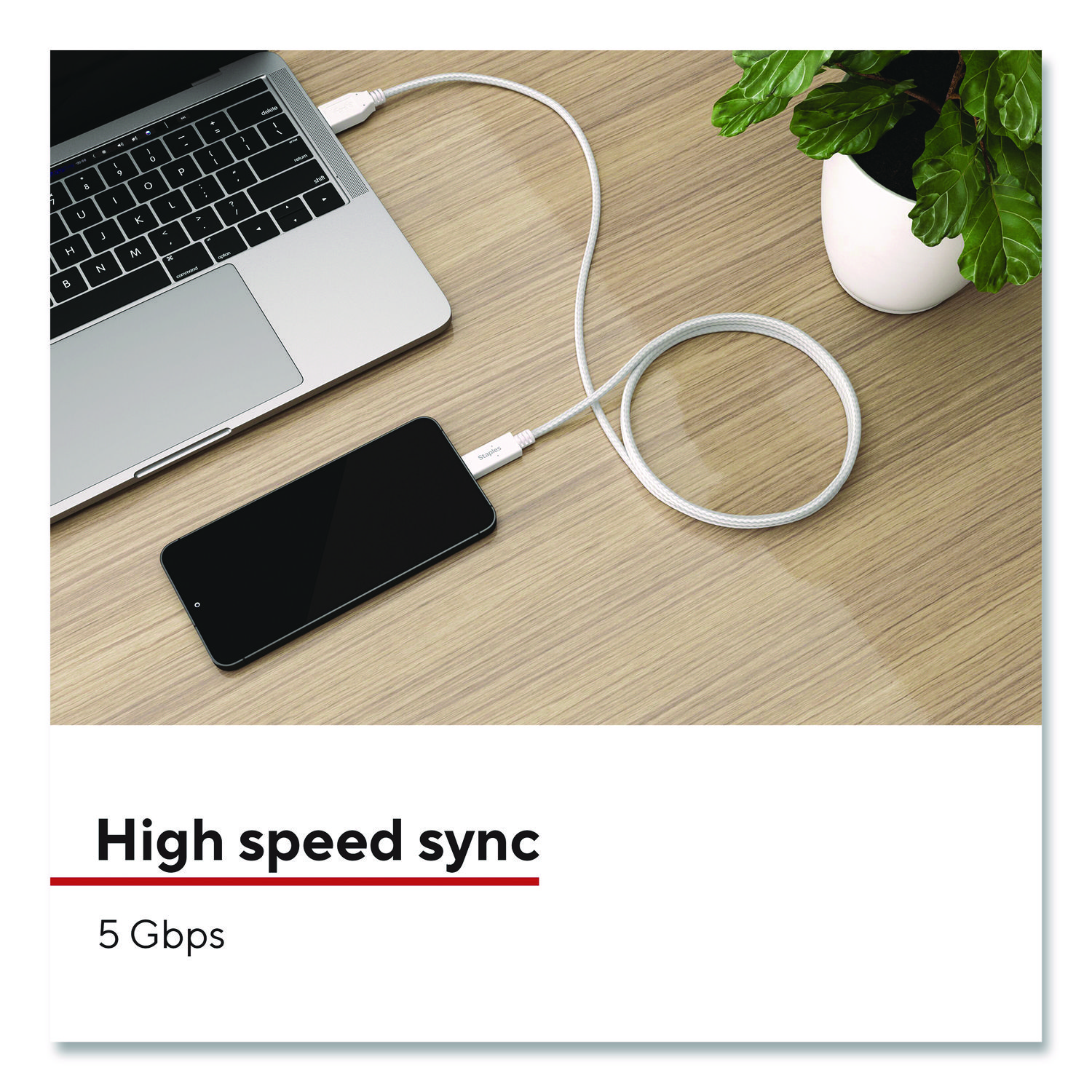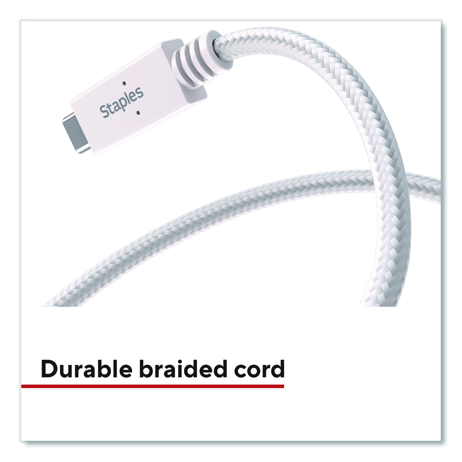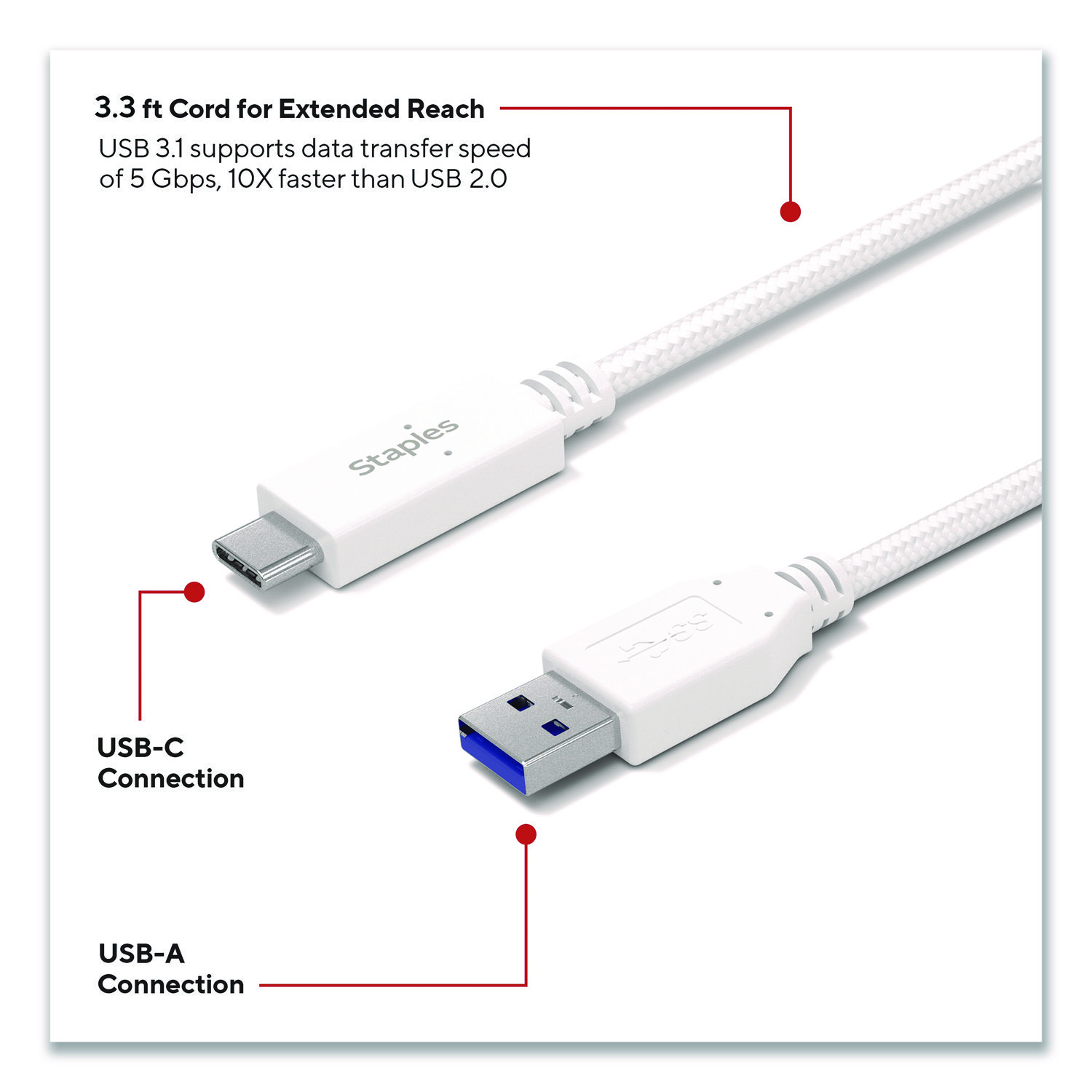 Power your smartphones and tablets with this durable StaplesĀ® USB-C to USB-A Braided Cable. This USB 3.1 cable can transfer data at speeds up to 5 Gbps. The unique braided design of this charging cable provides extra durability, prevents tangles. The cable length gives extra reach when needed and is perfect for comfortably using devices while they charge. For Device Type: Mobile Devices; Adapter/Charger Type: Charging Cable; Connector/Port/Interface: USB-A; USB-C; Color(s): 3.3 ft.