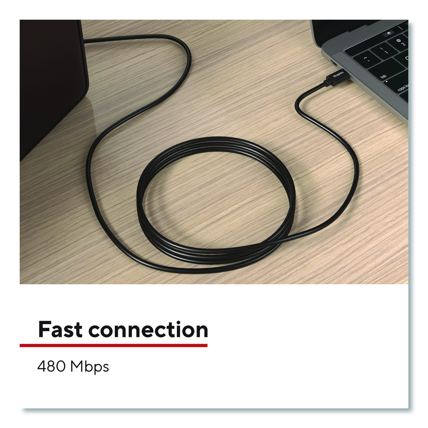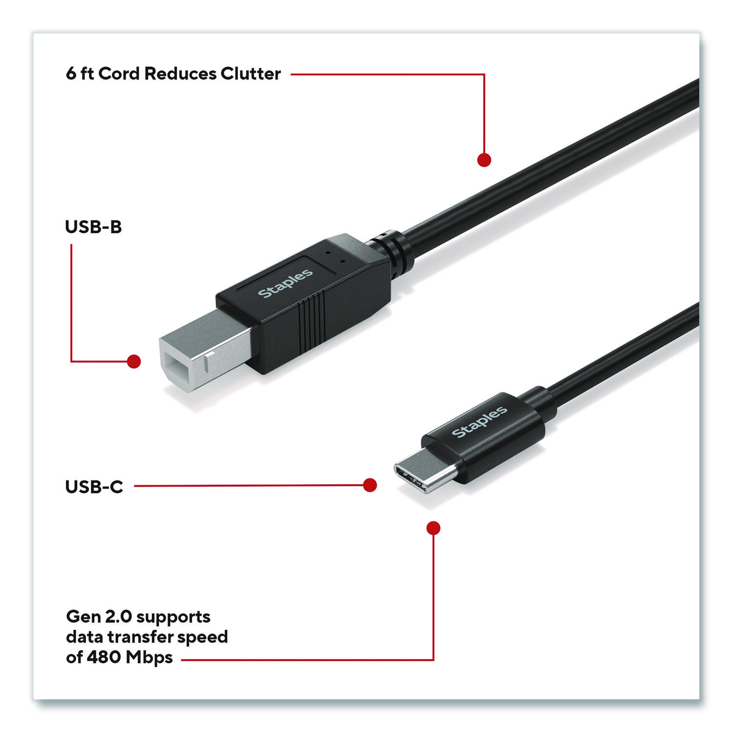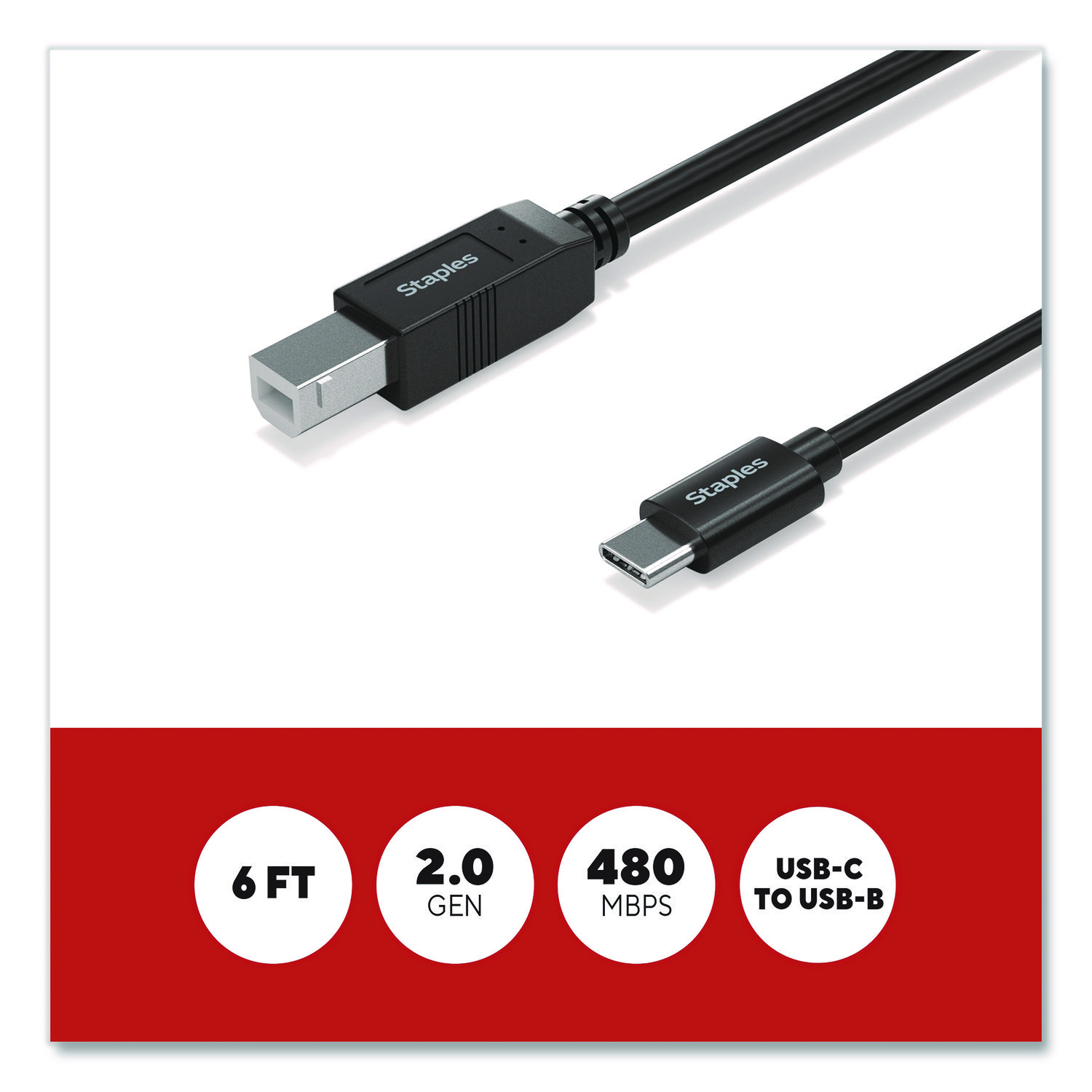 Connect peripheral devices like printers, copiers, external drivers and more with the Staples TECH USB-C to USB-B cable. It is compact to reduce cord clutter, and the USB 2.0 boasts fast data transfer speeds up to 480 Mbps. Keep your workday running smoothly with the Staples TECH USB-C to USB-B cable. Cable Type: USB 2.0 Cable; Connector/Port/Interface: USB-C Male; USB-B Male; Cable Length: 6 ft; Jacket Color: Black.