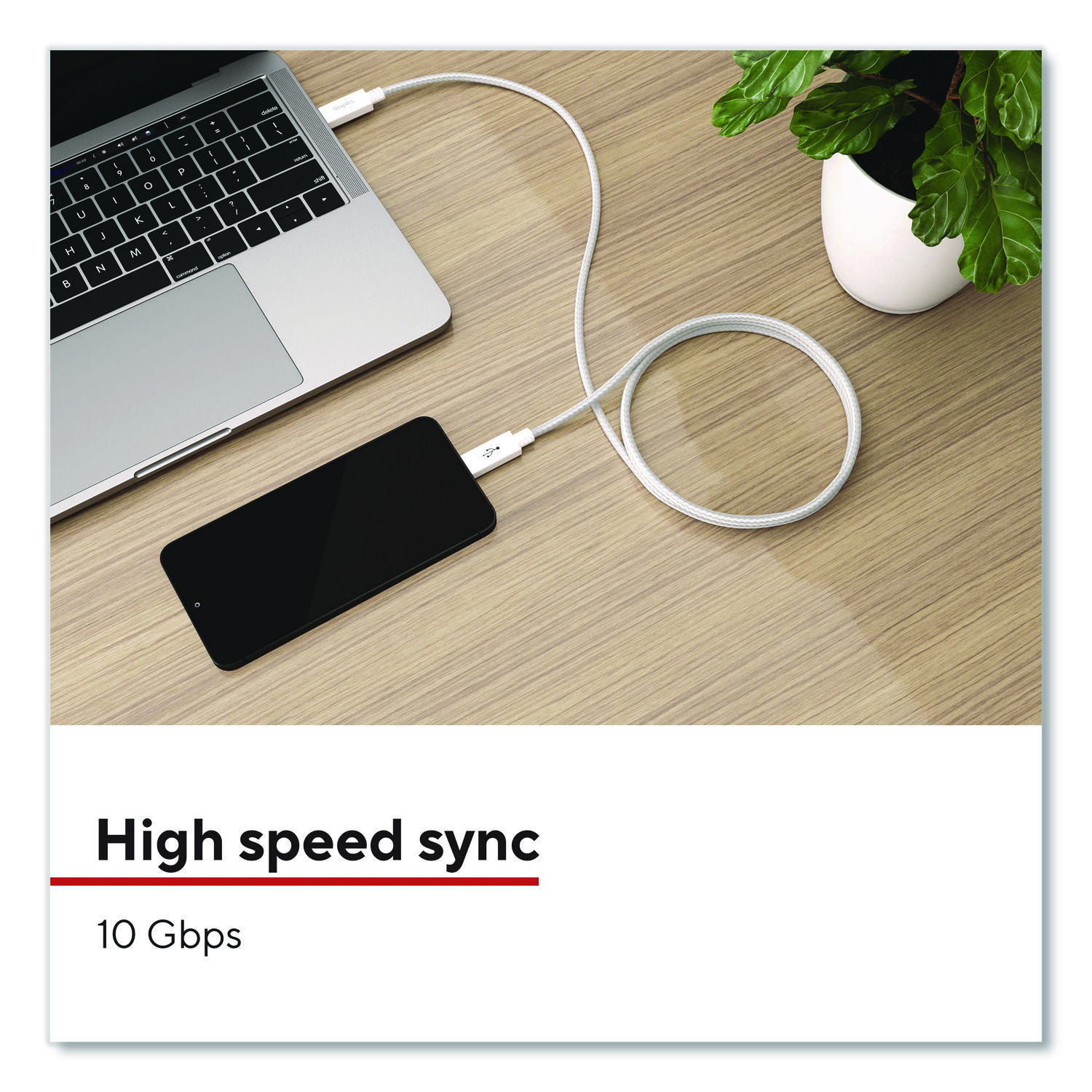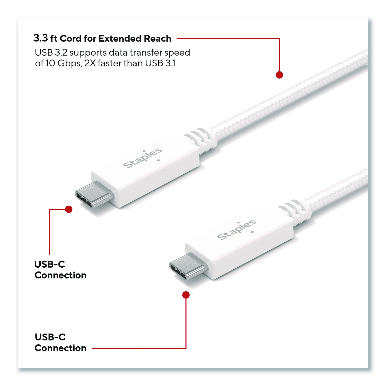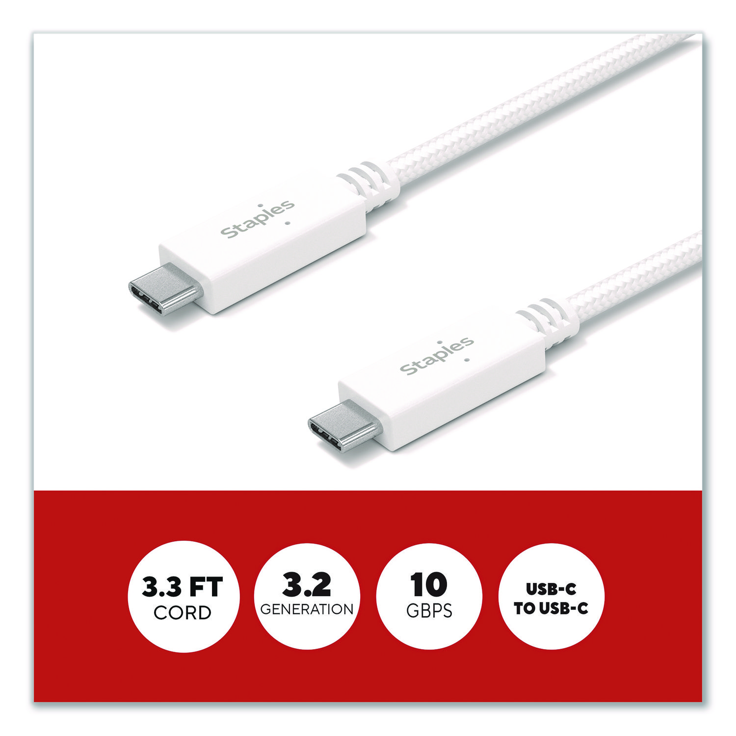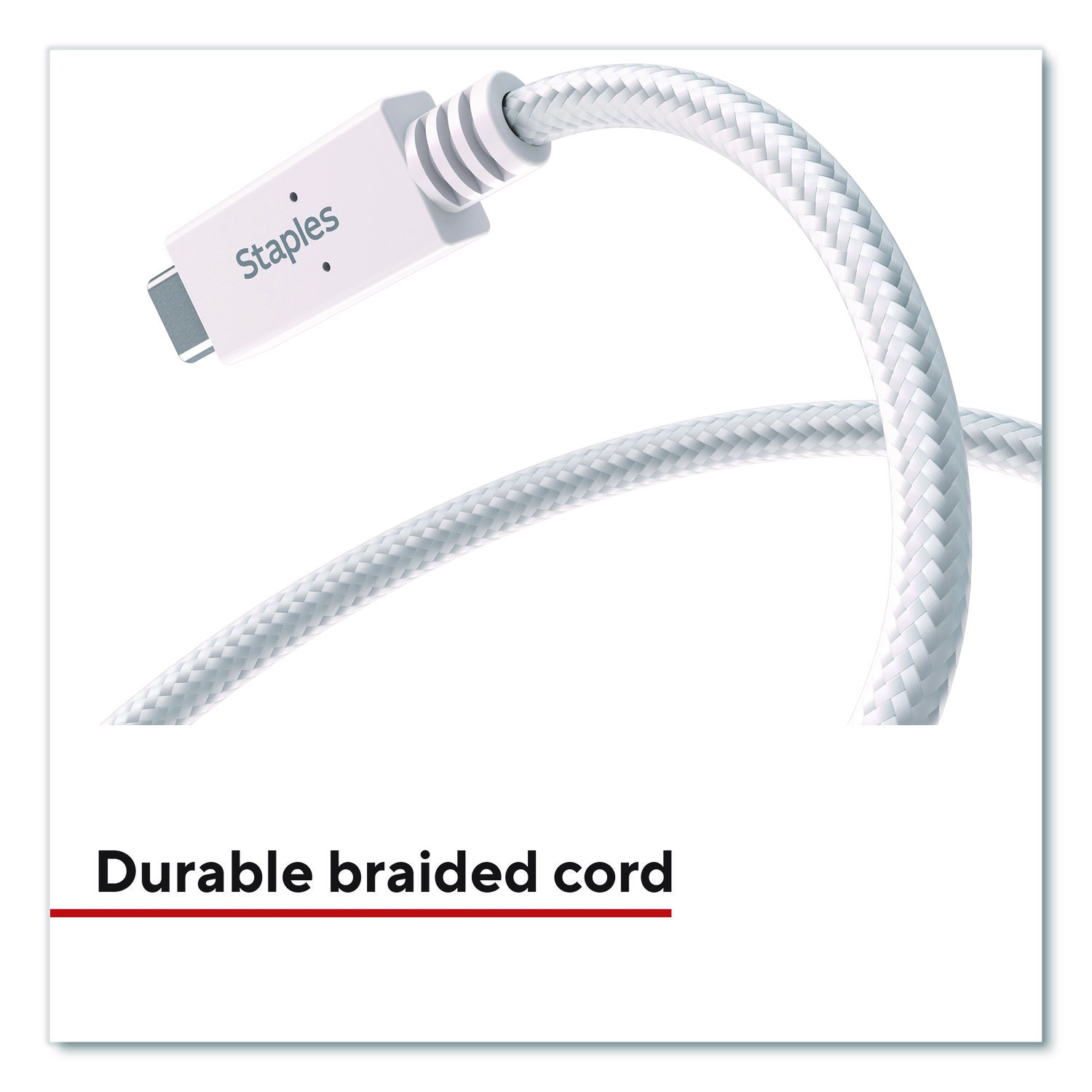 Power your smartphones and tablets with this durable USB 3.2 StaplesĀ® USB-C to USB-C Braided Cable that can transfer data at 10 Gbps. The unique braided design provides extra durability, prevents tangles. The cable length gives extra reach when needed and is perfect for comfortably using devices while they charge. For Device Type: Mobile Devices; Adapter/Charger Type: Charging Cable; Connector/Port/Interface: USB-C; Color(s): White.