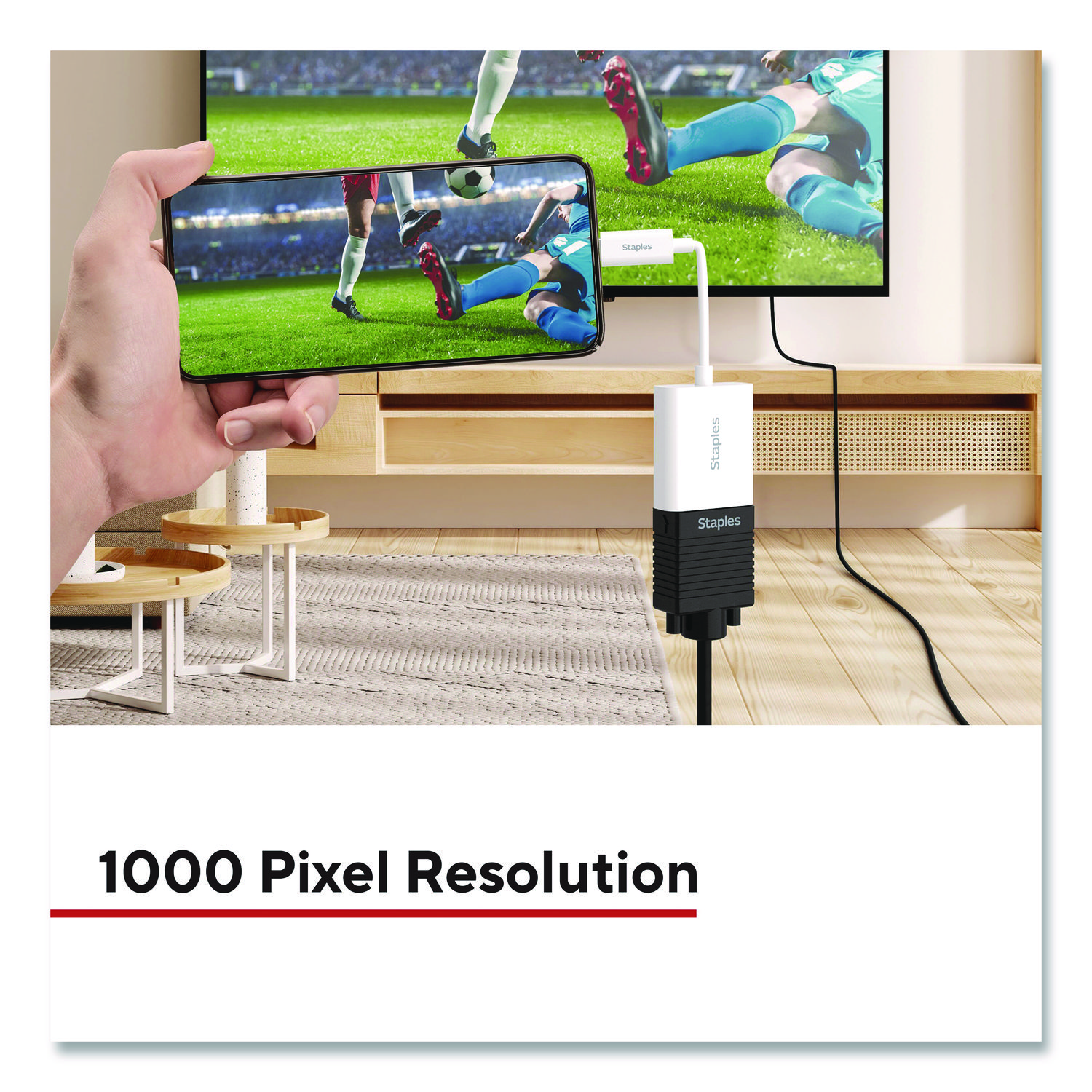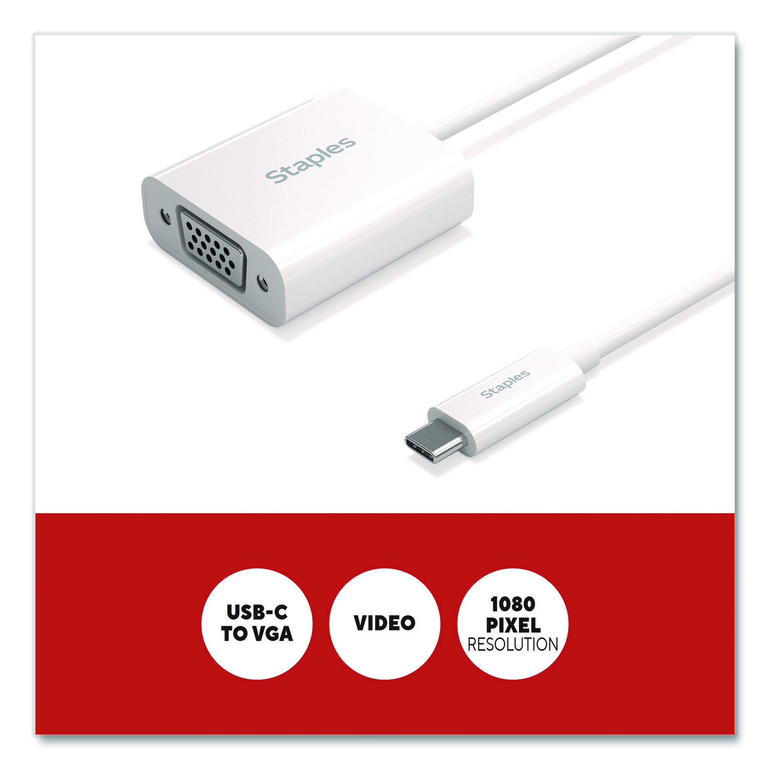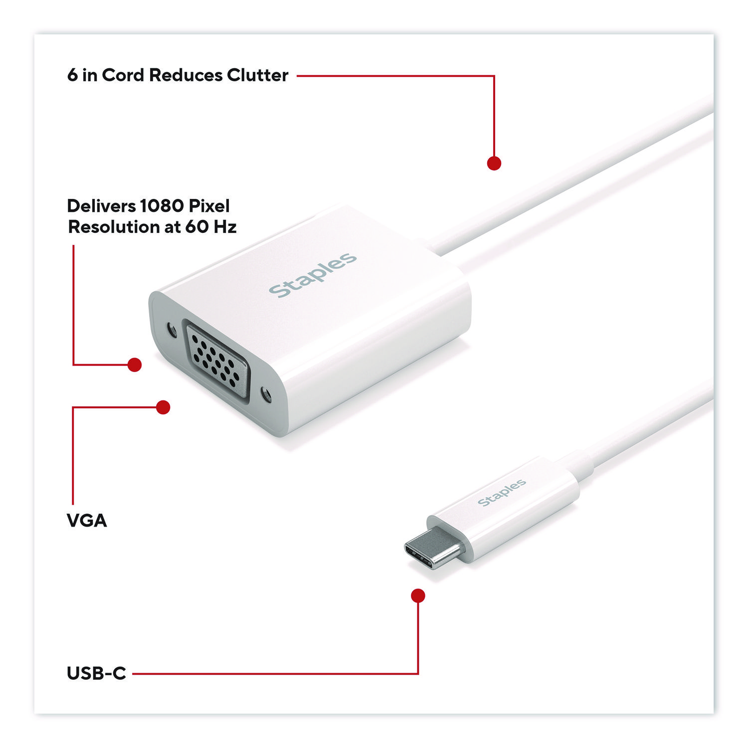 For work or entertainment, an extra display often comes in handy. With the Staples TECH USB-C to VGA adapter, you can convert a USB-C output to an VGA input to connect additional displays, gaming consoles, projectors and more. Delivering 1920 x 1800 pixel resolution, this adapter promises quality video for a seamless experience. Featuring a compact 6″ cord, this adapter will keep your space clutter free. This adapter is the perfect choice for outfitting your personal or office workspace. Enjoy seamless connectivity between previously incompatible devices so you can upgrade your home or office workspace and do your best work. Cable Type: USB-C to VGA; Connector/Port/Interface: USB-C; VGA; For Device Type: USB-C Devices; Cable Length: 6″.