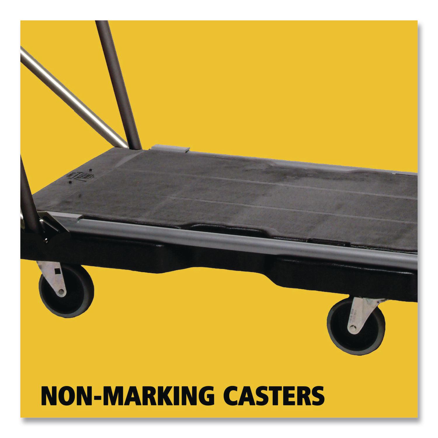 Efficiently transports large bulky loads and then folds flat for easy storage. Sturdy structural foam deck won’t rust, dent, chip or peel. Non-skid platform surface helps prevent load shifting. Tough plastic construction is easy on walls and doors. Three position straight handle lets users push, pull or fold flat for use as a dolly. Casters are non-marking. Color(s): Black; Color Family: Black; Overall Dimensions: 20.5 x 32.5; Material(s): HDPE.
