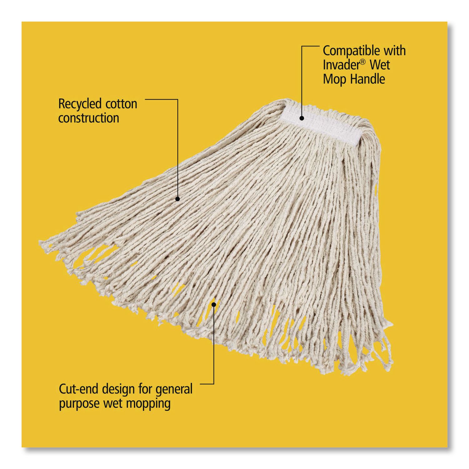 Wash high-traffic areas efficiently with this general-purpose mop head. The cotton has dependable liquid absorption properties, and the 1″ cloth headband ensures a secure grip to the handle. Cut-end tailband prevents tangling, increases floor coverage and is hand washable. Mop Head Type: Wet Mop; Application: Floor Maintenance; Mop Head Style: Cut End; Mop Head Size: Large.