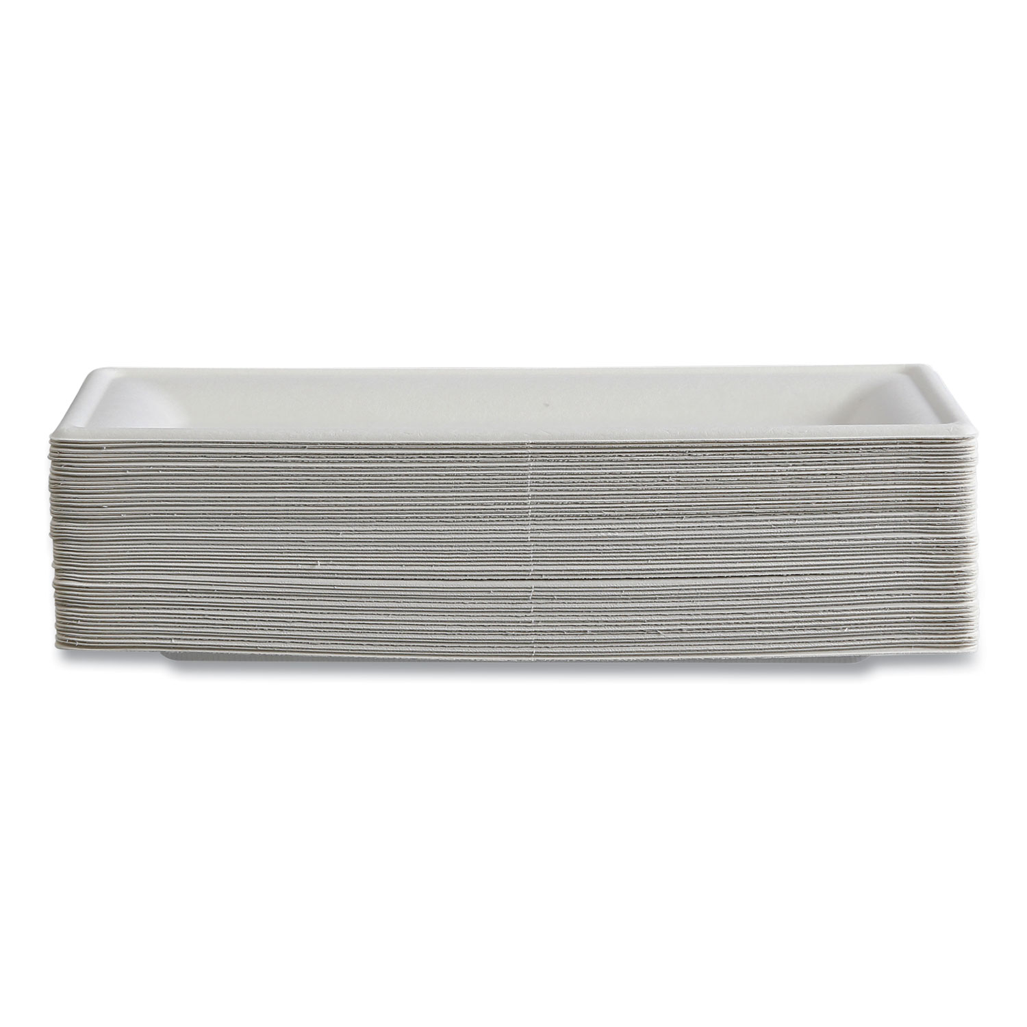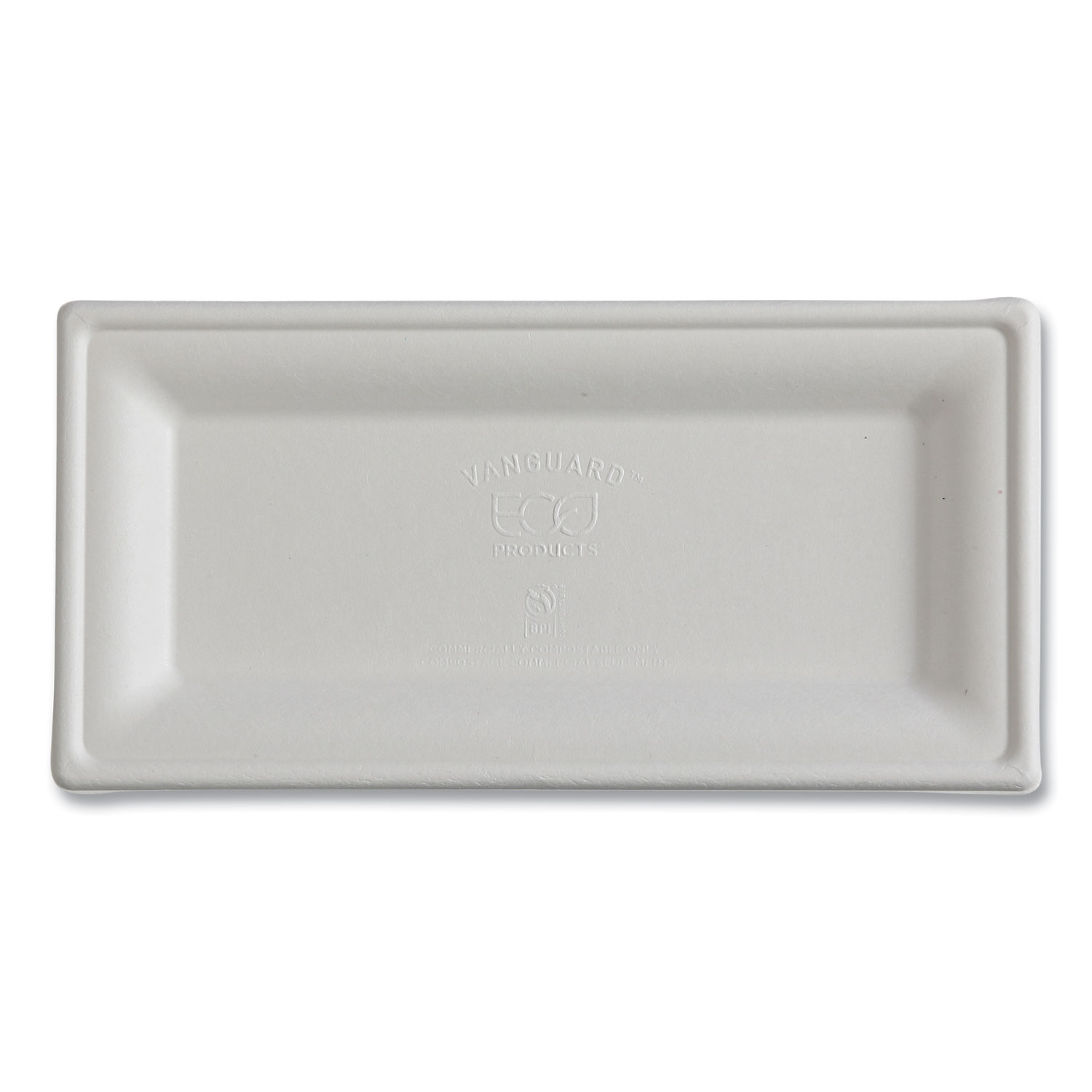 Eco-Products award-winning new line, Vanguard, is a collection of groundbreaking molded fiber containers. Vanguard products use FDA-approved proprietary alternative compounds to achieve grease-resistance performance, without relying on conventional PFAS (Per- and polyfluoroalkyl substances). Made from reclaimed and rapidly renewable sugarcane fibers, these products are compostable in commercial facilities only, which may not exist in your area. Disposable plates are both hot and cold food friendly and microwave safe. Dinnerware Type: Plate; Material Type: Sugarcane; Material(s): Molded Fiber; Shape: Rectangle.