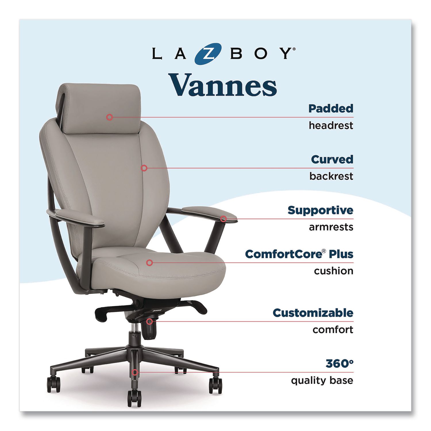 Upholstered in a plush, smooth fabric and standing out from the crowd with its stylish, contemporary design, the La-Z-Boy® Vannes Ergonomic Executive Chair goes well beyond what most would expect from an office chair. Optimized to deliver all-day seated comfort, zone-based ComfortCore® Plus seat employs several layers of cushioning to deliver firmer support in the back and softer support up front, while a contoured, ergonomically designed backrest, padded headrest, supportive armrests and an intuitive control layout keep you poised for what each day might bring. Recommended Application Area(s): Executive & Management; General Office & Task; Seat Color: Light Gray; Back Color: Light Gray; Color Family: Gray.