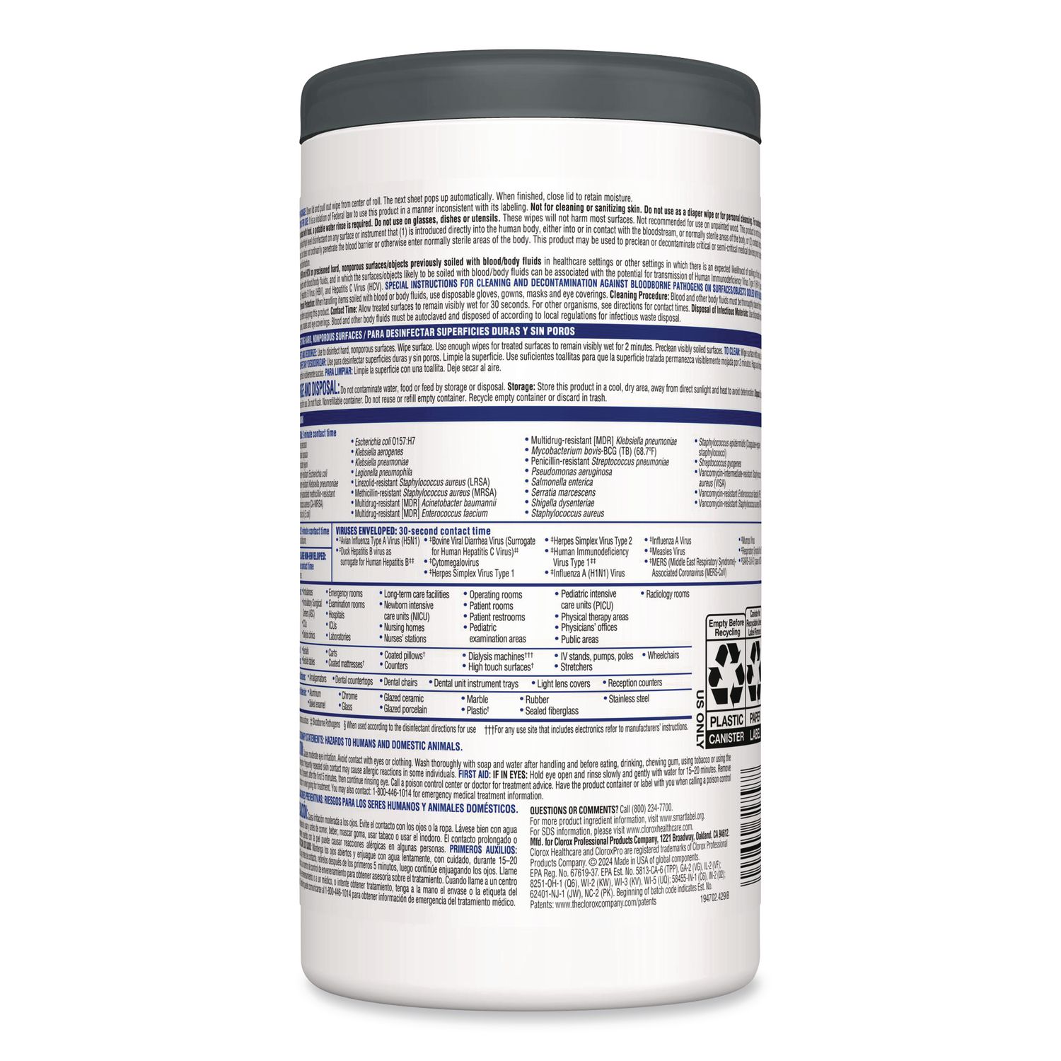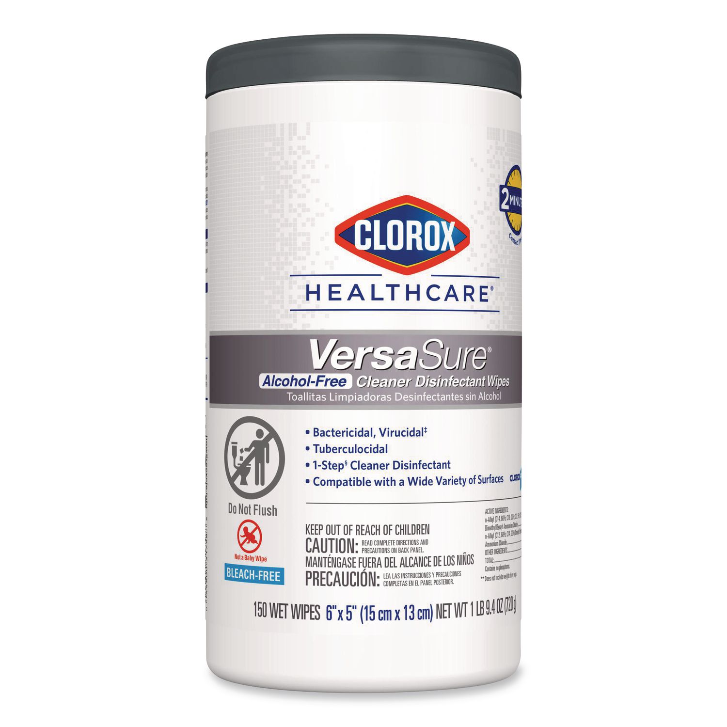 Clorox Healthcare® VersaSure Cleaner™ Disinfectant Wipes kill over 40 pathogens quickly on a broad range of surfaces. These strong and durable clothlike wipes are your alcohol-free solution to cleaning and disinfecting. VersaSure wipes are EPA registered to kill pathogens on hard surfaces in as fast as 30 seconds for most bacteria and viruses, including mumps, measles, MRSA and tuberculosis. These one step disinfecting wipes meet EPA efficacy testing requirements for hospital disinfection, making them great for daily use in your healthcare facility. Designed for patient and staff comfort, the alcohol free quat formula is made with no harsh chemical odors, fumes or added fragrances. The nonwoven wipe does not leave lint on surfaces, and the larger wipe covers more surface area with less effort. Intended for use in healthcare settings. Towel/Wipe Type: Cleaning/Disinfecting Wipes; Applicable Material: Aluminum; Baked Enamel; Brass; Chrome; Copper; Corian; Finished Wood; Formica; Galvanized Steel; Glass; Glazed Porcelain; Laminate; Linoleum; Marble; Metal; Naugahyde; Painted Metal; Painted Wood; Plastic; Plastic Laminate; Plexiglass; Porcelain Enamel; Rubber; Sealed Fiberglass; Sealed Granite; Sealed Wood; Silver; Stainless Steel; Synthetic Marble; Treated Wood; Vinyl Tile; Wood; Material(s): Nonwoven Fiber; Chemical Compound: Ethanolamine; Quaternary Ammonium Compounds, C12-14-Alkyl[(Ethylphenyl )Methyl]Dimethyl, Chlorides; Quaternary Ammonium Compounds, C12-18-Alkyl[(Ethylphenyl )Methyl]Dimethyl, Chlorides.