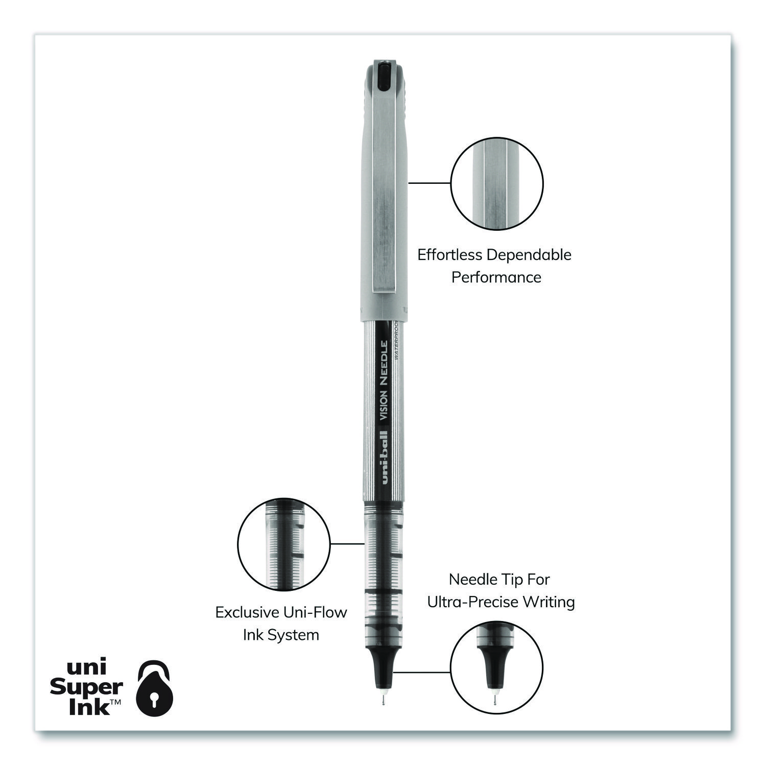 Stock your office, home or classroom with Vision Needle Stick Rollerball Pens from uni-ball featuring a strong, long lasting 0.7 mm fine point. These needle point pens are designed with a bend resistant tip for better accuracy. Even-flowing, pigment-based roller ink delivers a smooth writing experience for reliably smooth, vivid lines and a rich color for improved clarity and readability. Use these fine point rollerball pens to create perfect letters, numbers and graphics. Innovative uni Super Ink technology effectively entraps the liquid ink into the paper, producing fraud, fade and water-resistant documents that resist check washing or bleaching. The 0.7mm fine needle point allows you to create ultra-precise, straight edge lines with ease. The exclusive Uni-Flow Ink System ensures a consistent, delightfully fluid writing experience, and a translucent window ensures that you don’t run out of ink unexpectedly. Enjoy beautiful clean lines and give all of your ideas a burst of brilliant color with this classic style fine point rollerball pen. Pen Sub-Brand & Product Family: VISION Needle™; Pen Type: Rollerball Pen; Pen Style: Stick; Pen Tip Type: Needle.