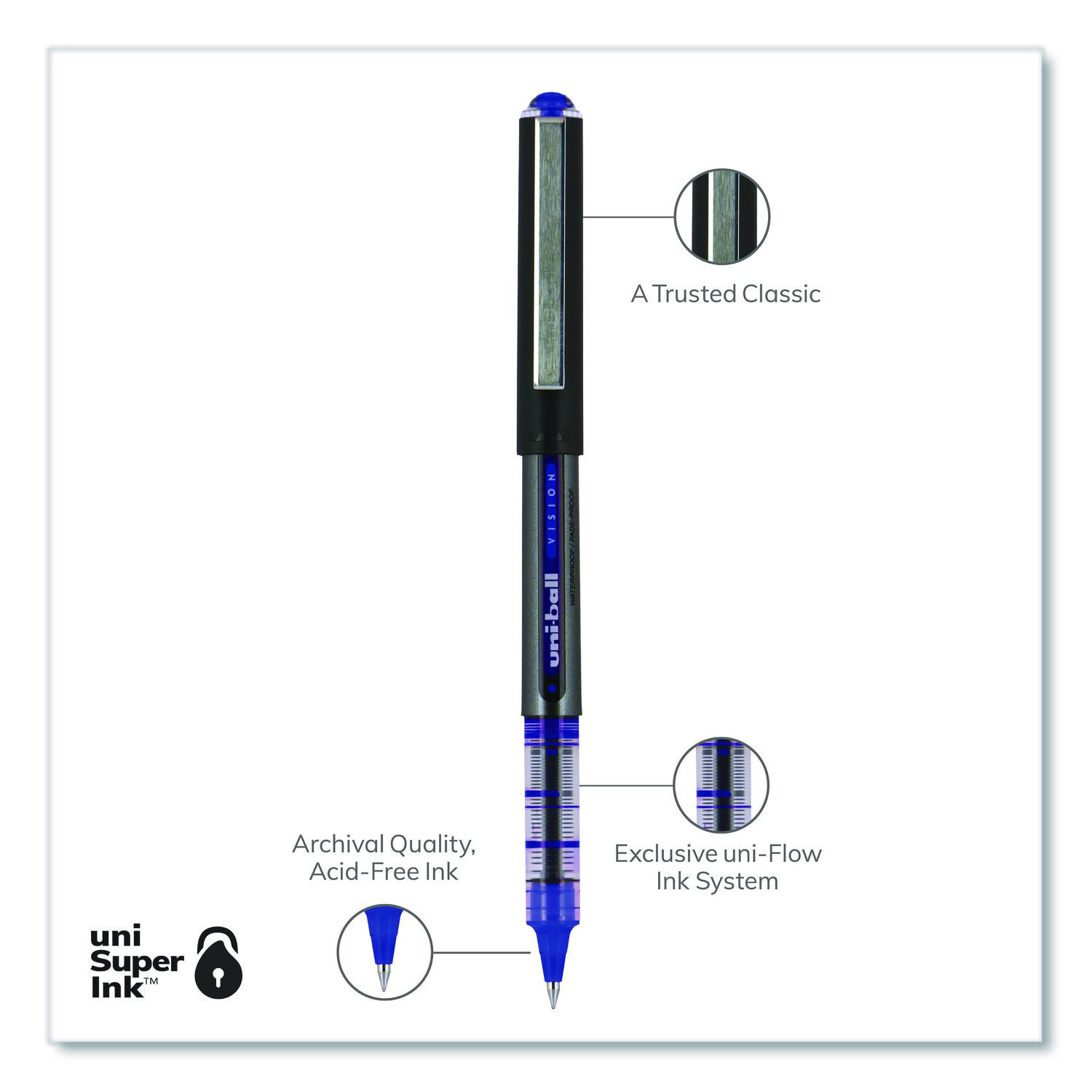 Make your everyday writing easy with the effortless and dependable performance of Vision Rollerball Pens from uni-ball featuring strong, long lasting tips. Capped roller pens deliver an even liquid ink lay-down for reliably smooth, vivid lines and a rich color for improved clarity and readability. Great for all writing tasks from taking notes to record keeping with archival quality, acid free roller ink. Innovative uni Super Ink technology forms an indestructible bond with the paper to minimize the risk of check washing or document fraud, while also protecting from water and fading. The exclusive Uni-Flow Ink System ensures a consistent, delightfully fluid writing experience, and a translucent window ensures that you don’t run out of ink unexpectedly. Enjoy beautiful clean lines and give all of your ideas a burst of brilliant color with this classic style rollerball pen. Pen Sub-Brand & Product Family: VISION; Pen Type: Rollerball Pen; Pen Style: Stick; Pen Tip Type: Conical.