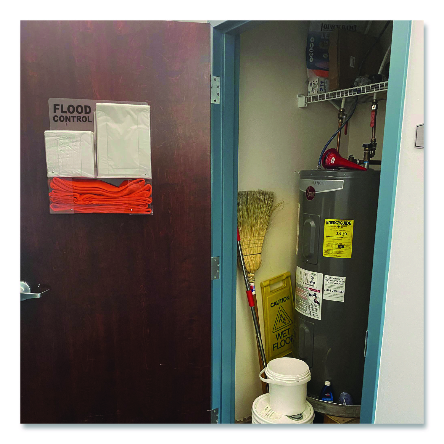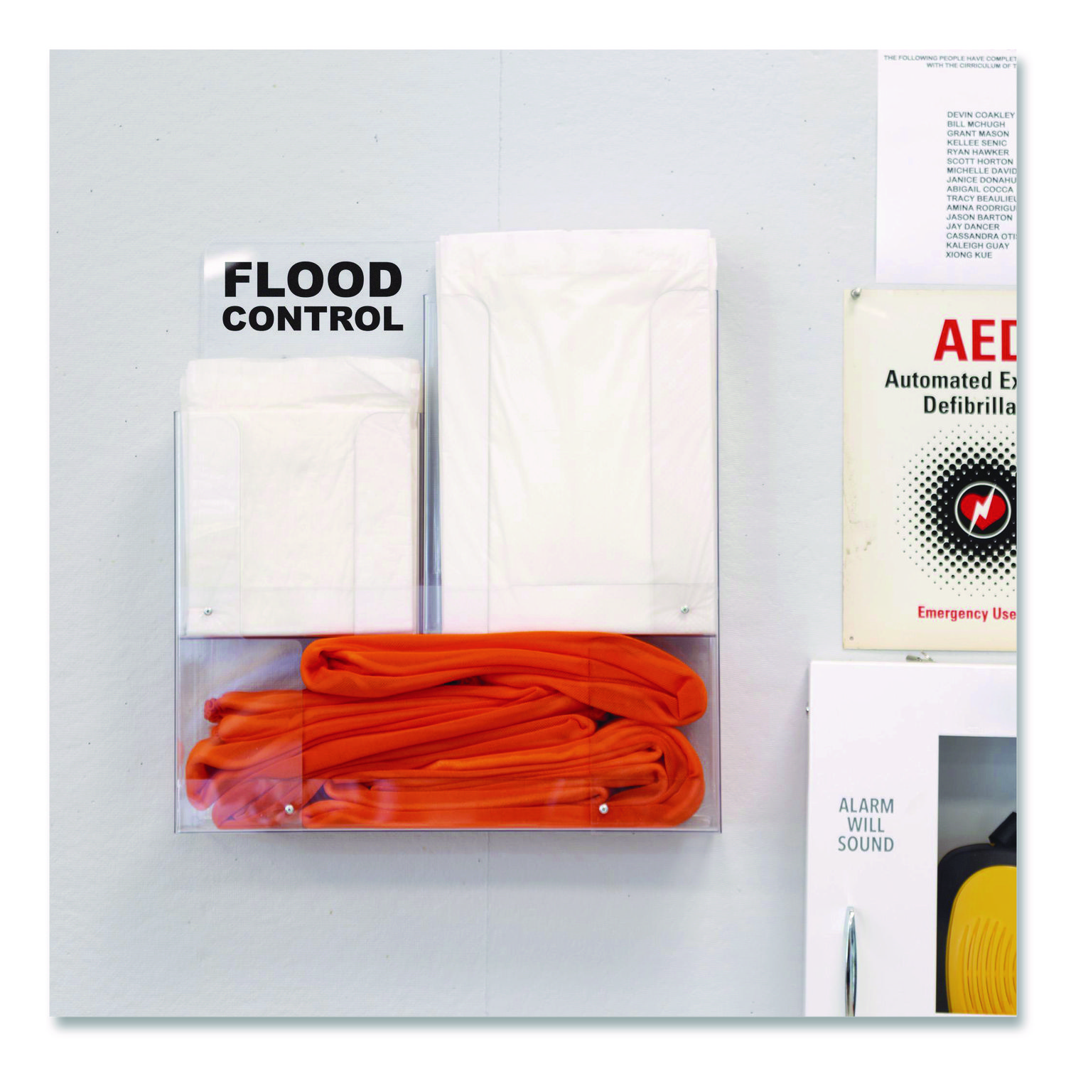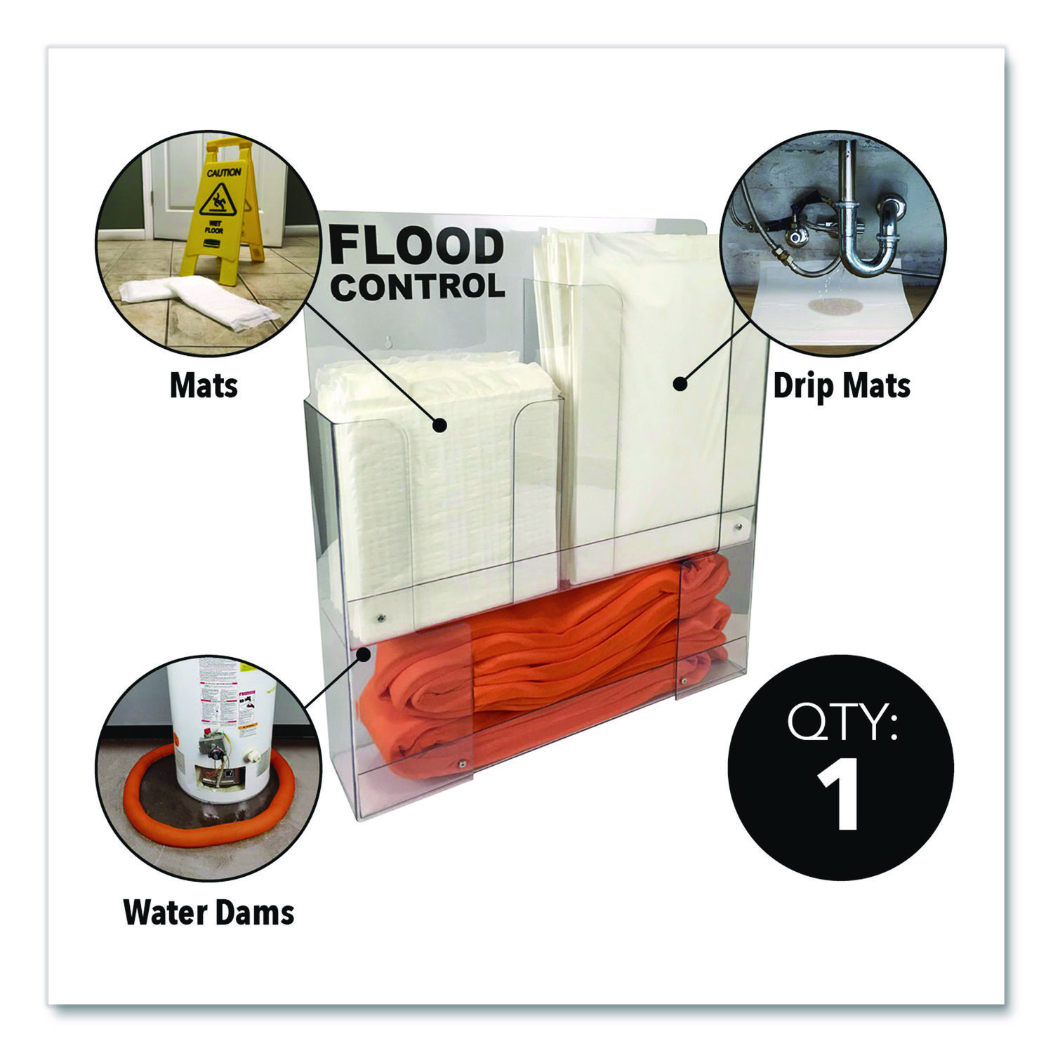 Protect your hospital, educational facility or property against leaks and spills with Quick Dam Wall Rack indoor flood control. Mount to any wall and mitigate slips and falls by soaking up any nuisance water issue. Clearly marked with flood control, easy to deploy solutions will keep your facility prepared for any water issue. Refillable. Height: 20″; Length: 17″; Width: 5″; Color(s): Clear.